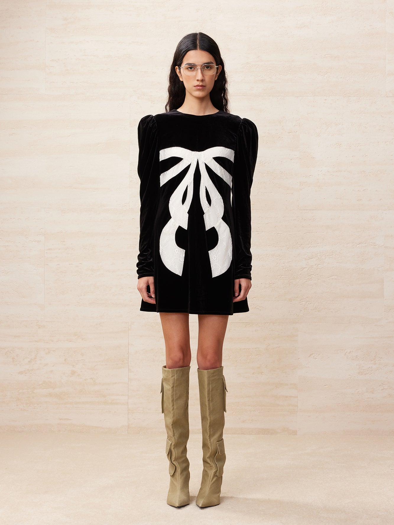 Lace bowknot spliced velvet minidress