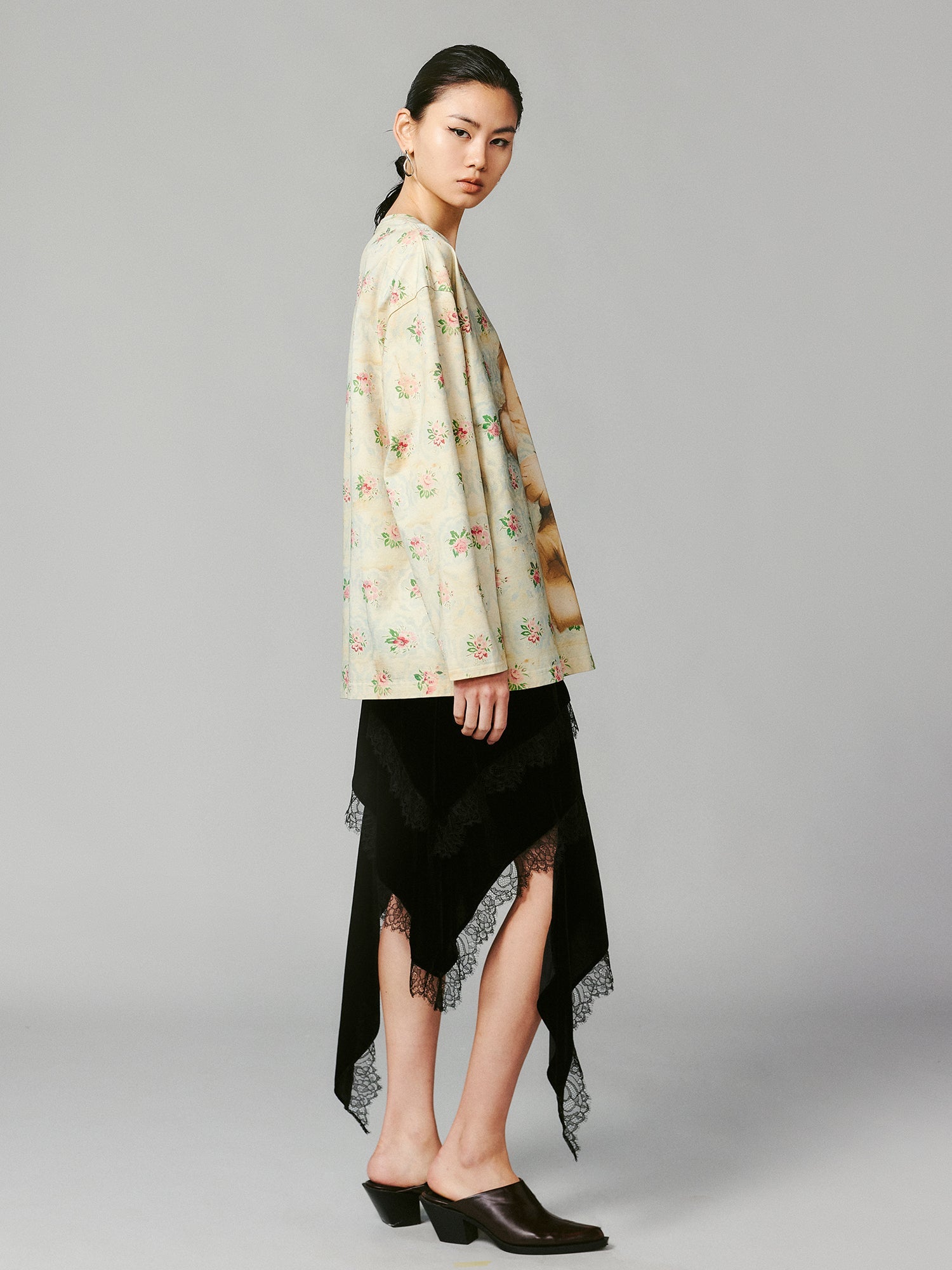 Vintage anime girl satin jacquard asymmetrical placket mandarin collar shirt