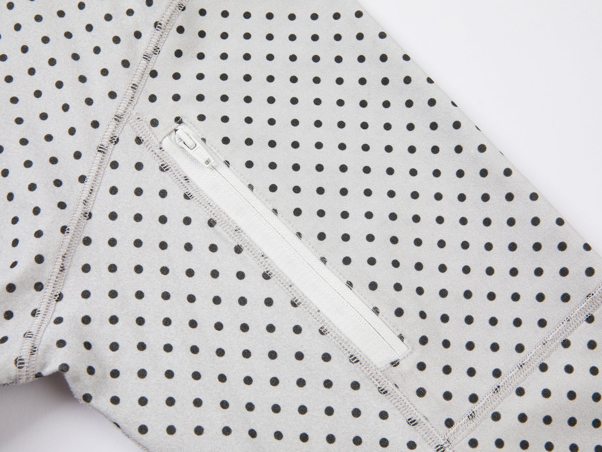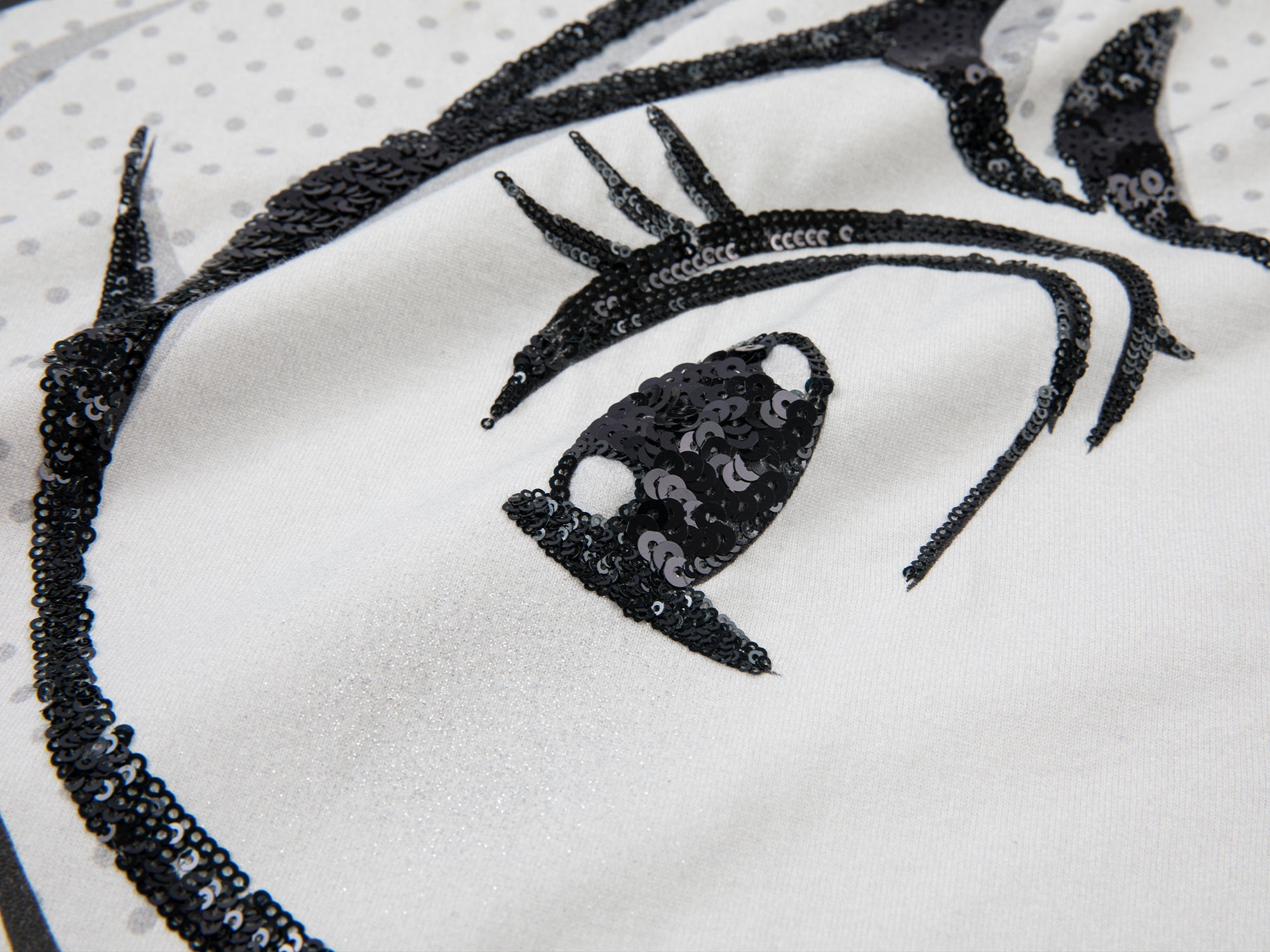 このデザインは、ドット、線、対照的な色などのポップアートの技法を使用し、スパンコールの装飾で強調することで、漫画の女の子の表情を強調し、活気に満ちた若々しいエネルギーを醸し出します。