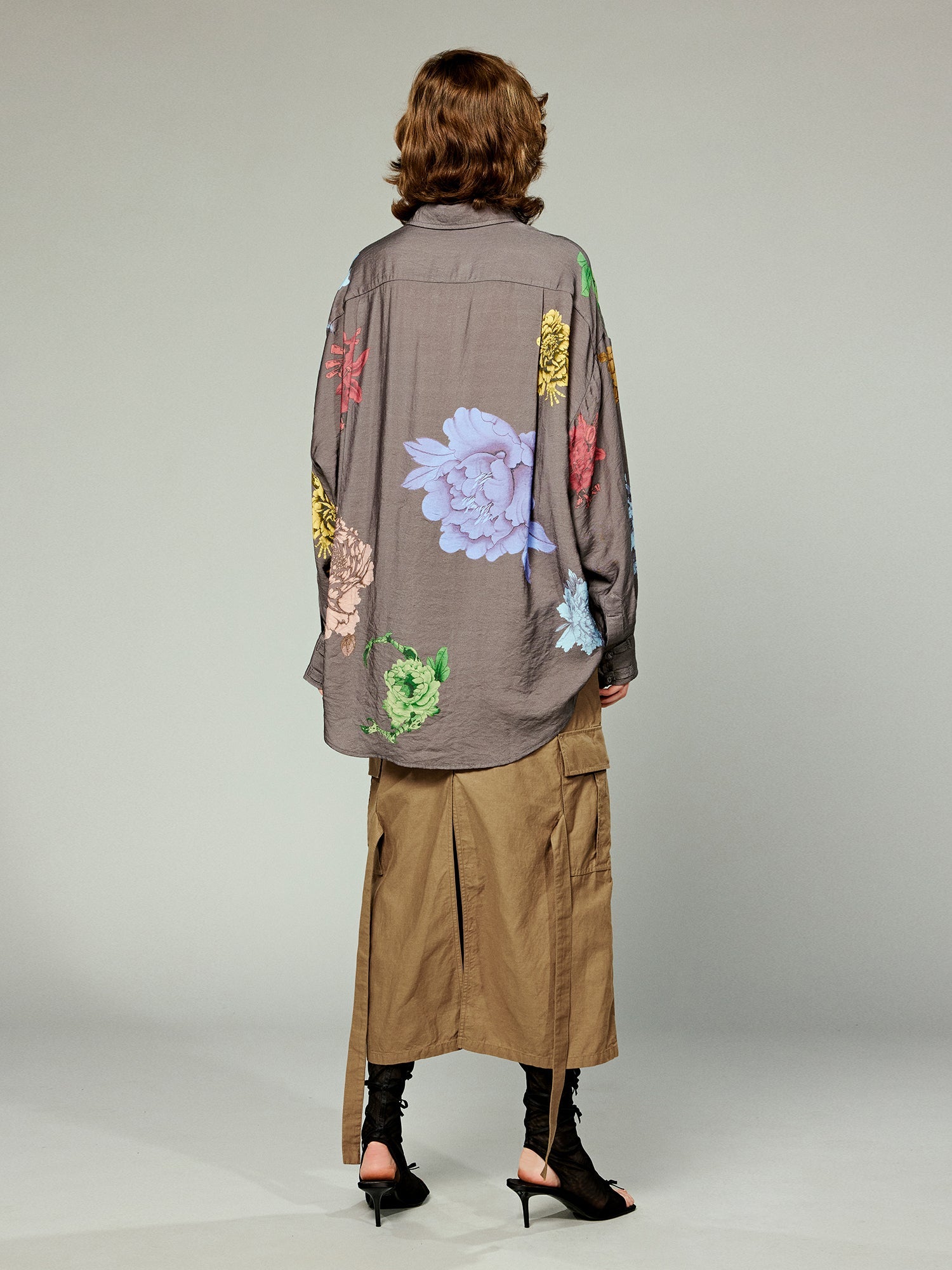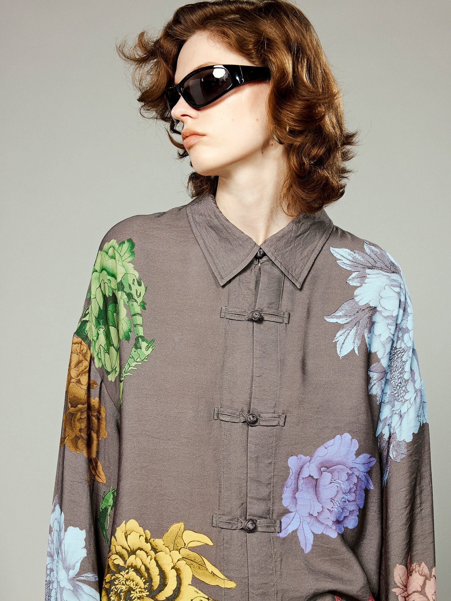 芸術的で遊び心のあるモンスターフラワーチャイナ風シャツ
