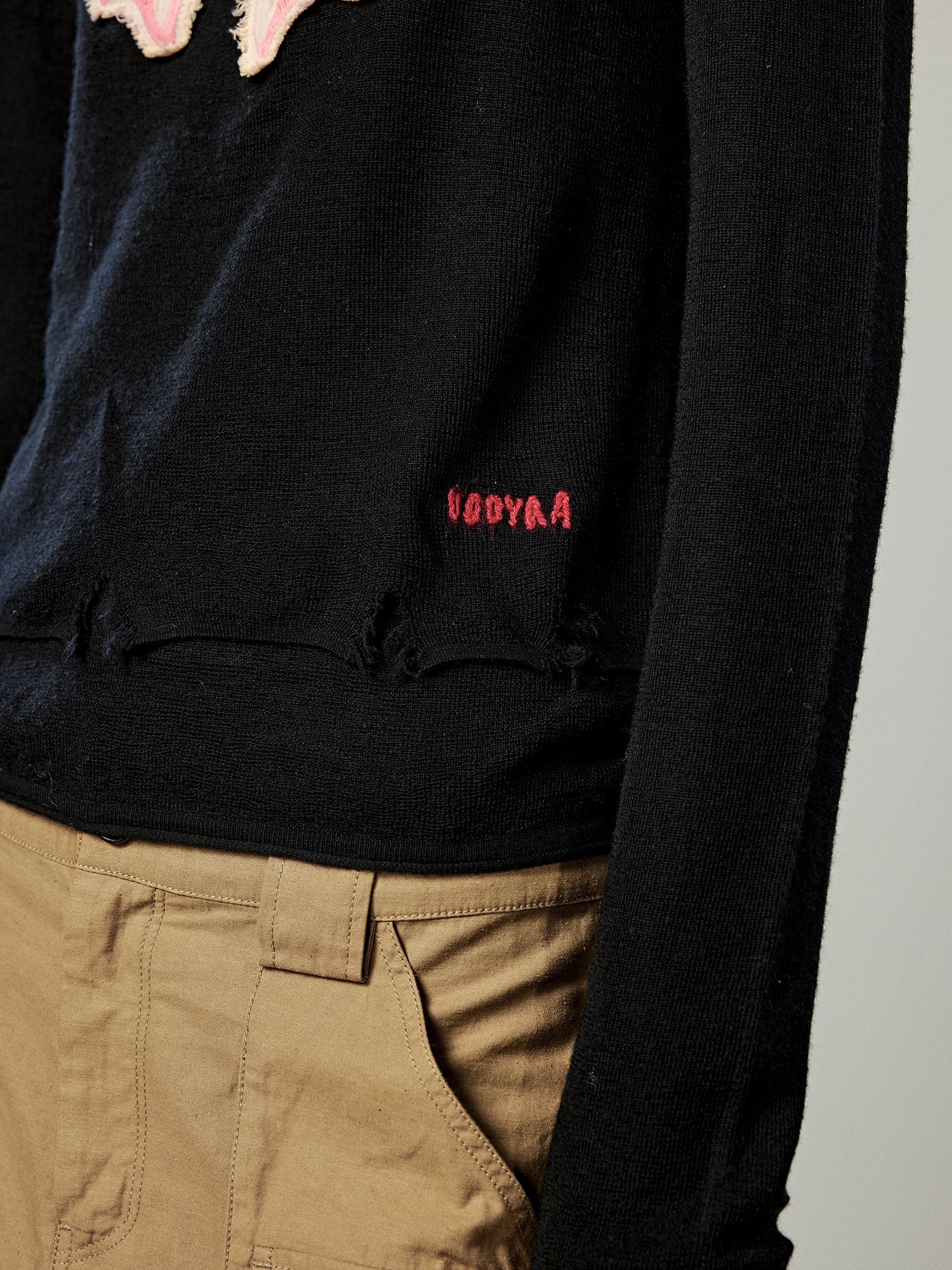 3D のピンクのリボンと、ダメージ加工やほつれ加工のディテールが組み合わさり、遊び心がありながらも気負わないカジュアルな印象を演出します。