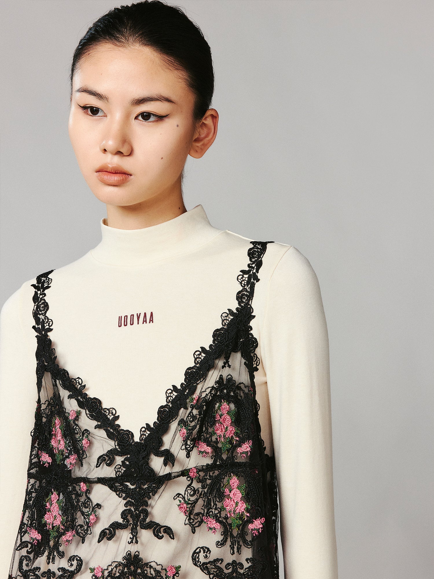 全体に複雑な壁紙の花柄刺繍が施された、A ラインのレース メッシュ キャミソール ドレス。ロマンチックで遊び心があり、リラックスした着こなしが楽しめる万能なドレスです。