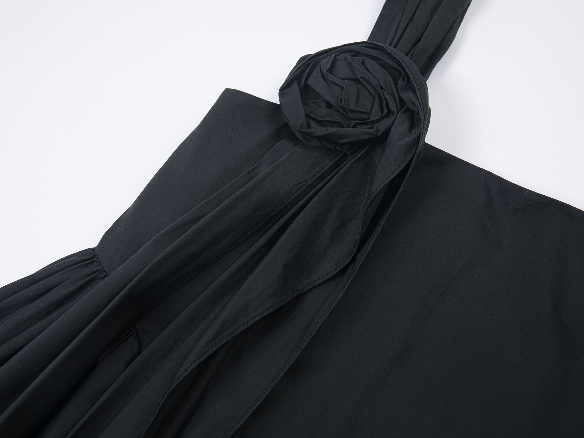 ギャザーの入った裾と胸元の3Dフラワーディテールが特徴で、実用的なサイドポケットと裏地が付いています。