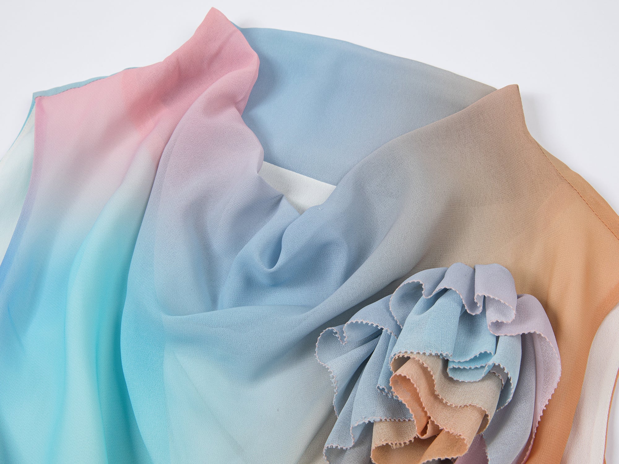 透け感のあるシフォンに、花柄のアップリケを重ねました。柔らかな動きと繊細な魅力を演出します。