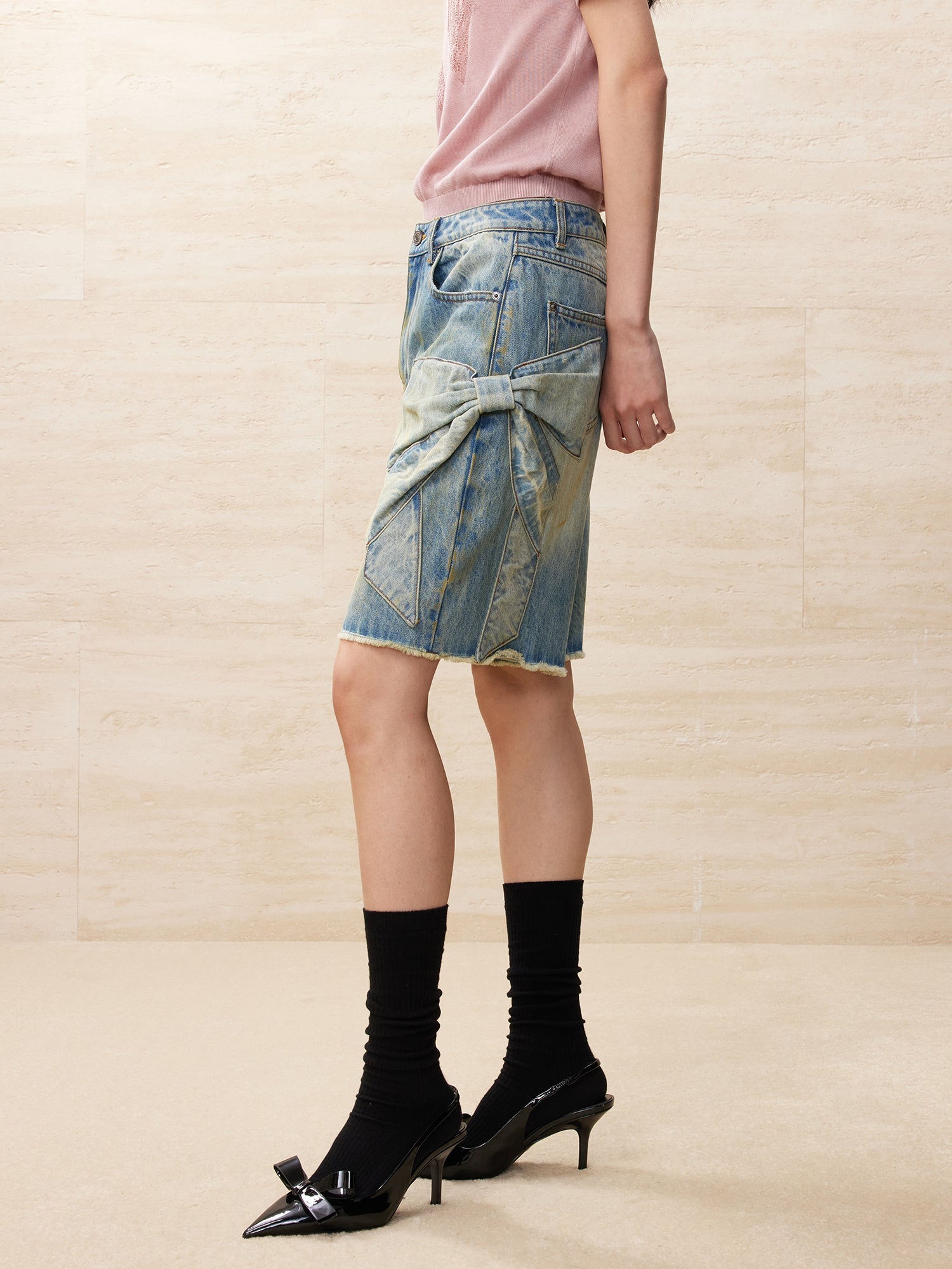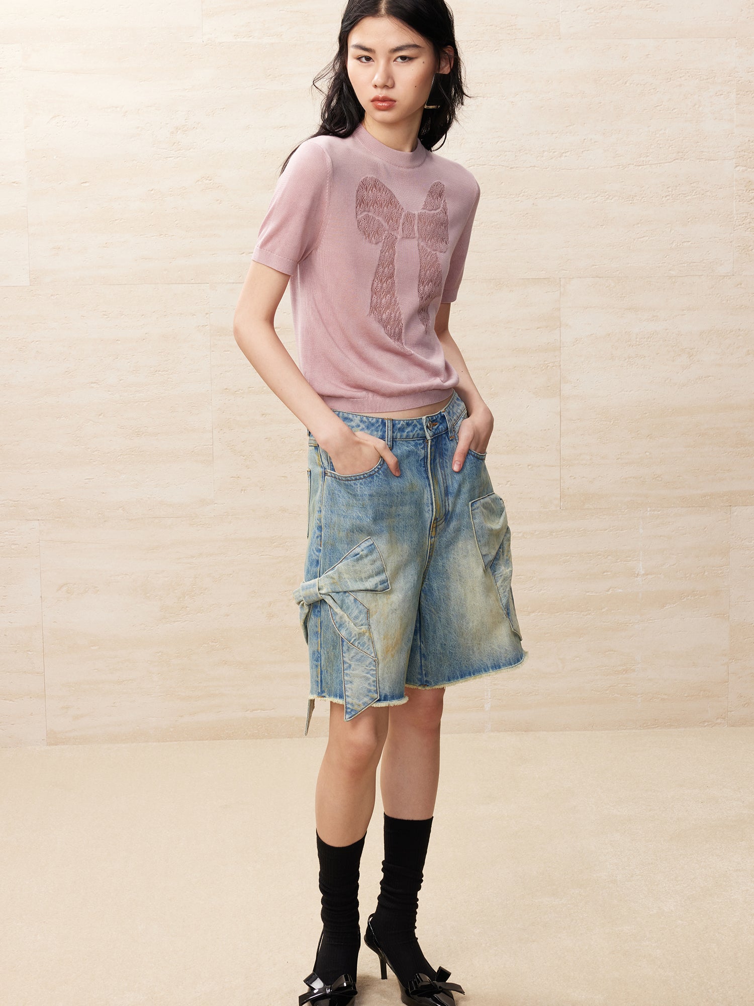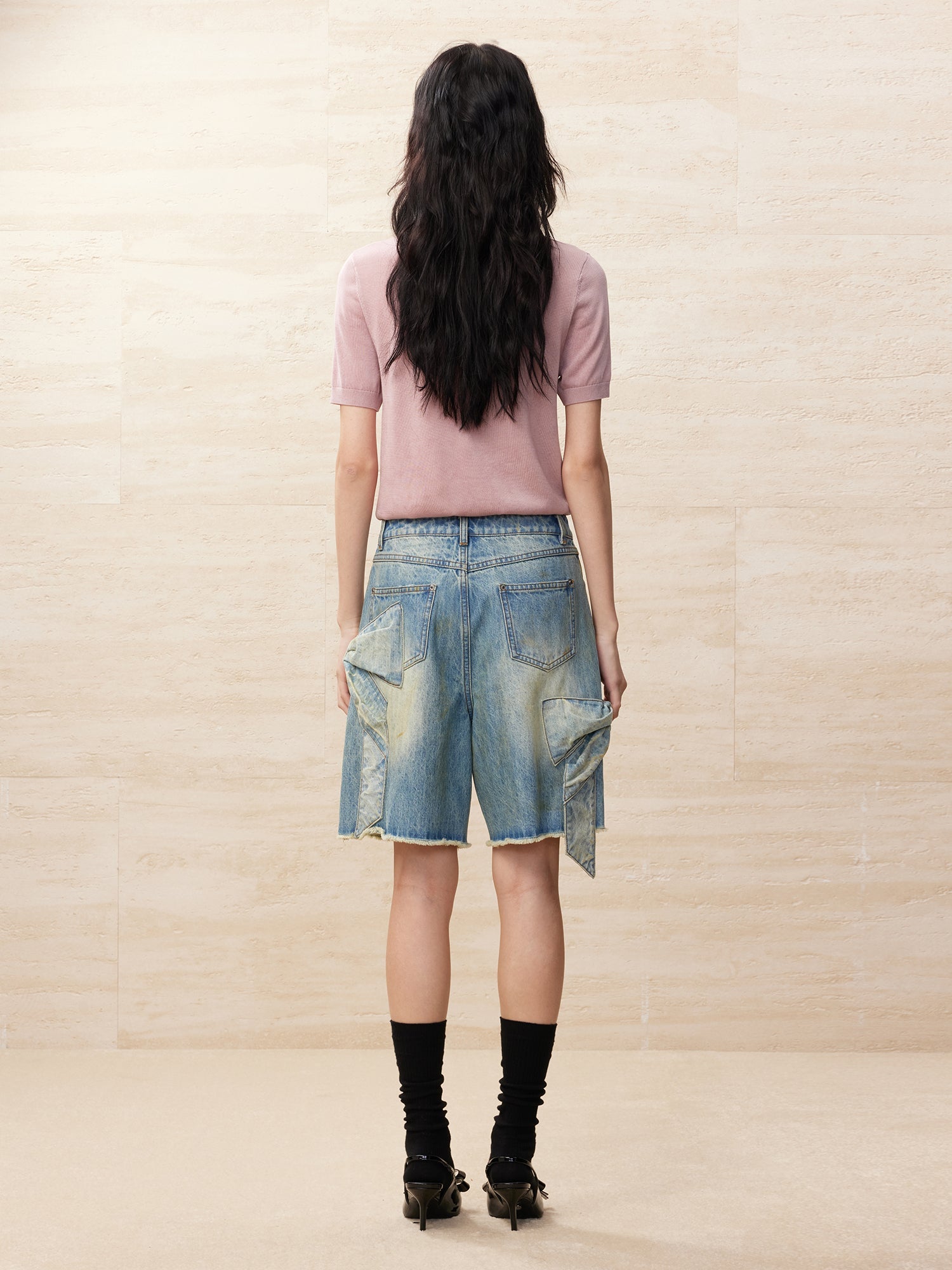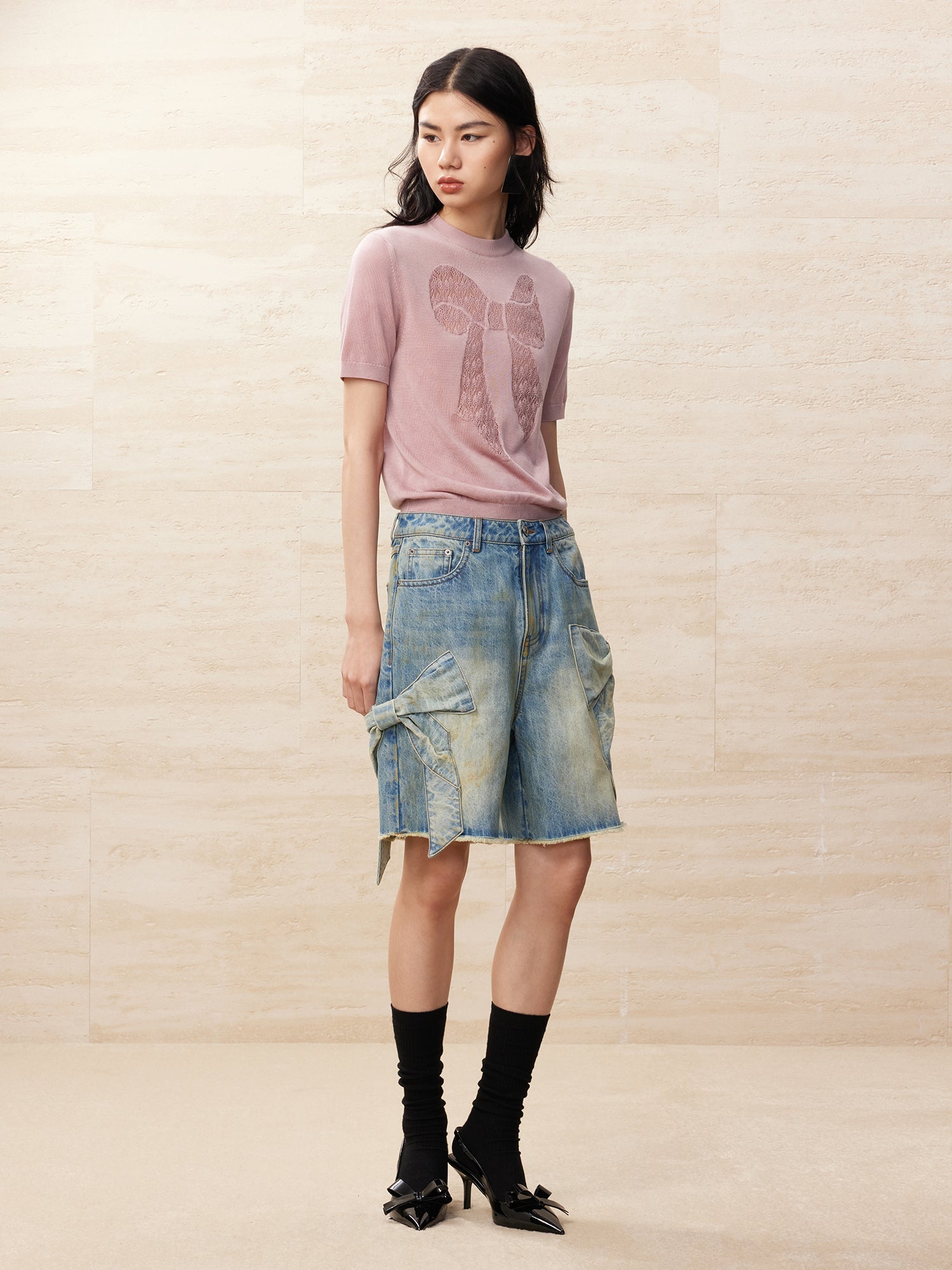 Vintage bowknot denim shorts