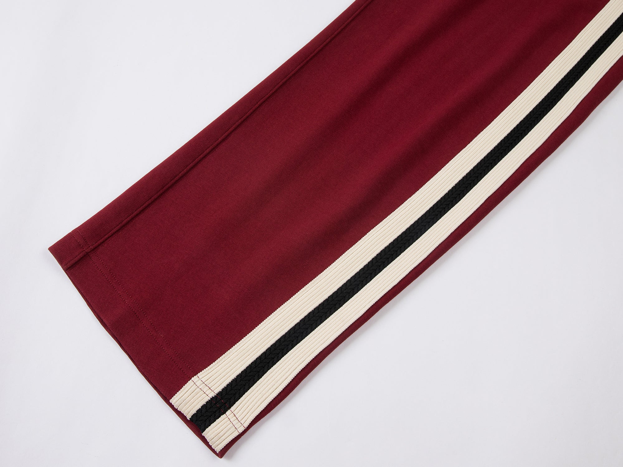 By adding black and white contrast sport tapes to both sides, these vintage-inspired track pants trousers gain a youthful and energetic vibe.