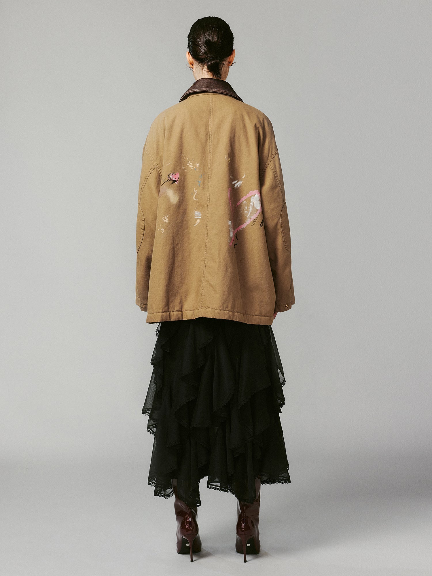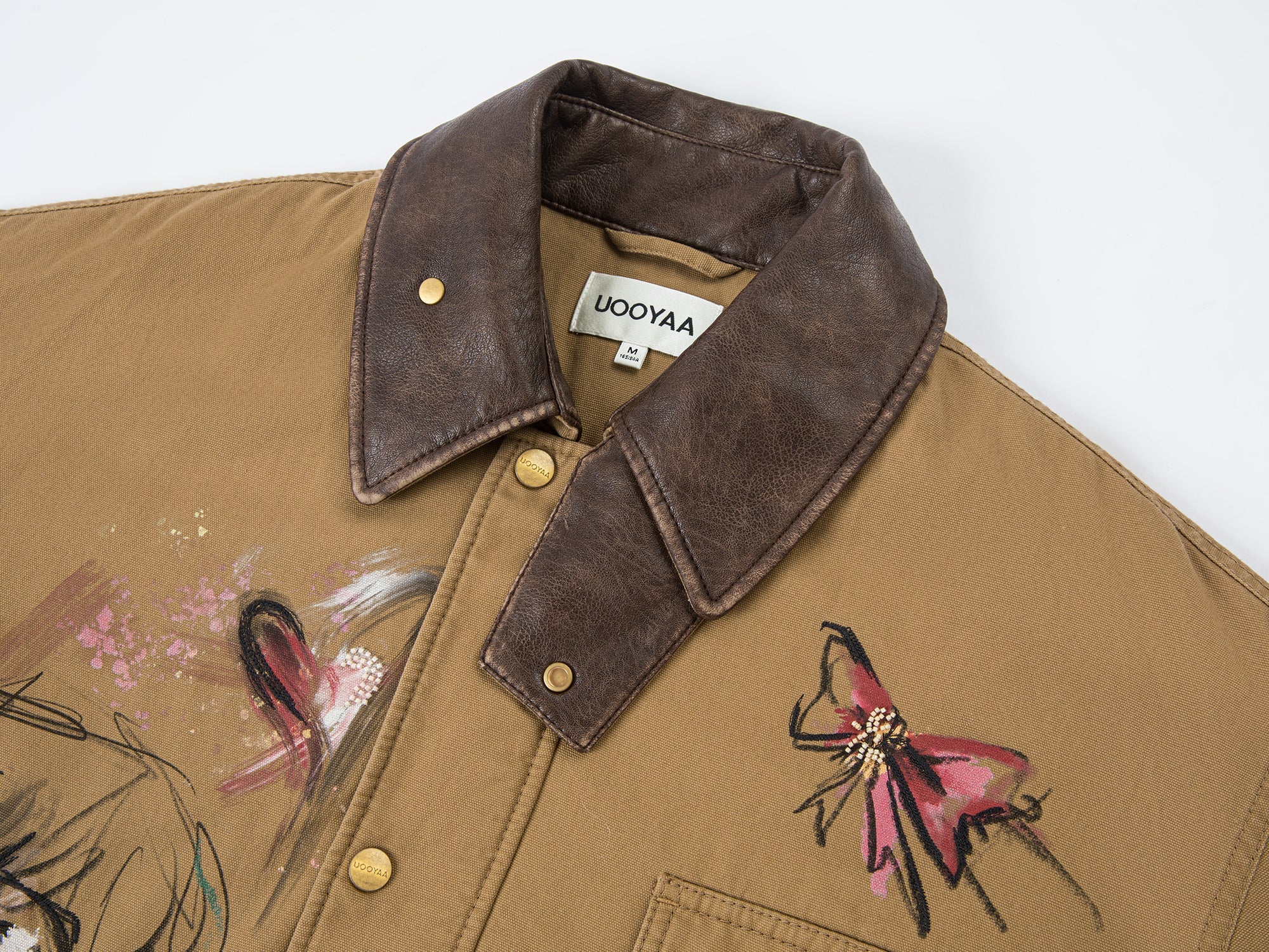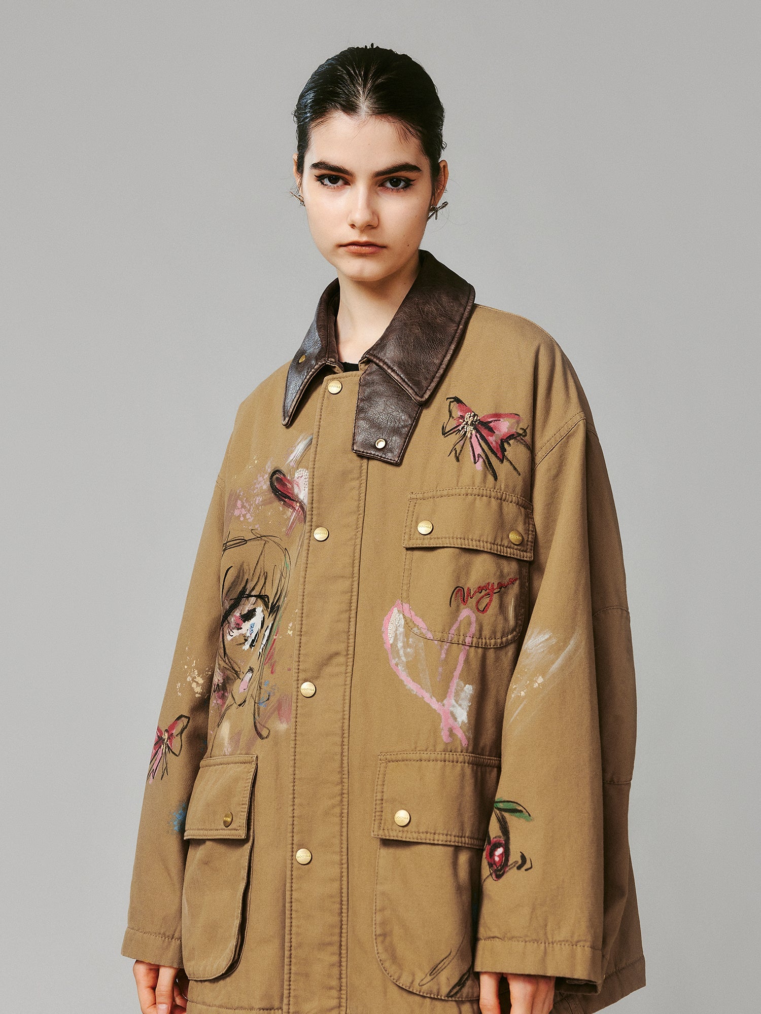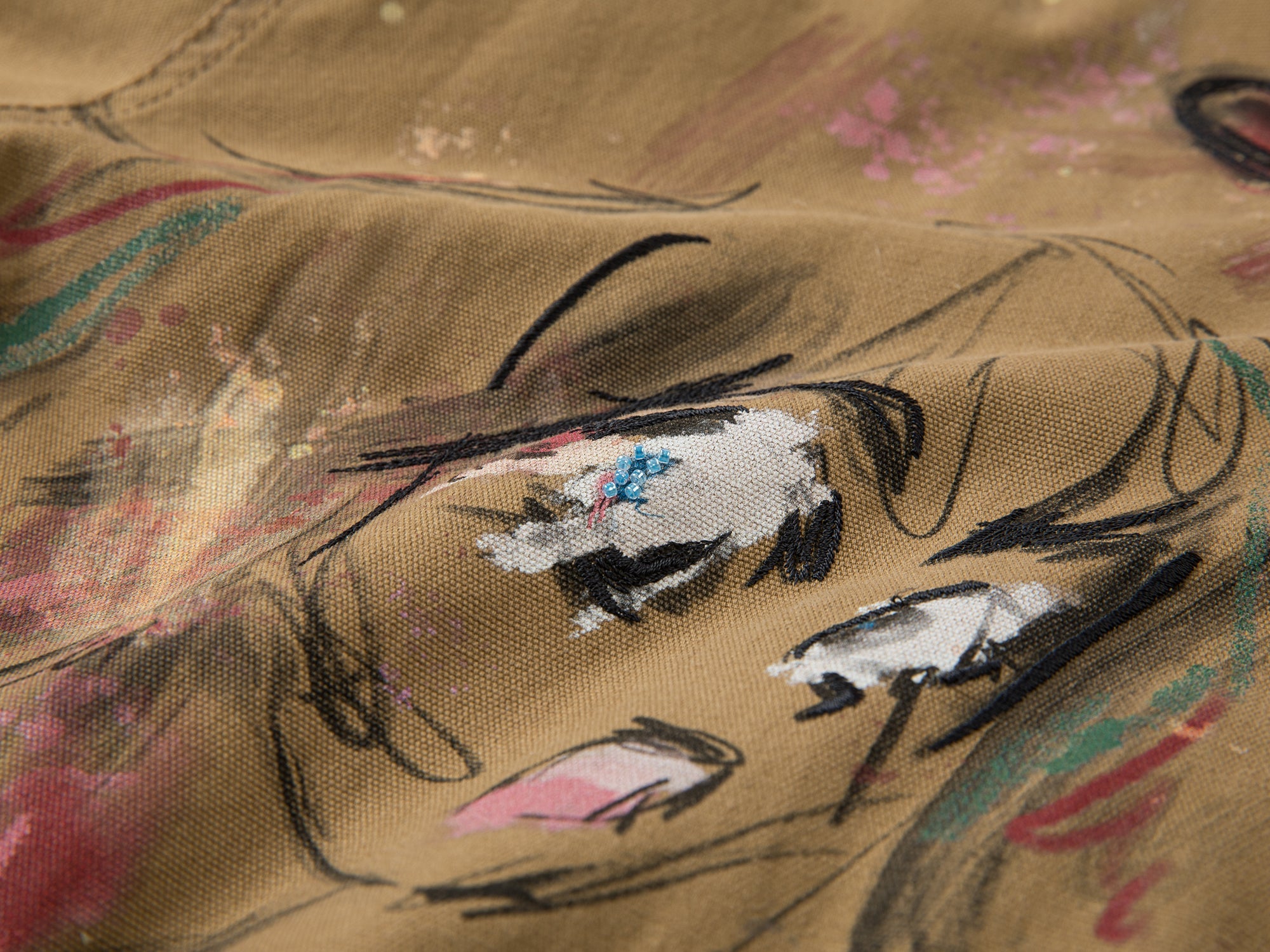 Graffiti is freely applied to a classic outdoor jacket, with playful anime girl motifs for a youthful feel.