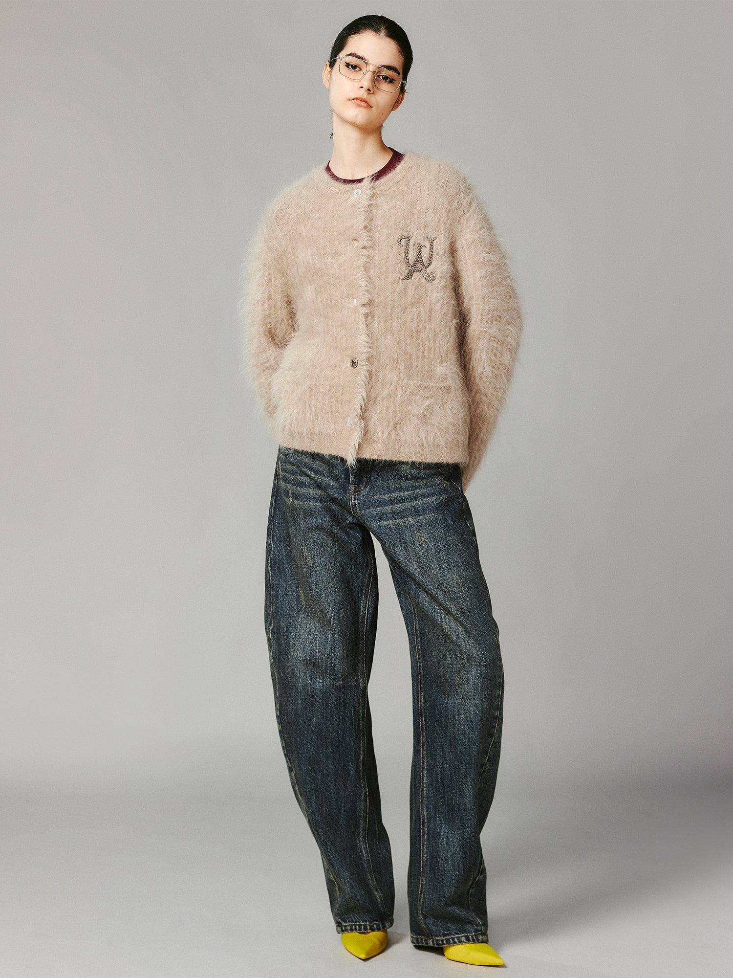 Fluffy, long-pile knit paired with carefully chosen buttons, creating a warm and sophisticated look.