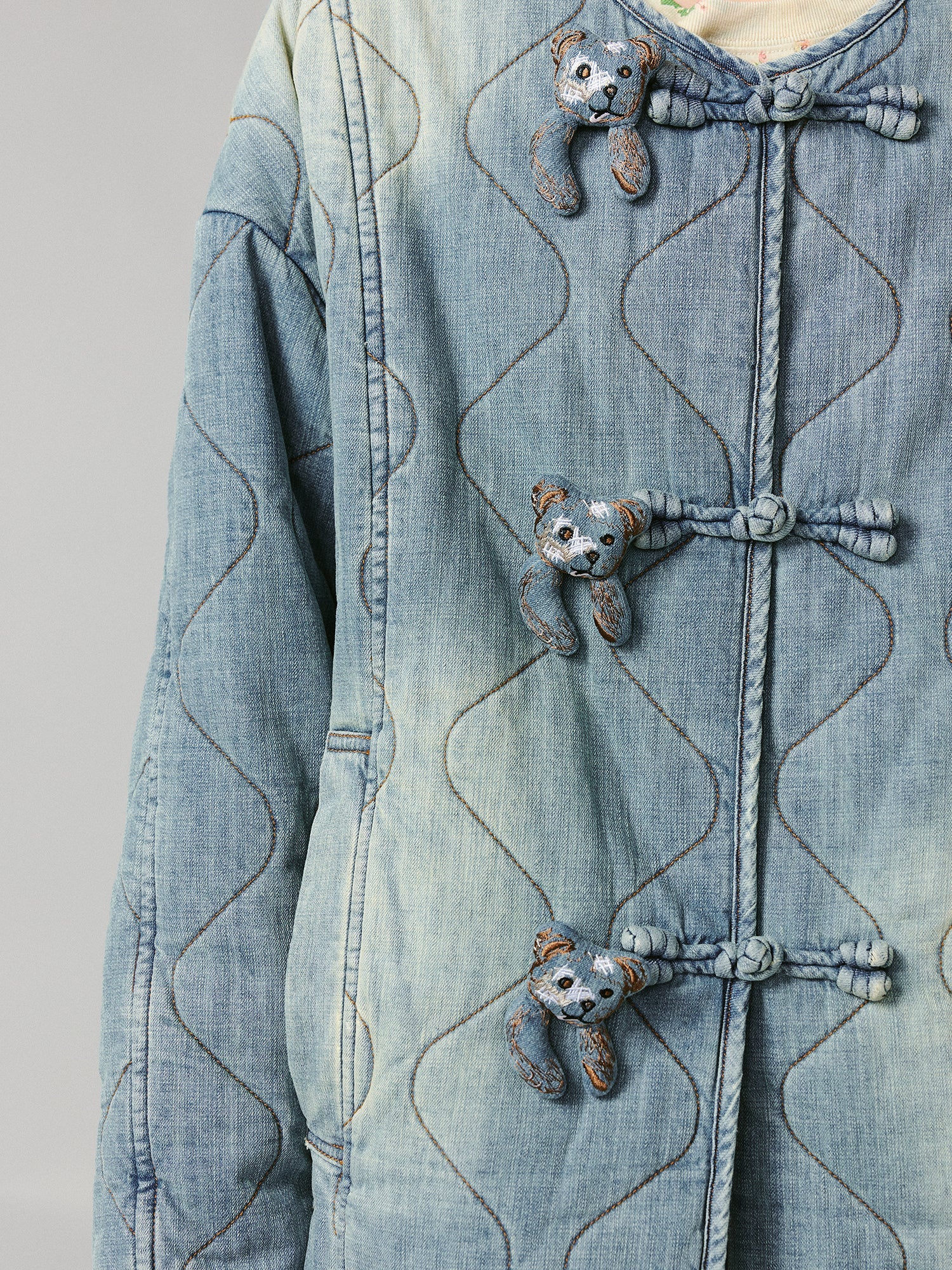 Drawing inspiration from the classic M65 quilted lining, this washed denim jacket combines warmth and charm with a vintage-style teddy bear design, visible stitching, and traditional Chinese knot buttons.