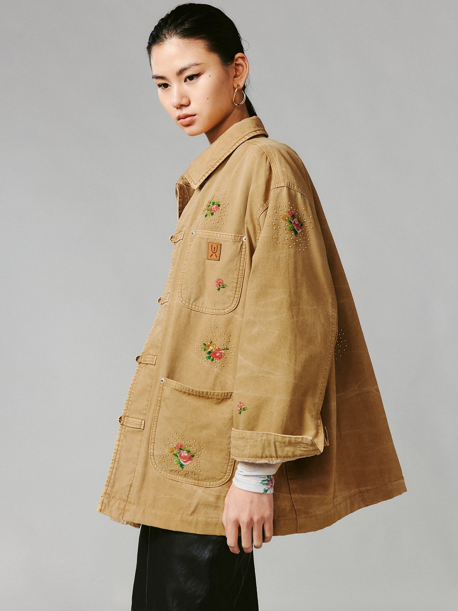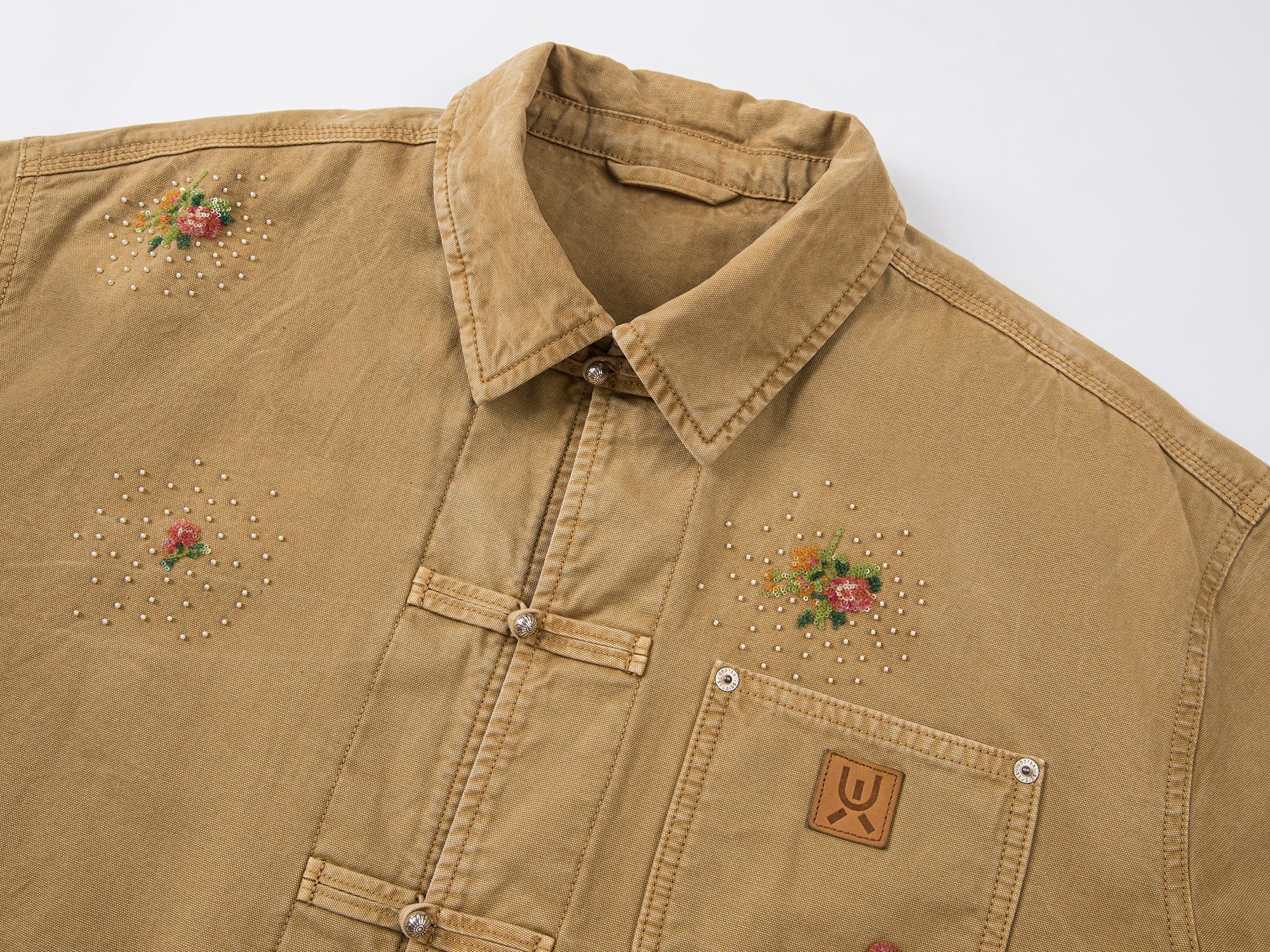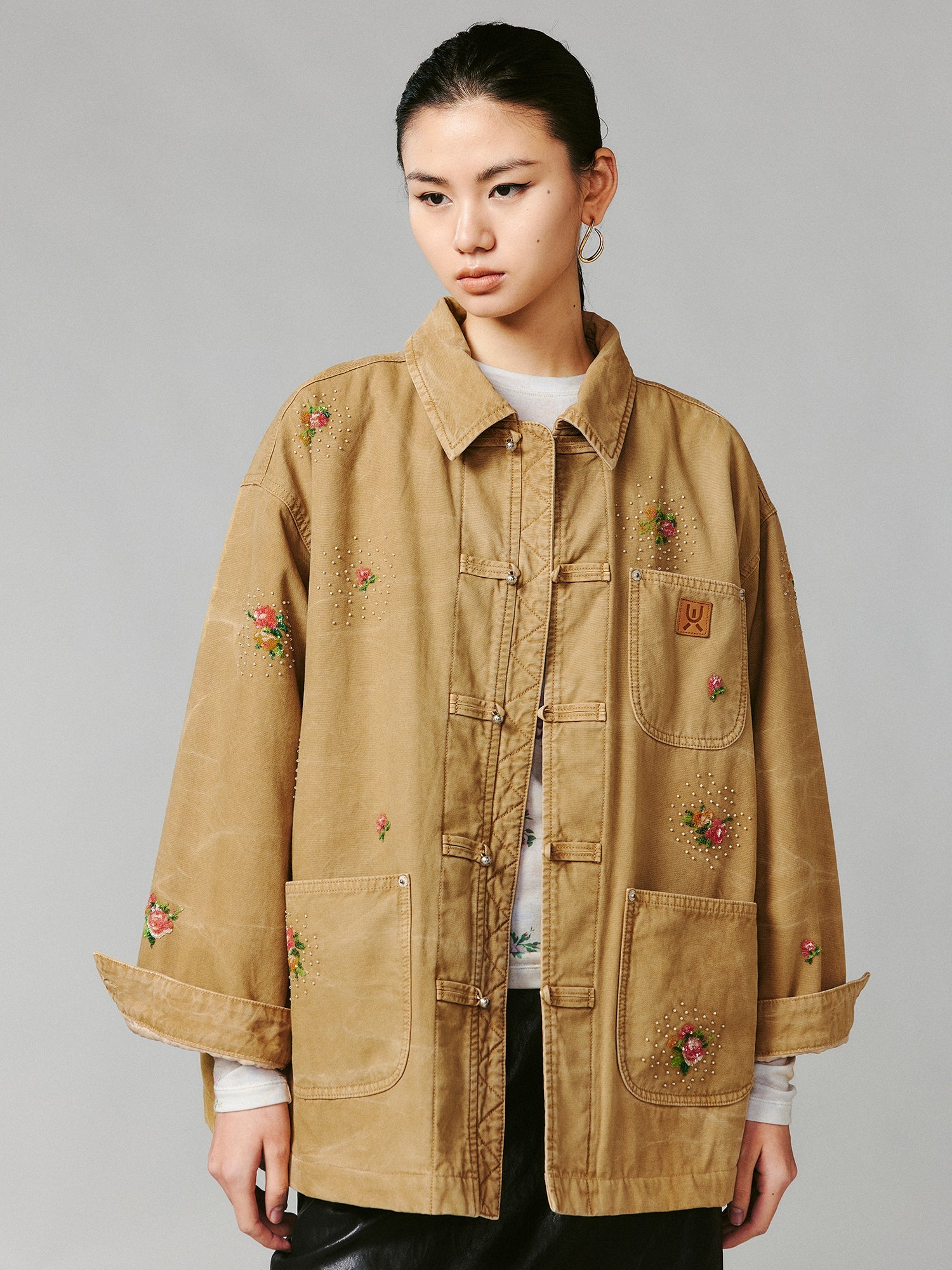 Drawing inspiration from the classic Michigan jacket, this design incorporates traditional Chinese knot buttons and blooming embroidered and beaded flowers, blending vintage charm with a playful touch.