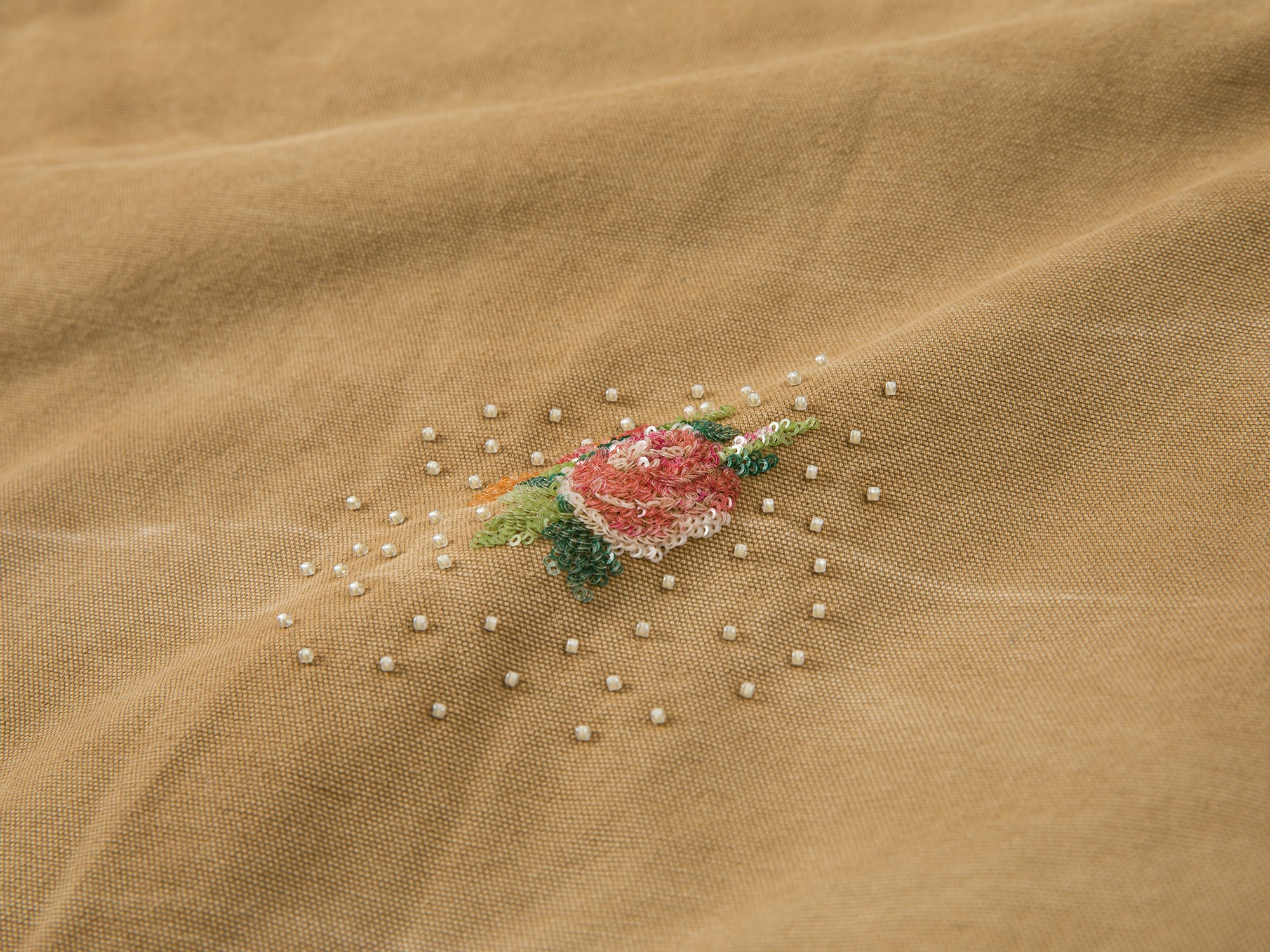 Made from high-quality cotton canvas, the fabric features a washed ripple texture and is enhanced with precisely placed floral sequin embroidery, offering a refined and delicate finish.
