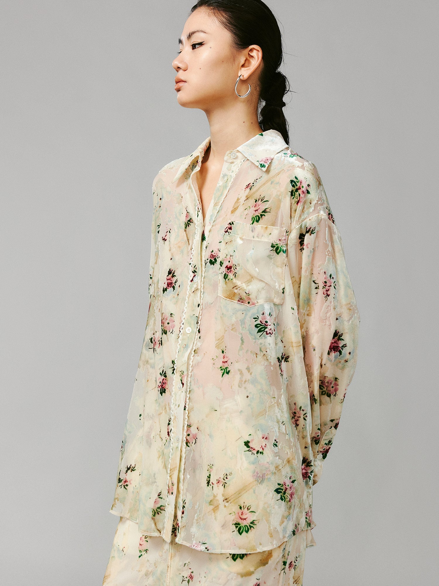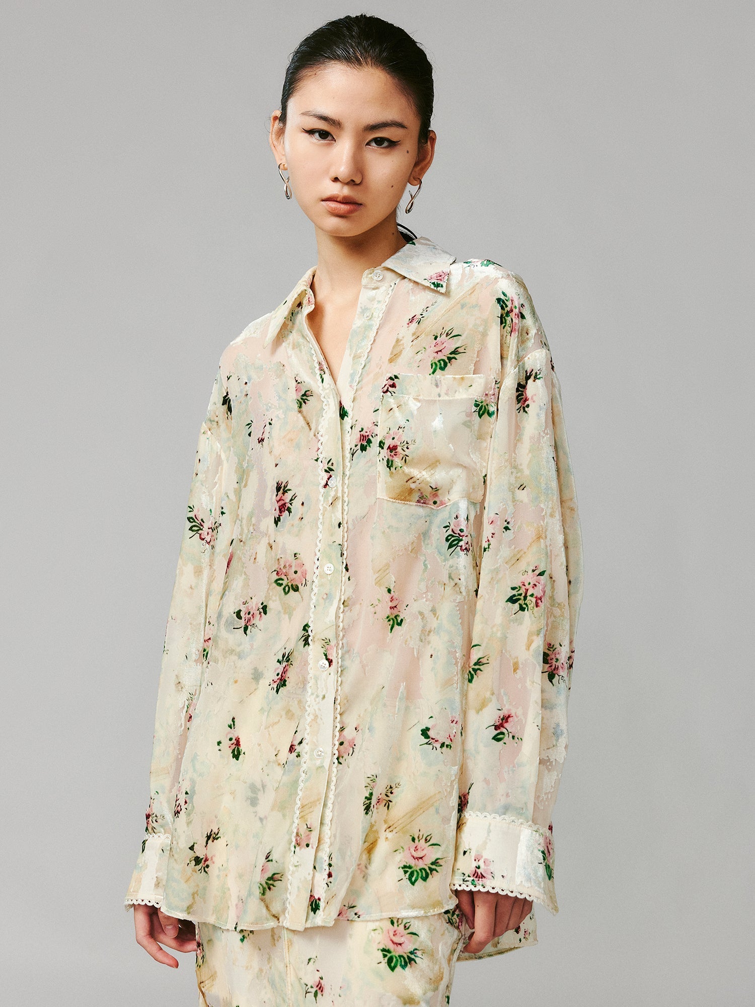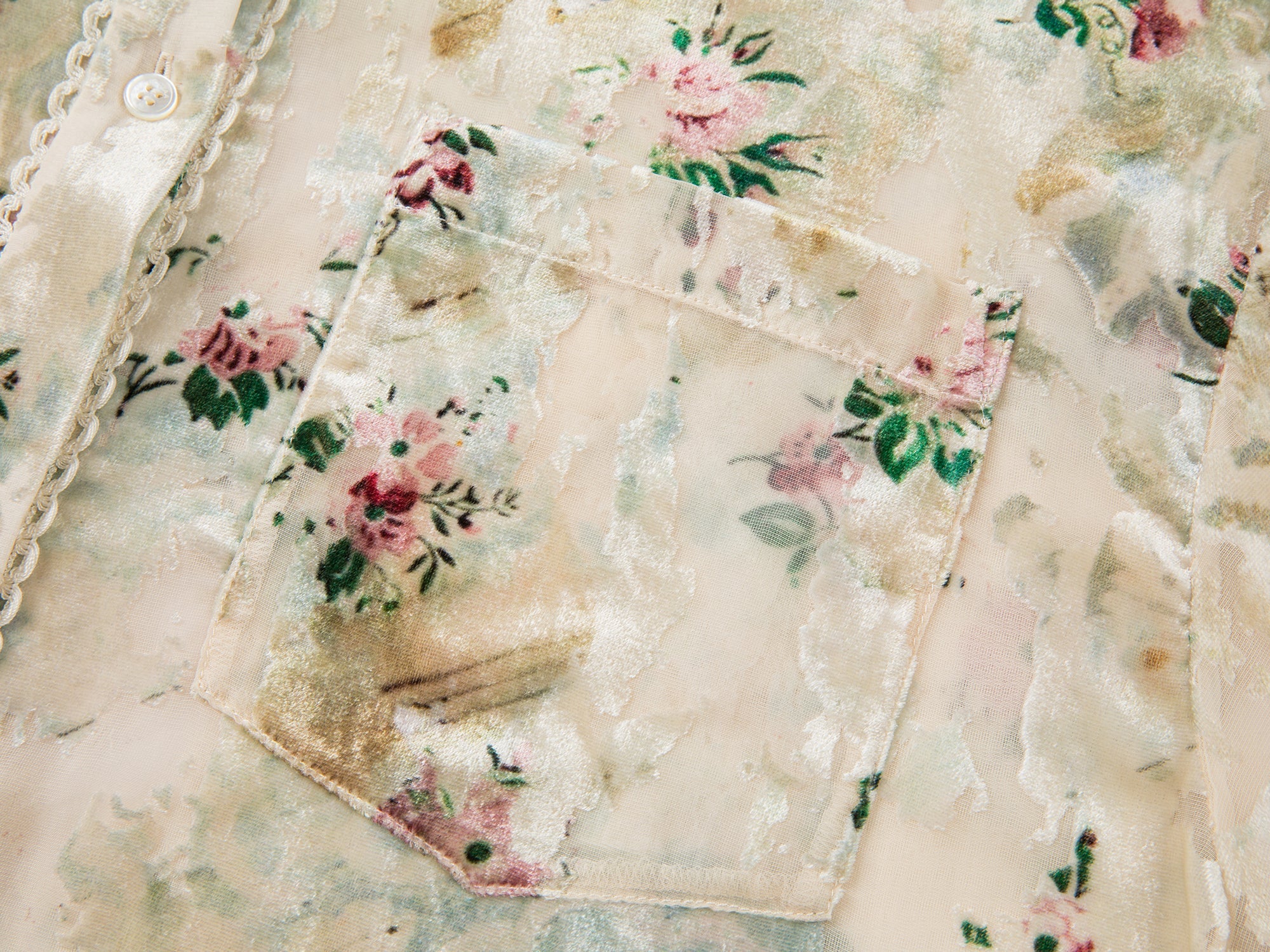 Crafted from crushed velvet fabric, this shirt features a vintage floral wallpaper pattern with a peeling effect, blending retro opulence with warmth and romance.