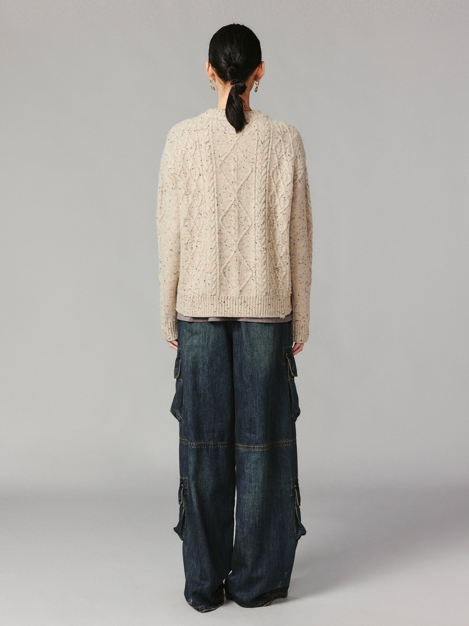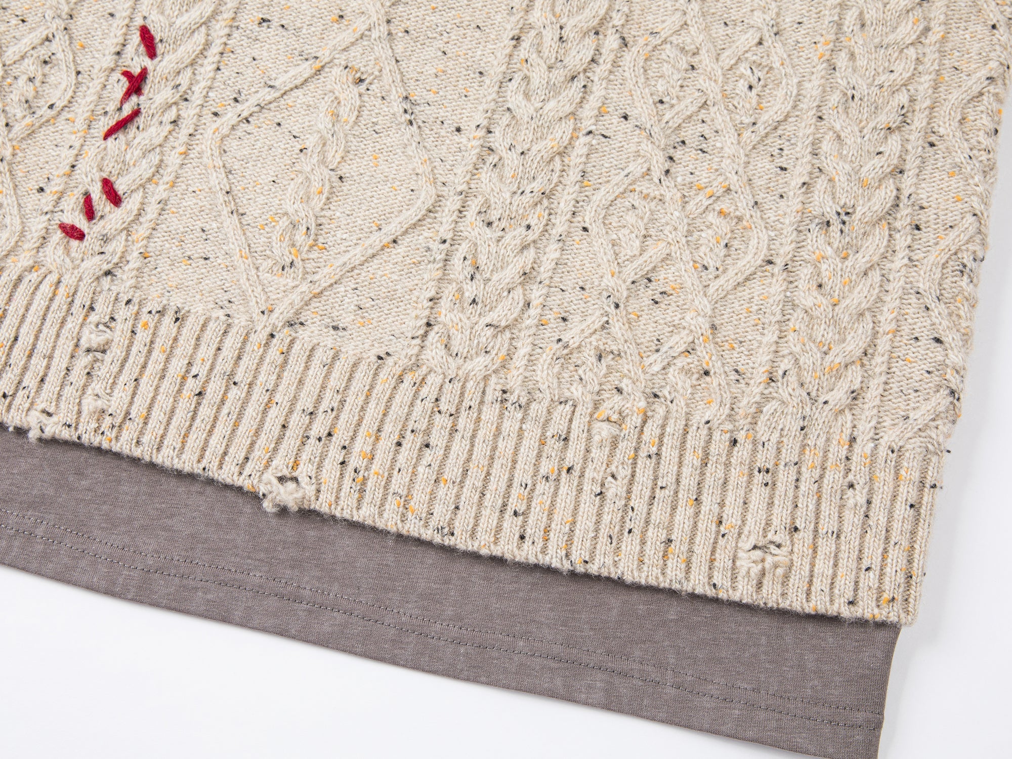 A cozy, playful touch—a fluffy teddy bear peeks out from a distressed opening, adding a delightful blend of charm and comfort to this unique two-in-one pullover sweater.
