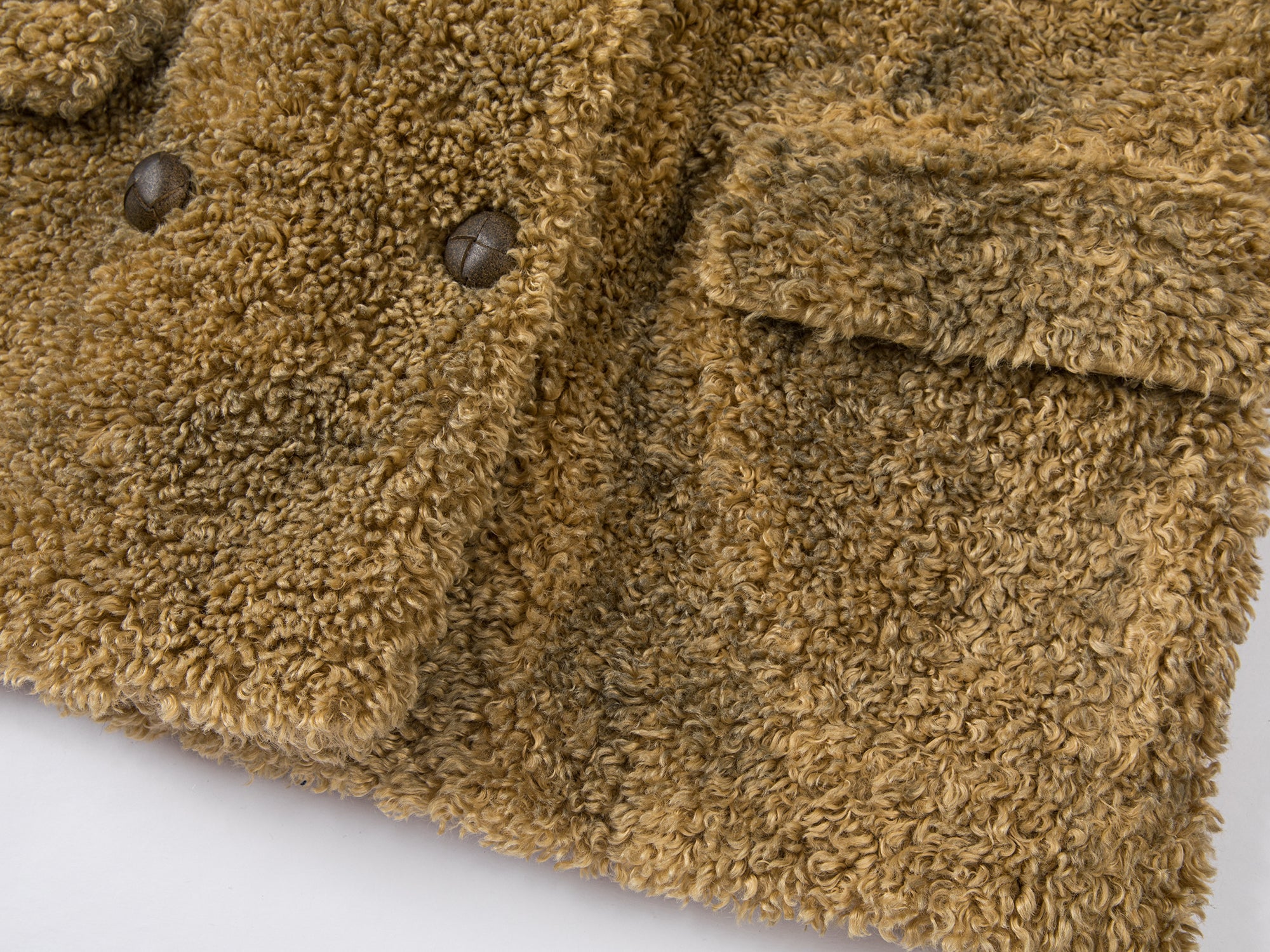 A creatively crafted double-breasted men's suit made from faux lambswool fabric, featuring a distressed spray wash technique for a soft, playful touch, exuding vintage charm and style.
