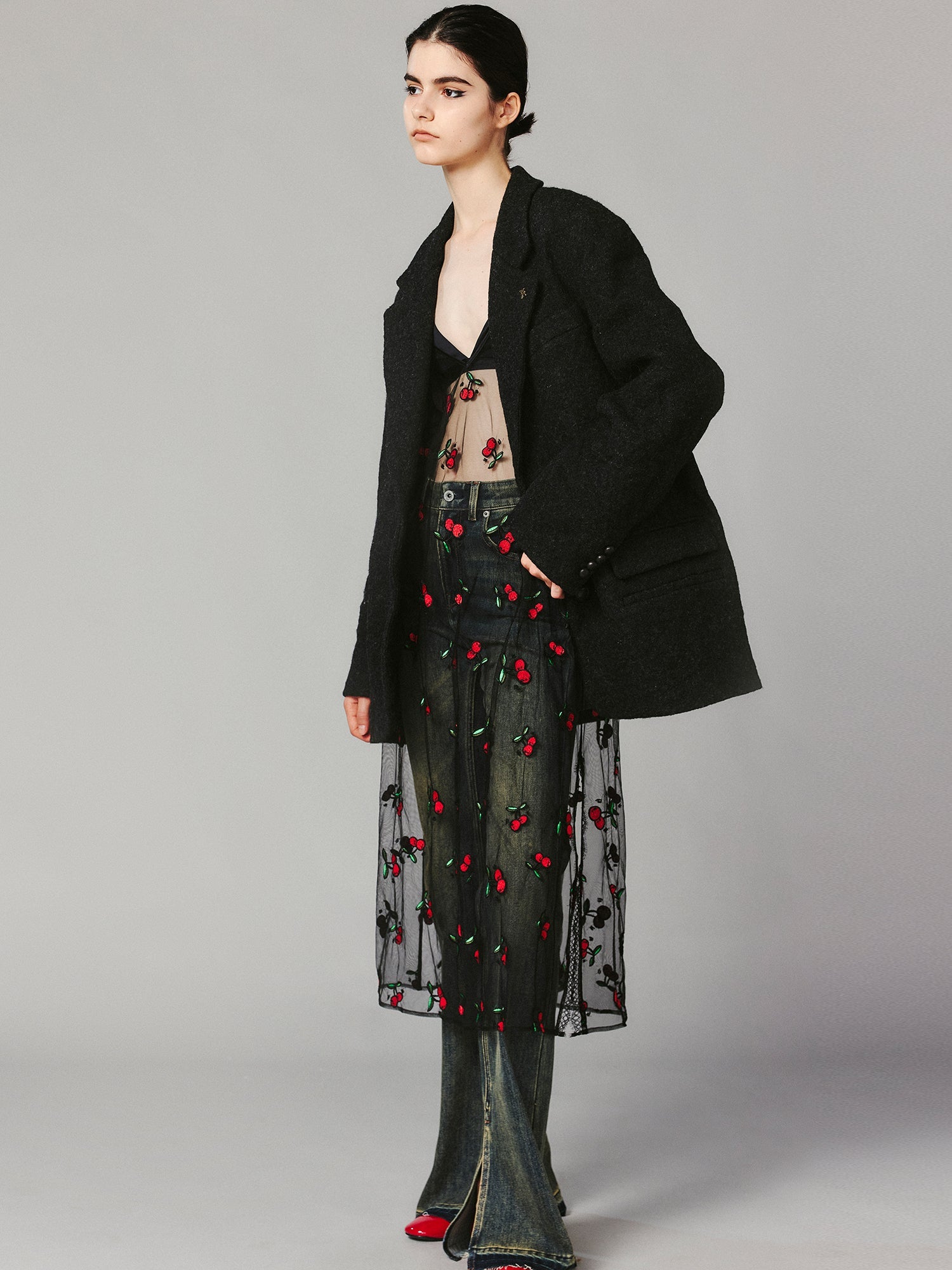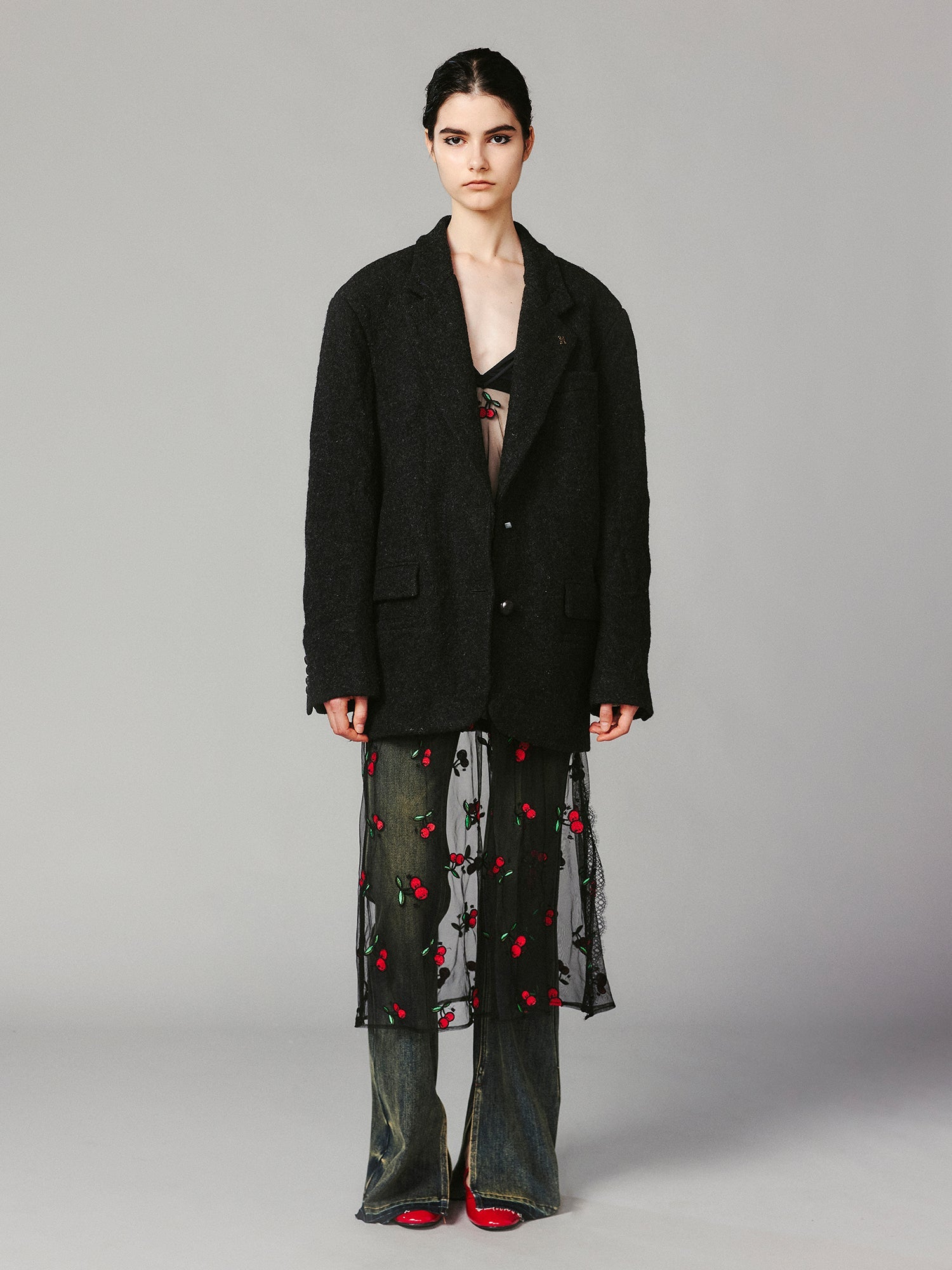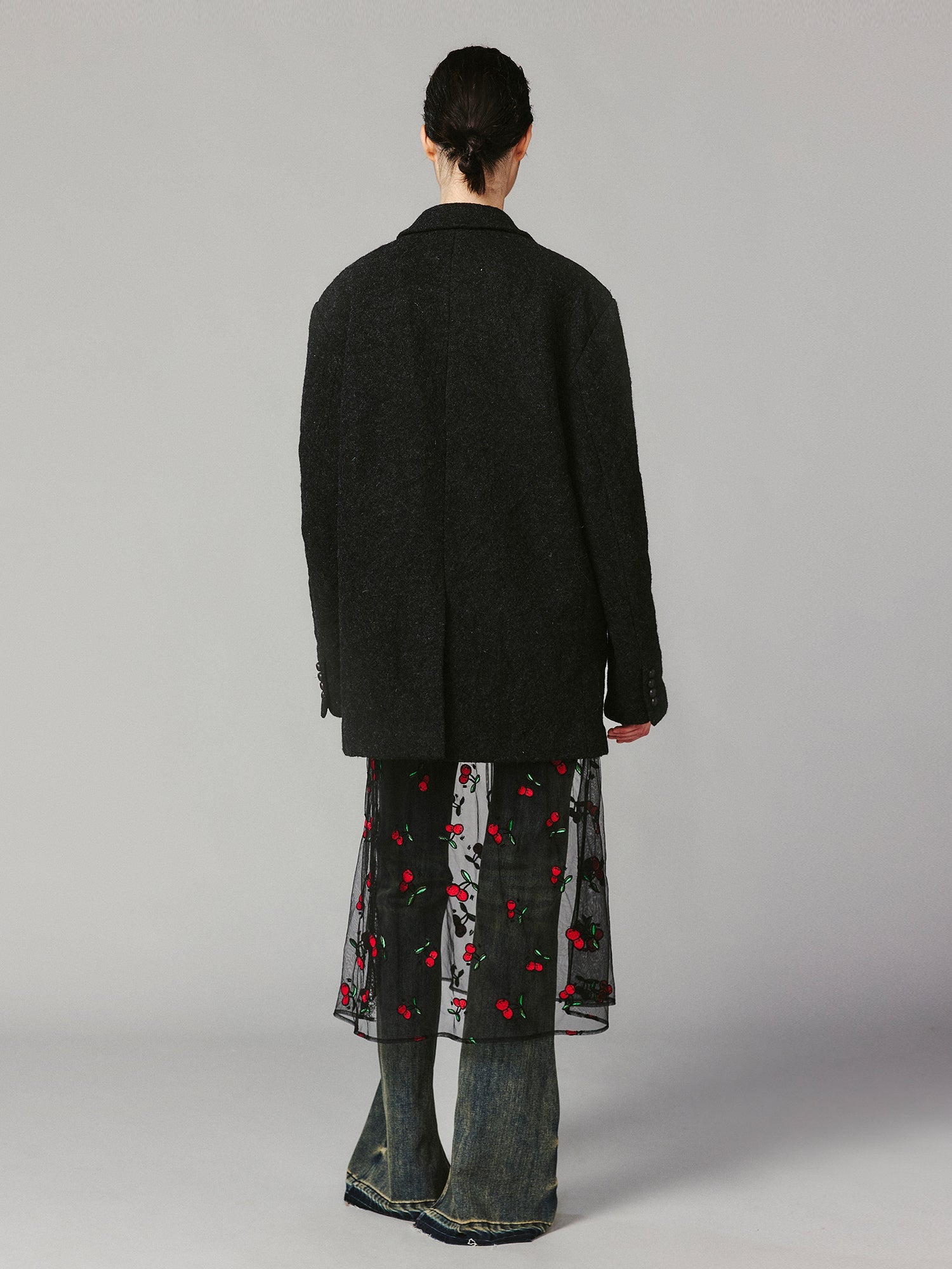 Vintage wool blazer made from washed wool fabric, featuring a crinkled effect that reflects the wear and tear of everyday life, offering a relaxed and free-spirited vibe.
