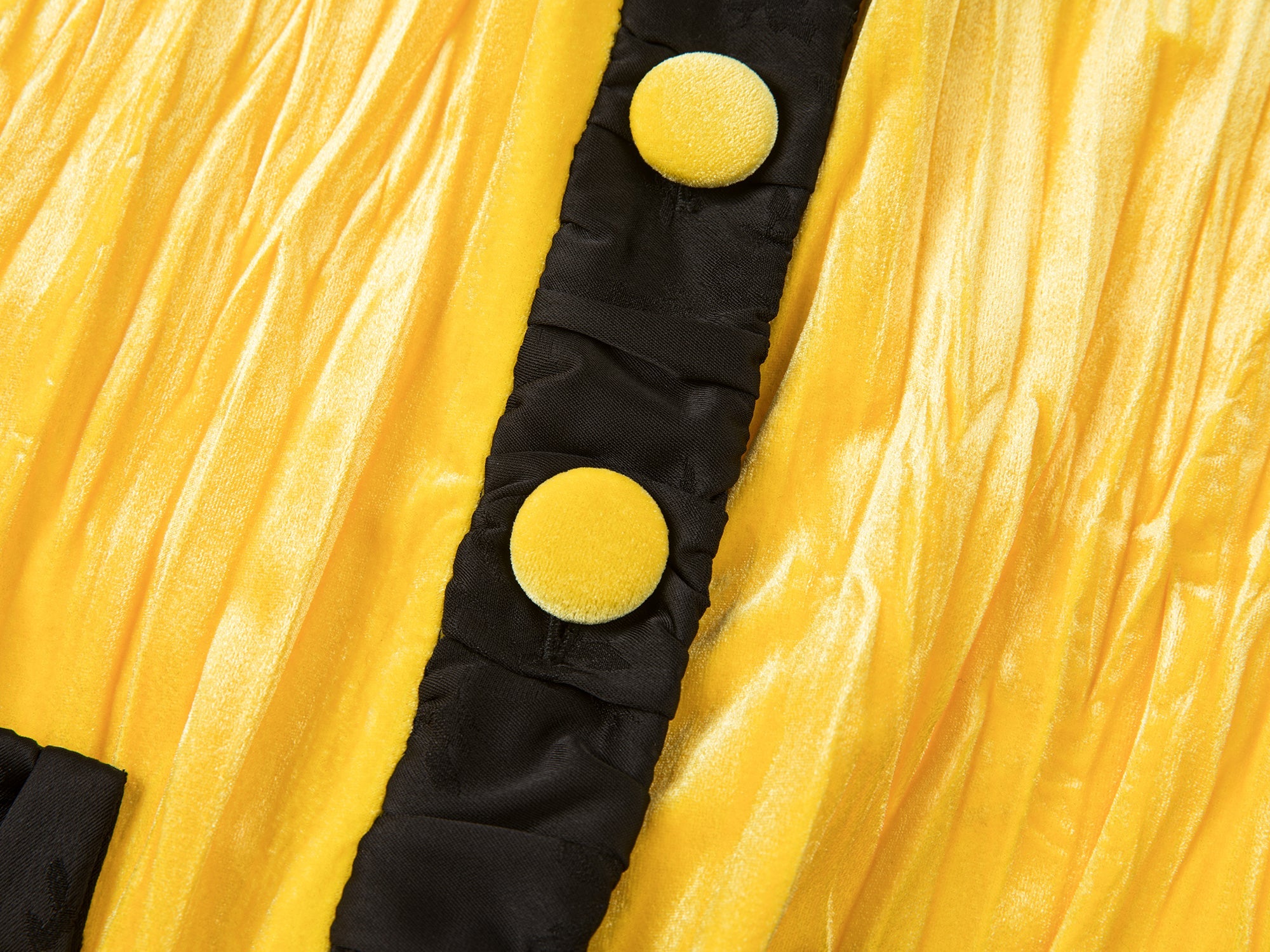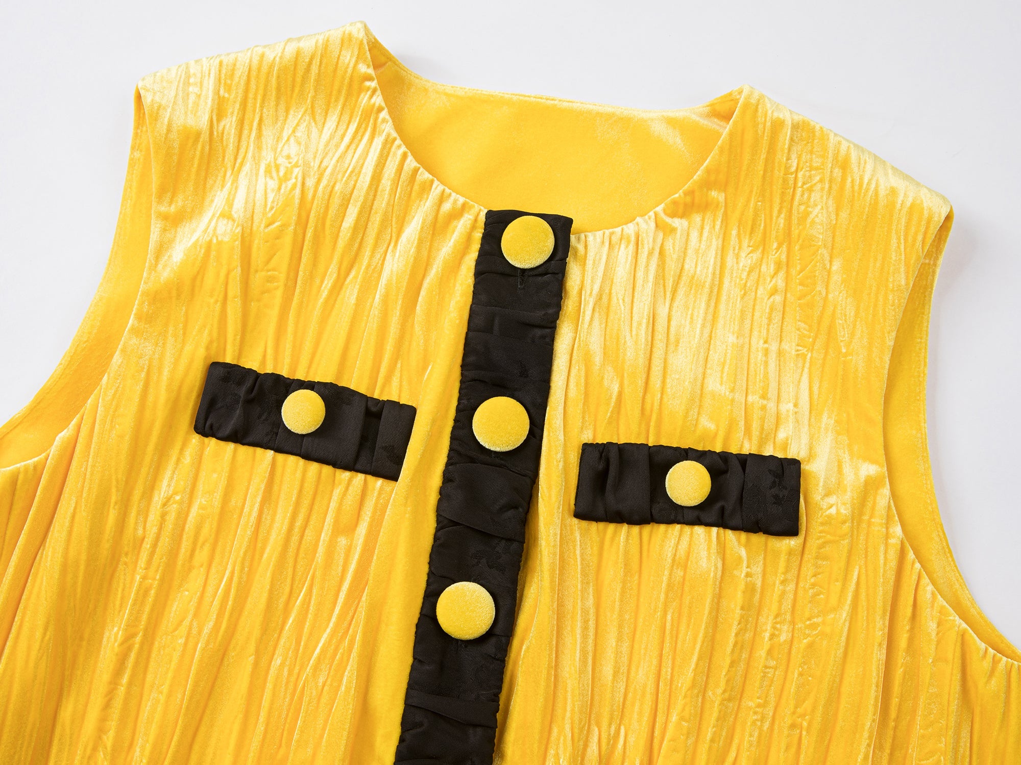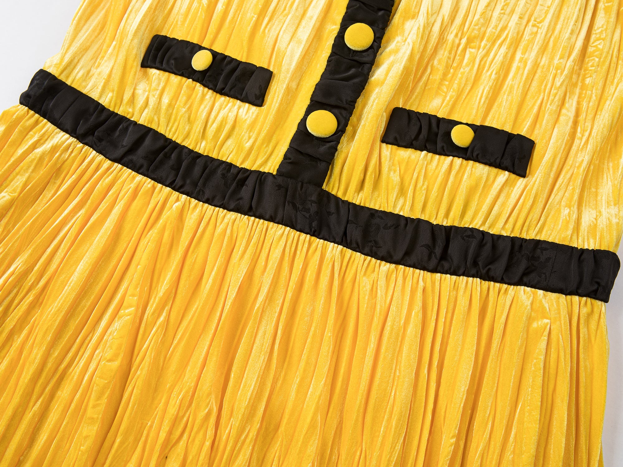 A classic Chanel-style loose dress made from bright, warm ginger yellow velvet fabric, exuding a retro nostalgia with youthful vibrancy.
