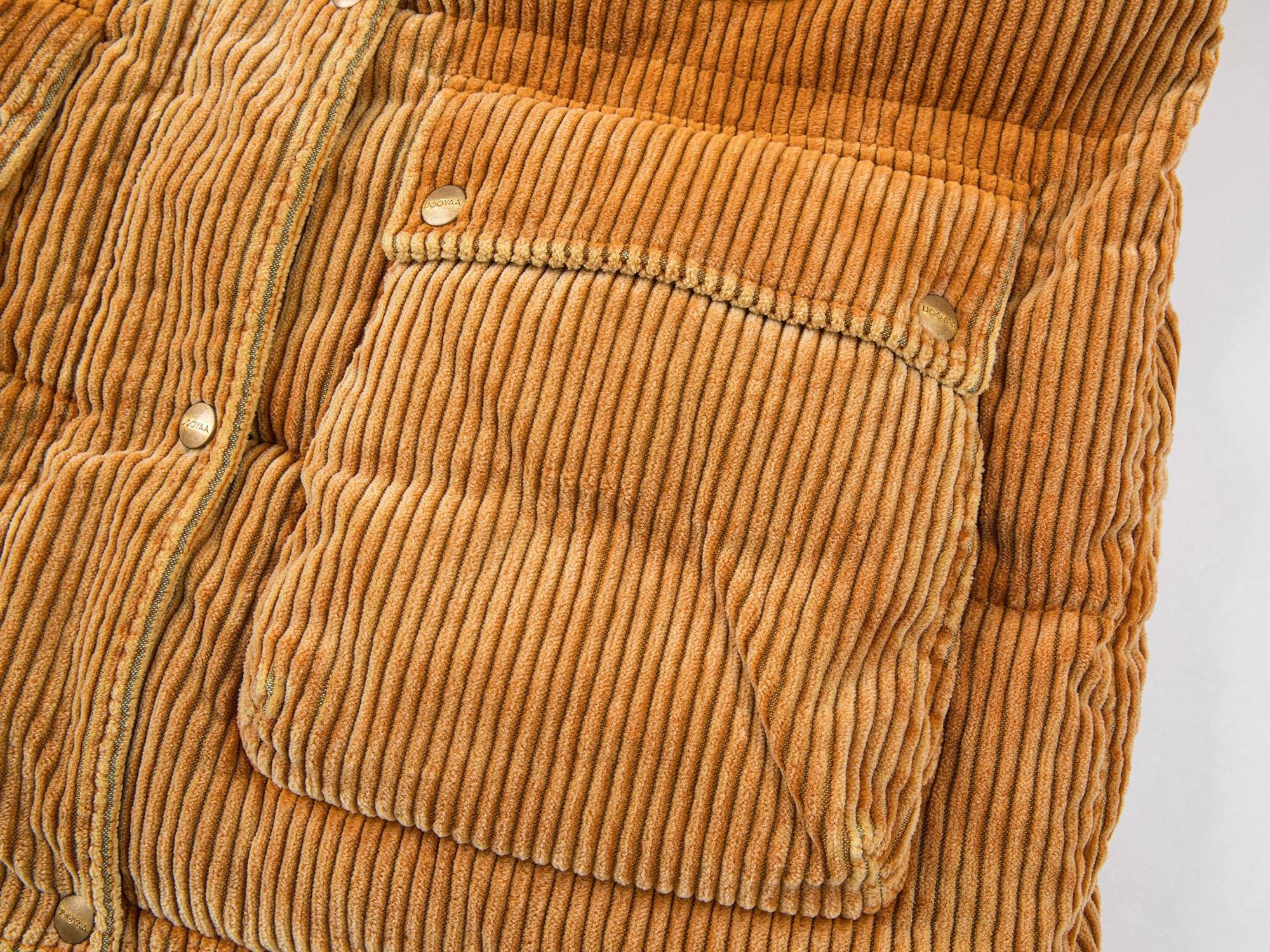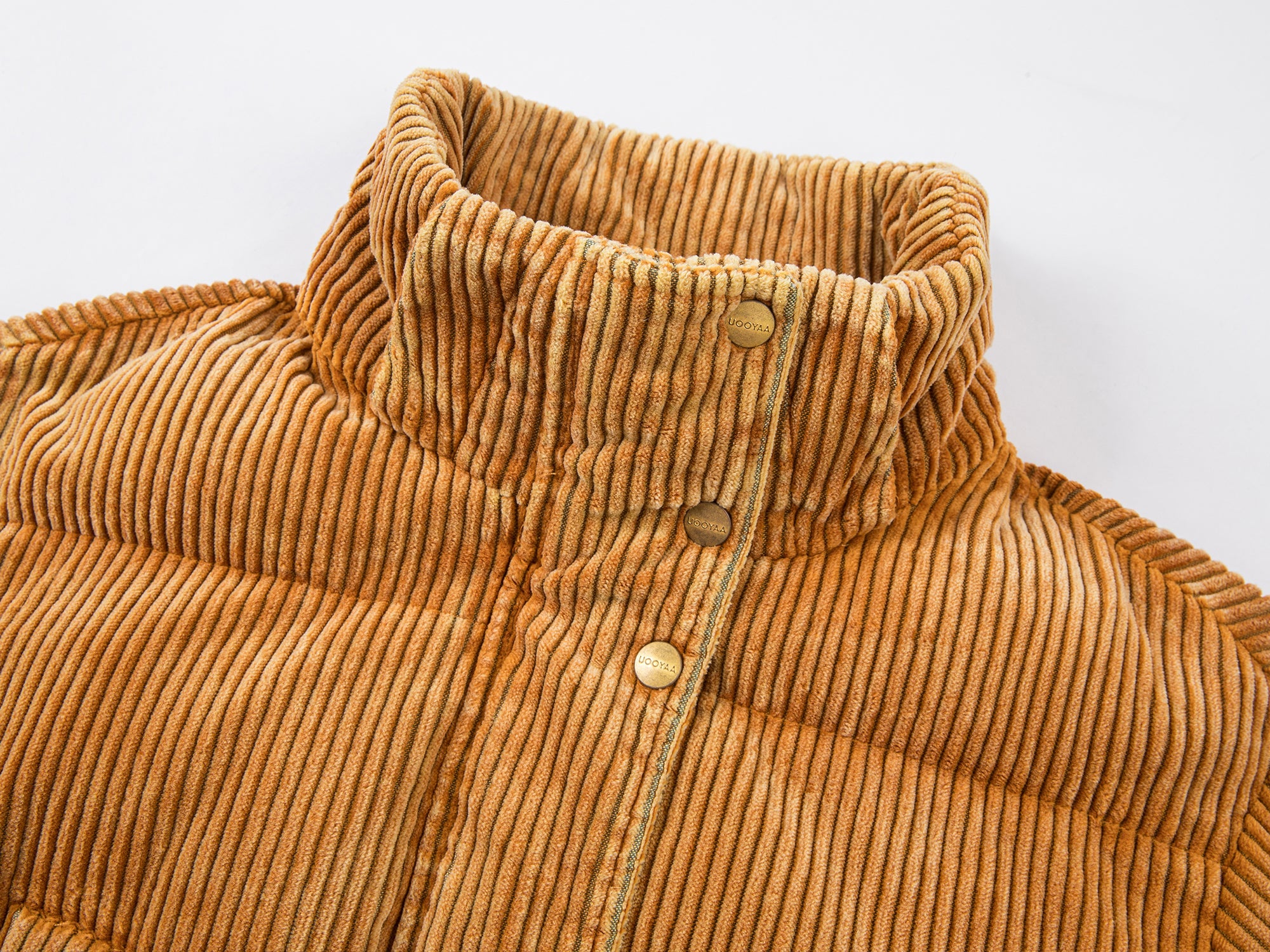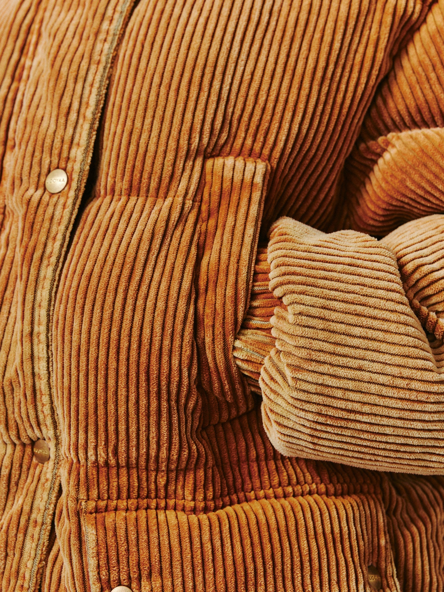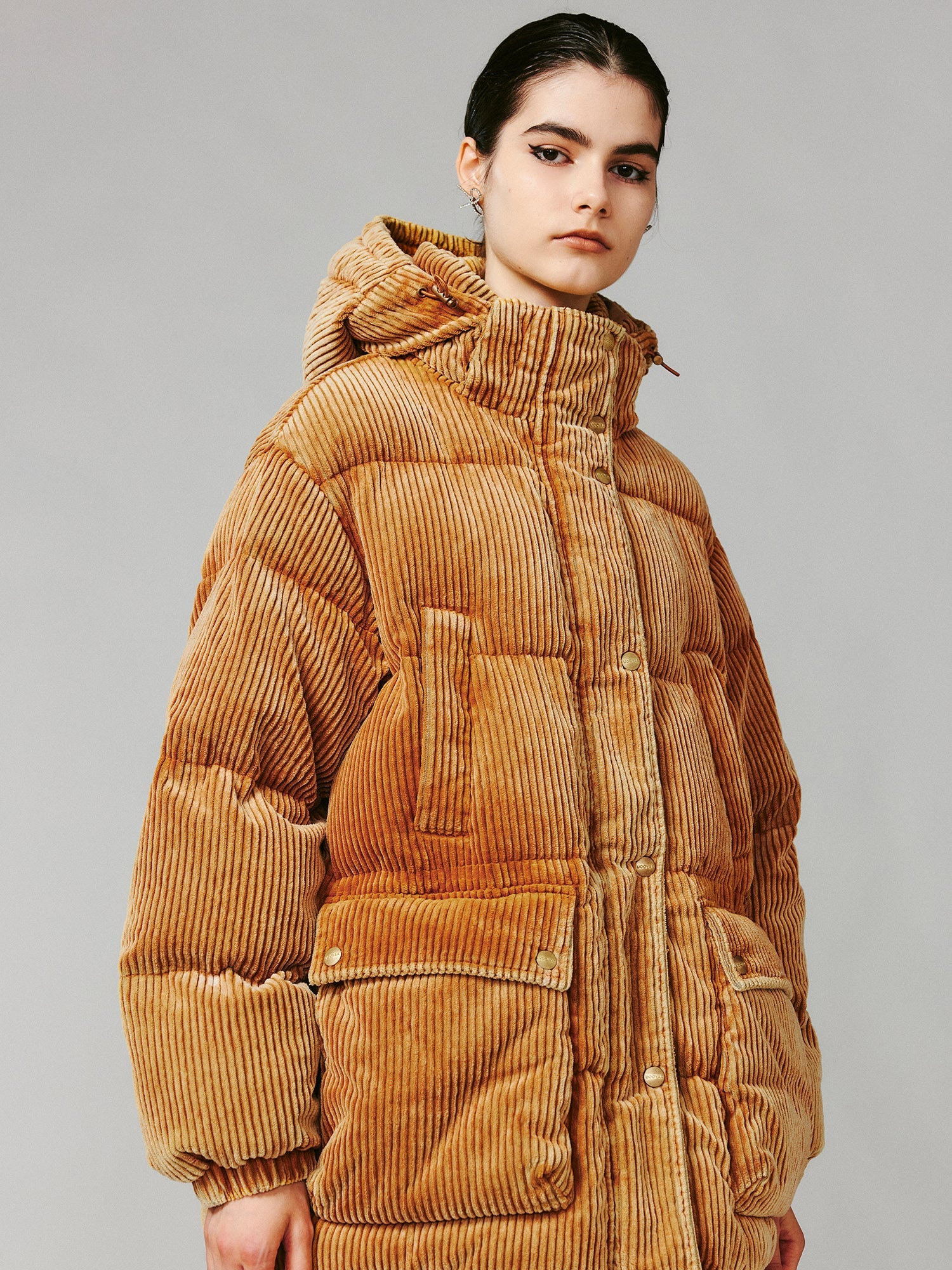 A hooded puffer jacket with washed and distressed corduroy, offering a nostalgic and cozy feel.