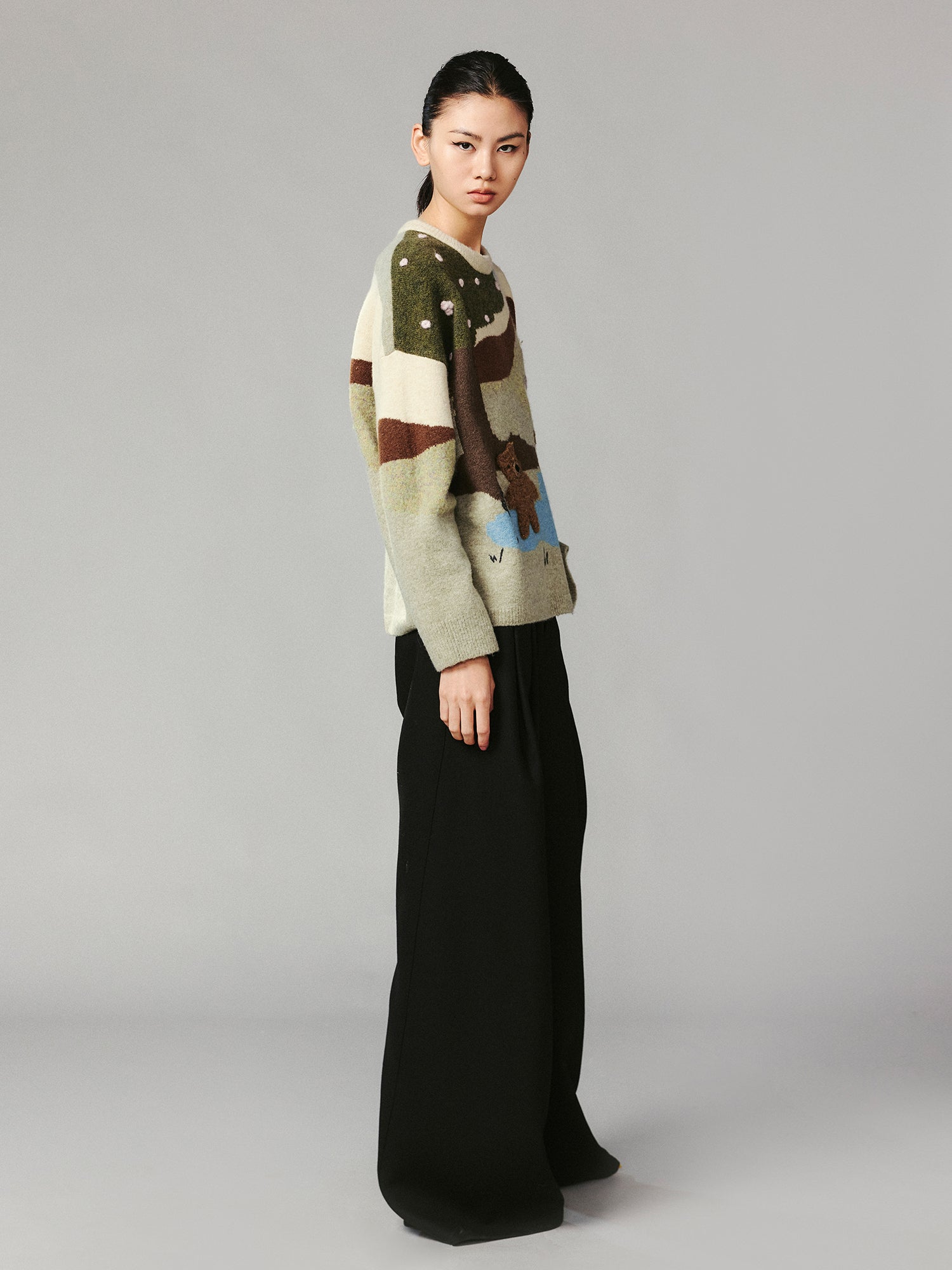 Inspired by the whimsical imagination of fairy tales, this floral knit sweater beautifully incorporates enchanting landscapes, combining warmth with playfulness.