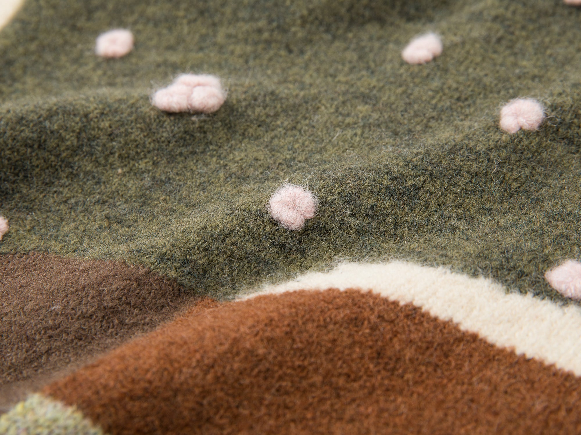 A blend of various yarns including lambswool, camel hair, and yak wool, soft and skin-friendly. The entire piece features hand-knitted floral patterns, enhanced with hand-crocheted and hand-embroidered details, making it exquisite and delicate.