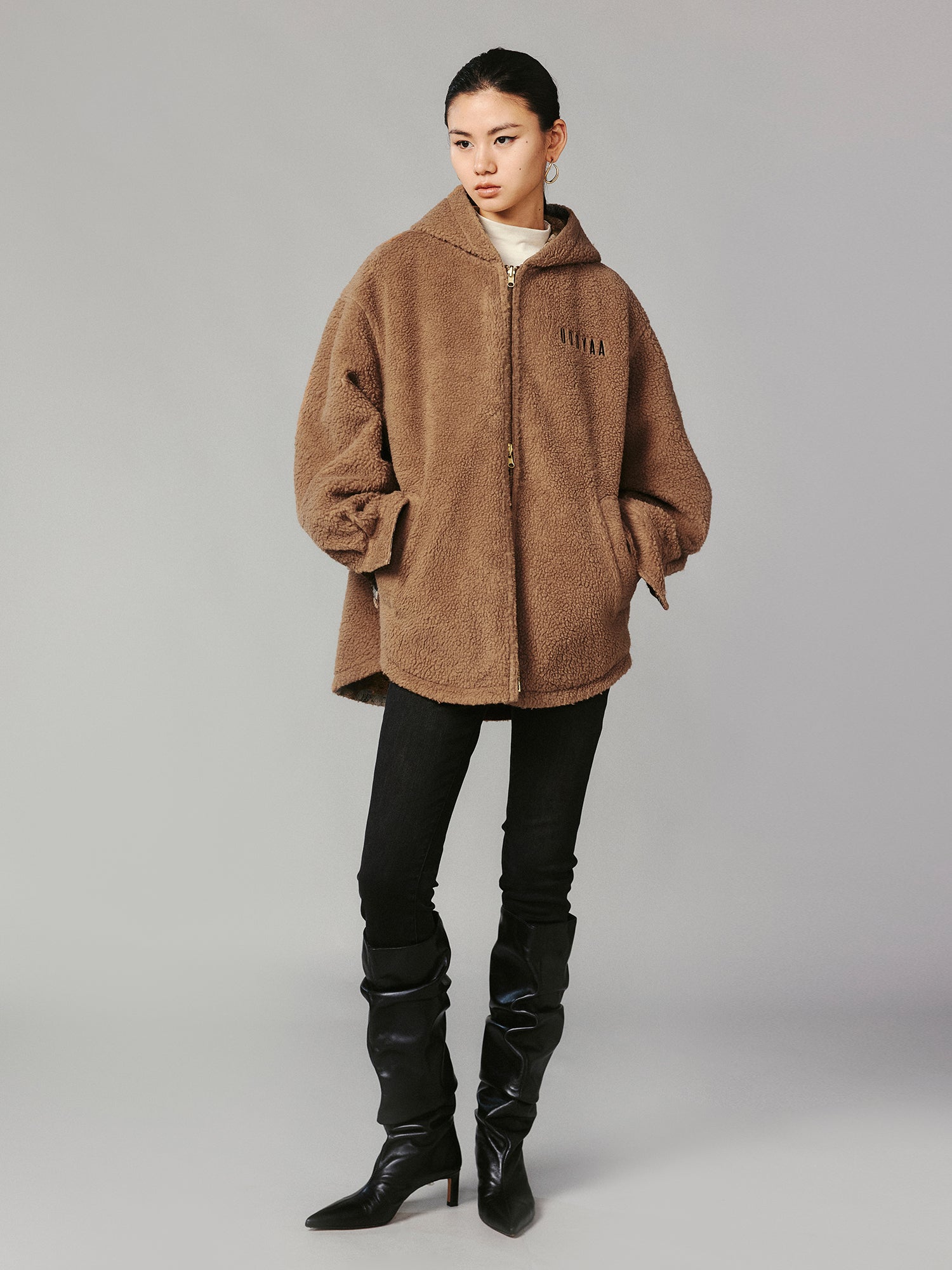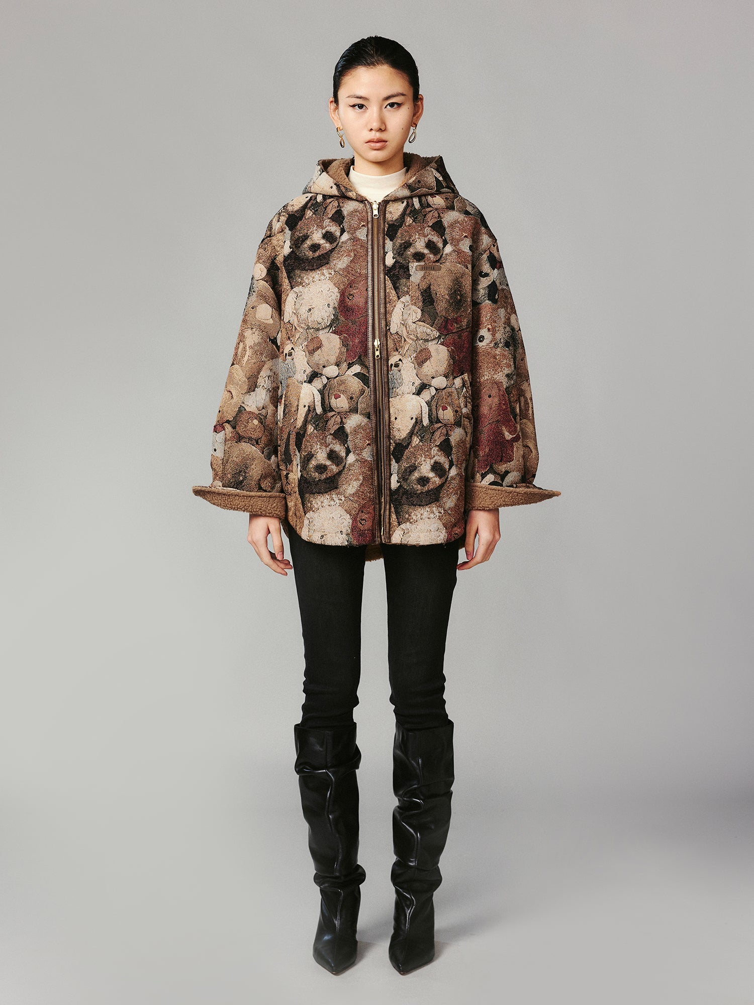 A reversible jacket featuring blanket fabric adorned with stacked vintage plush toys on one side and soft, delicate lambswool on the other. Warm, stylish, and playfully charming.