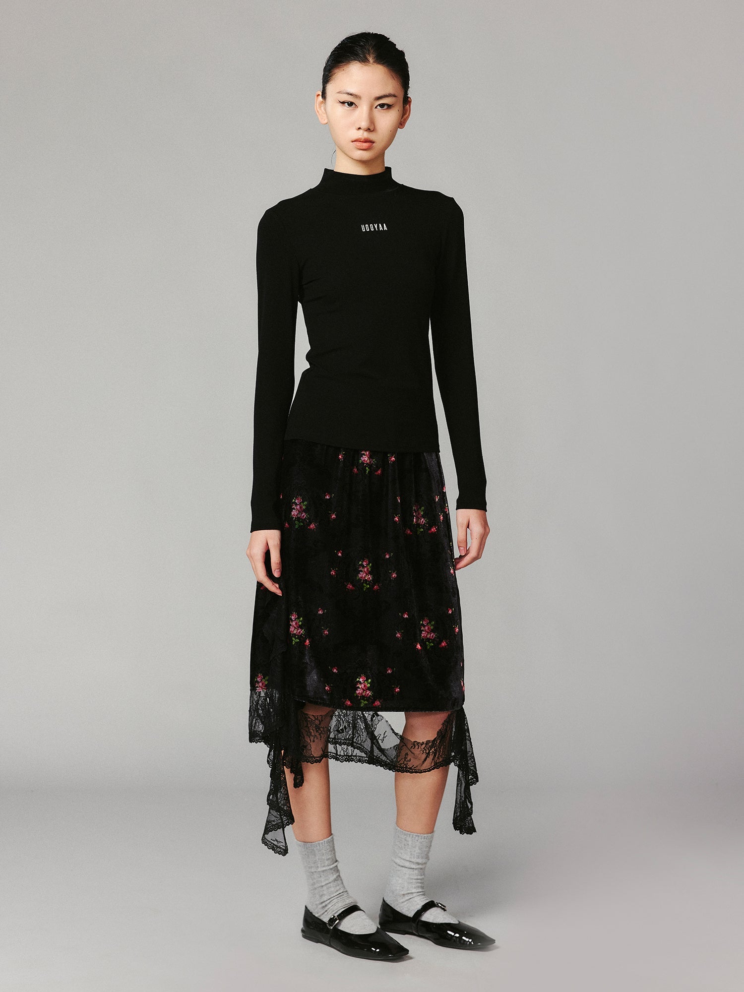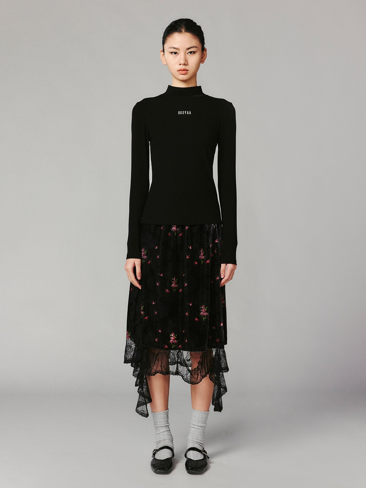 A comfortable black stand collar pullover, featuring contrasting off-white logo embroidery. The piece exudes a premium texture, combining simplicity with versatile style.