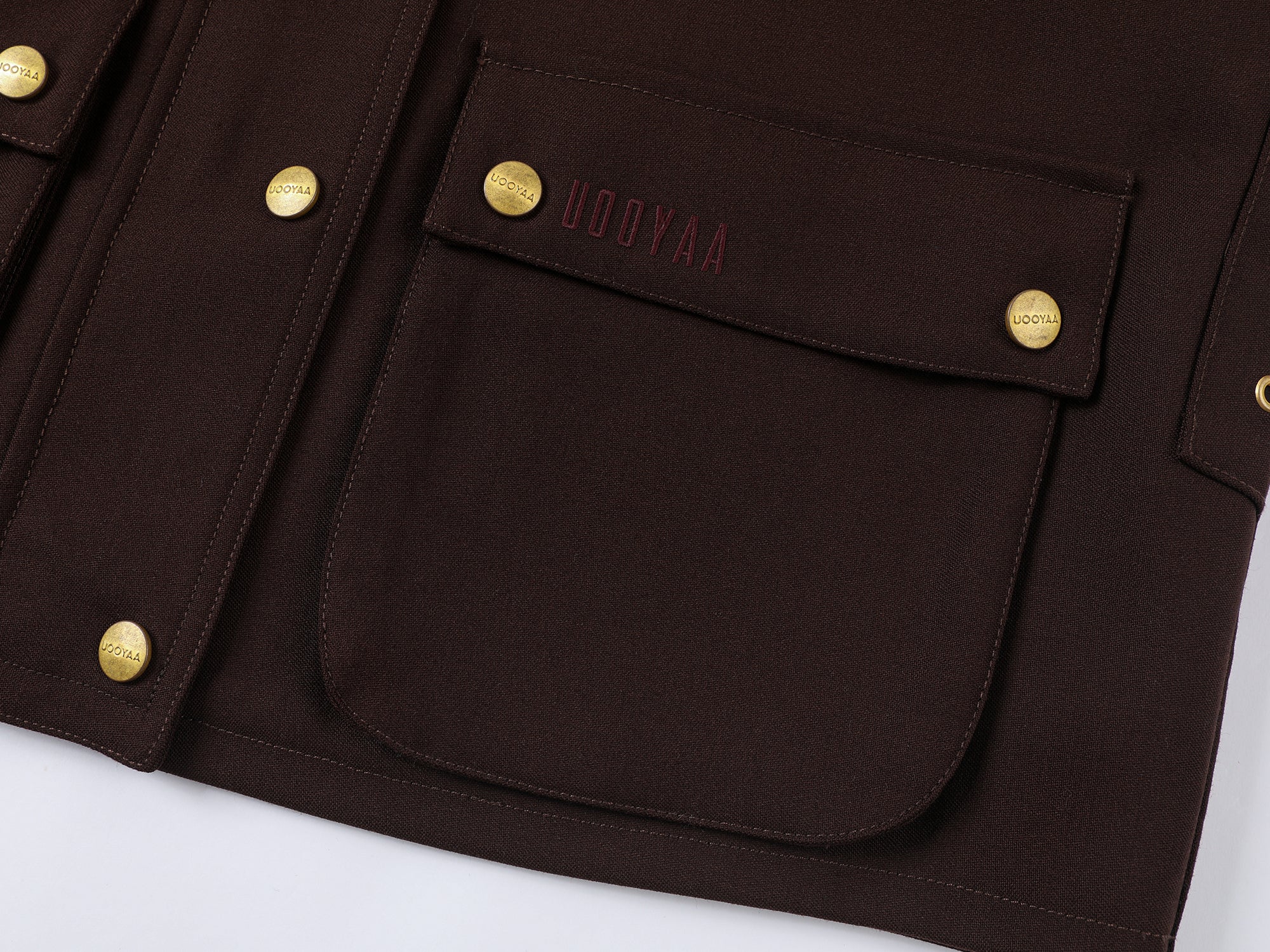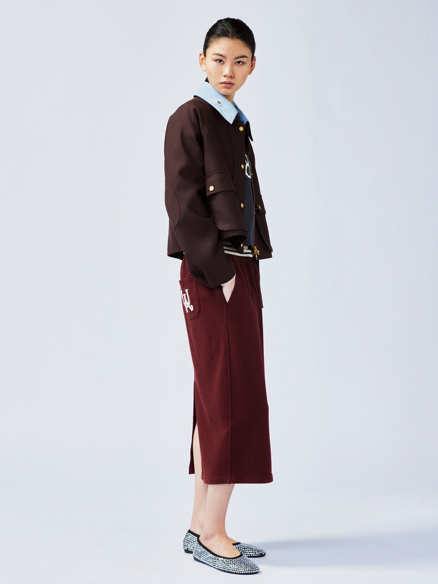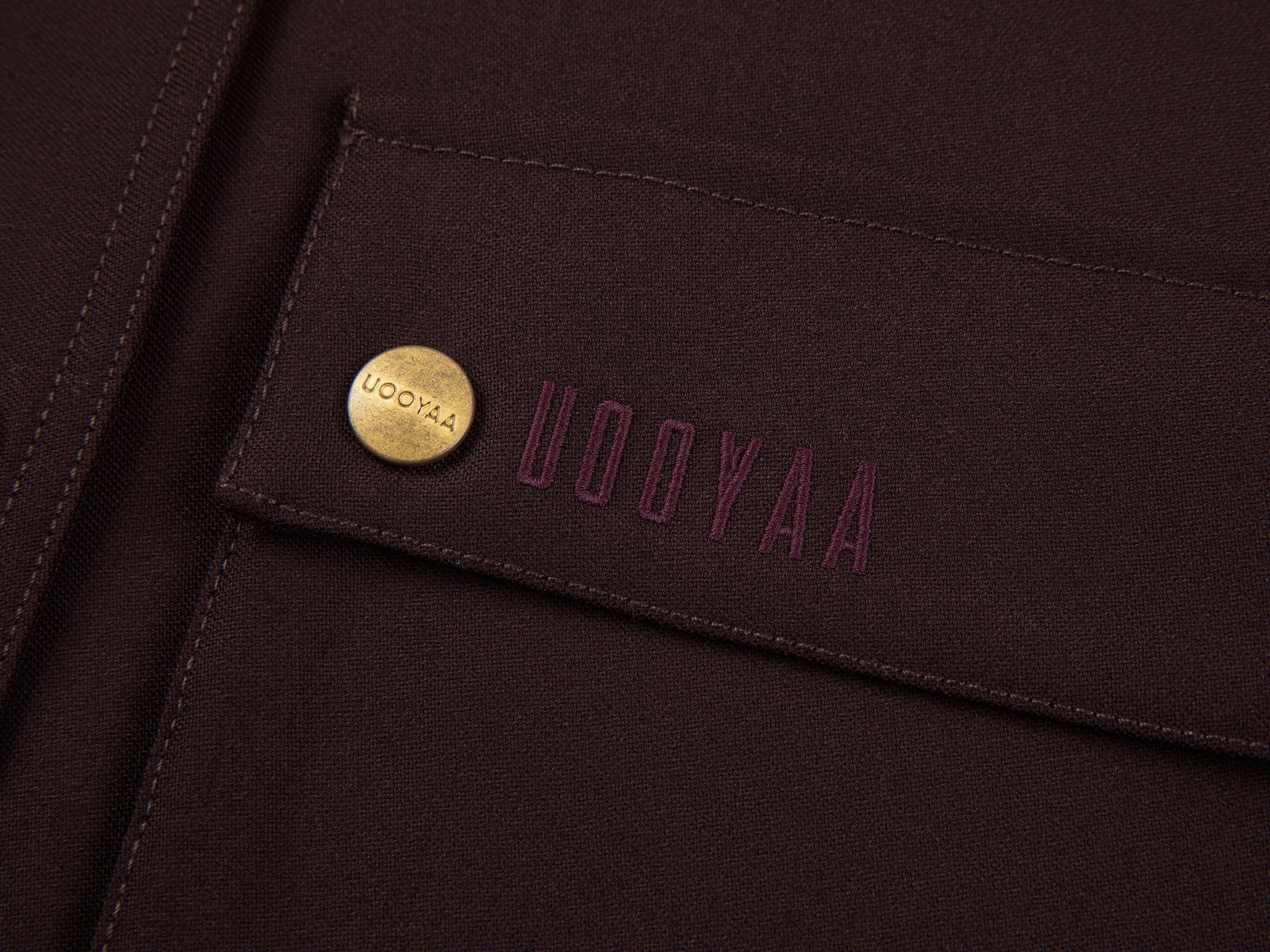 Burgundy fine wool blended with blue corduroy collar, adorned with gold buttons. A fusion of classic and youthful elements, showcasing rich layers and a high-end feel.