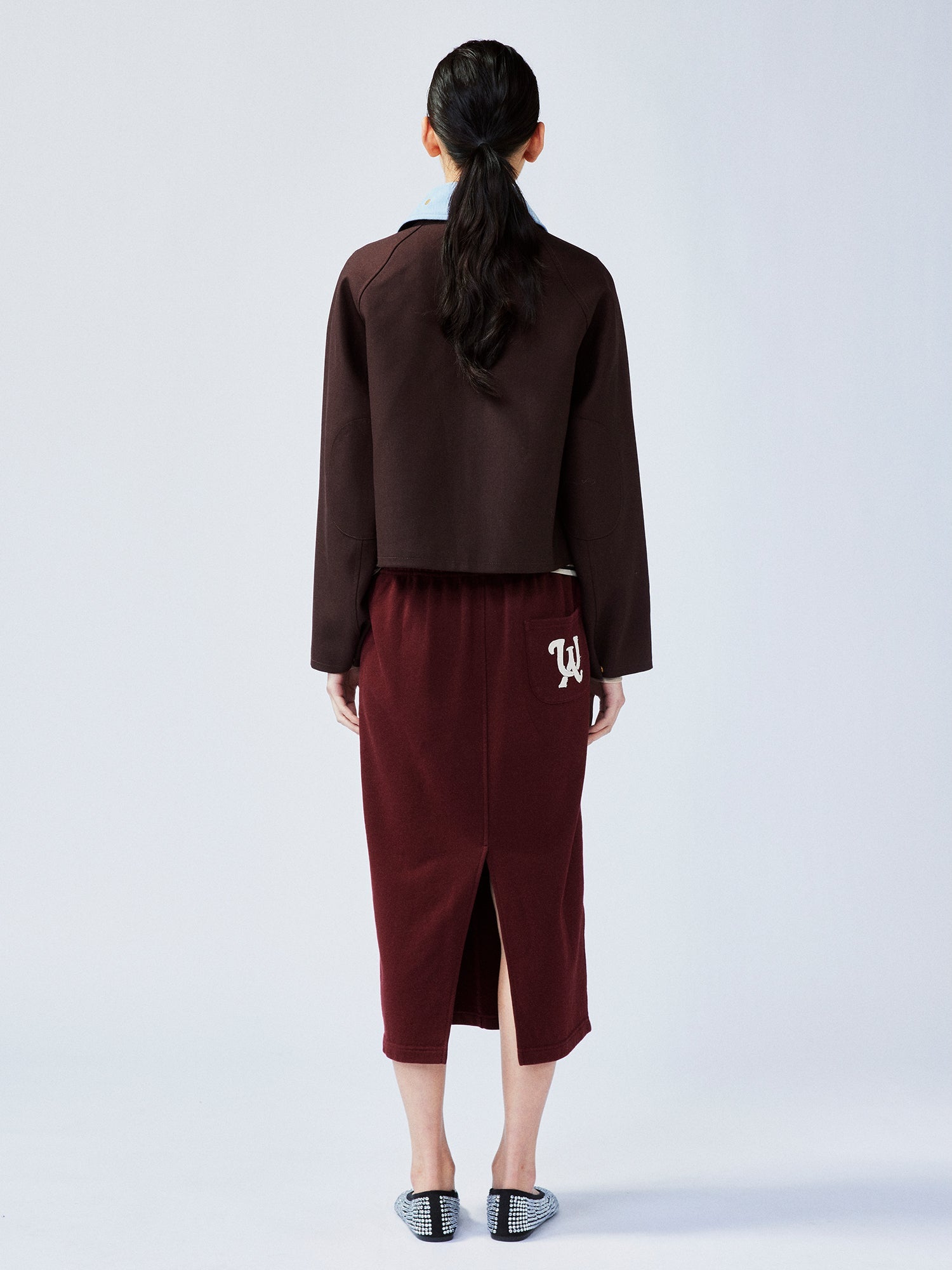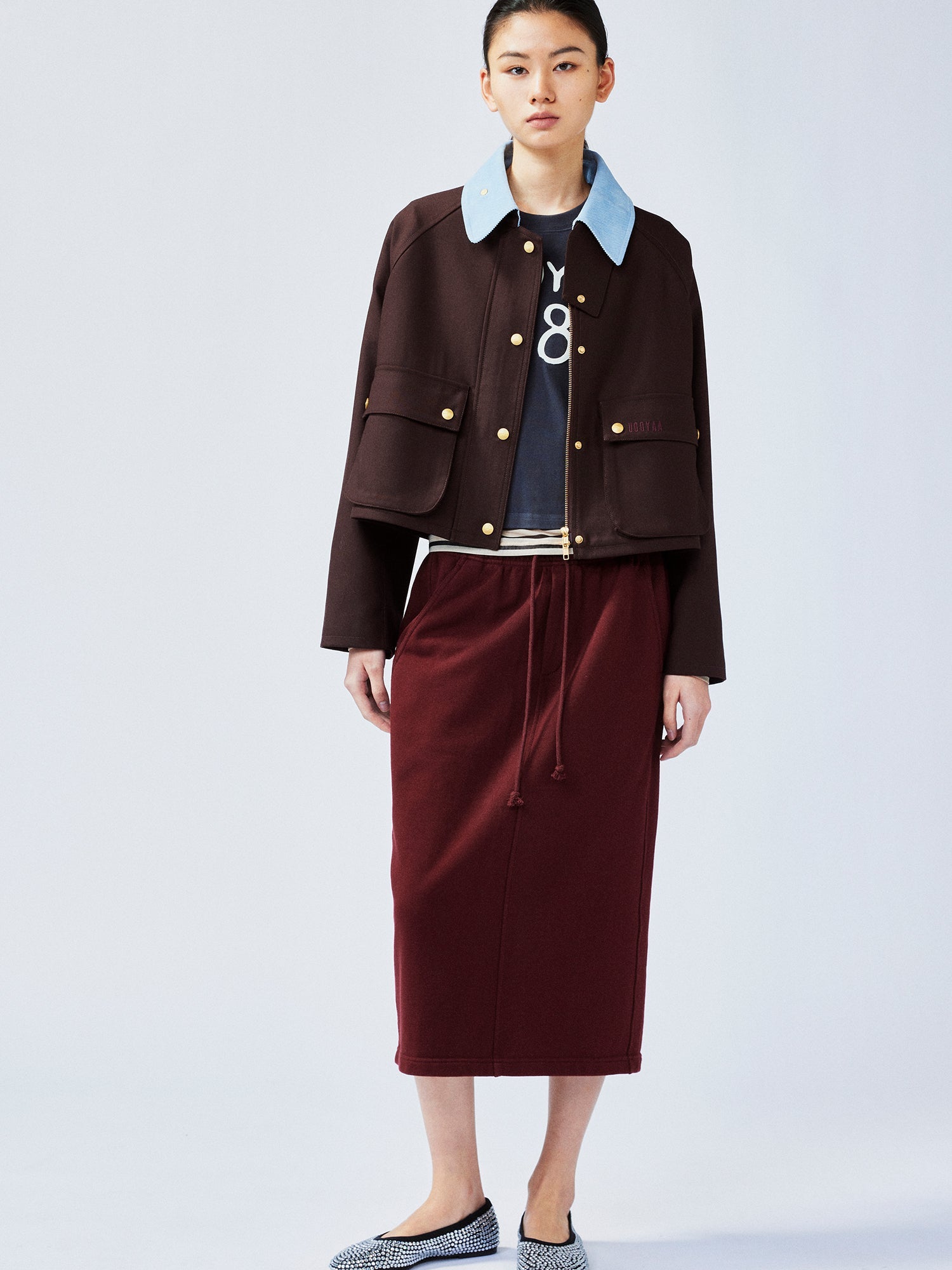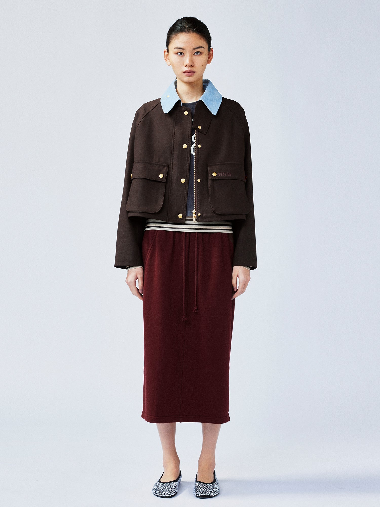 Burgundy fine wool blended with blue corduroy collar, adorned with gold buttons. A fusion of classic and youthful elements, showcasing rich layers and a high-end feel.