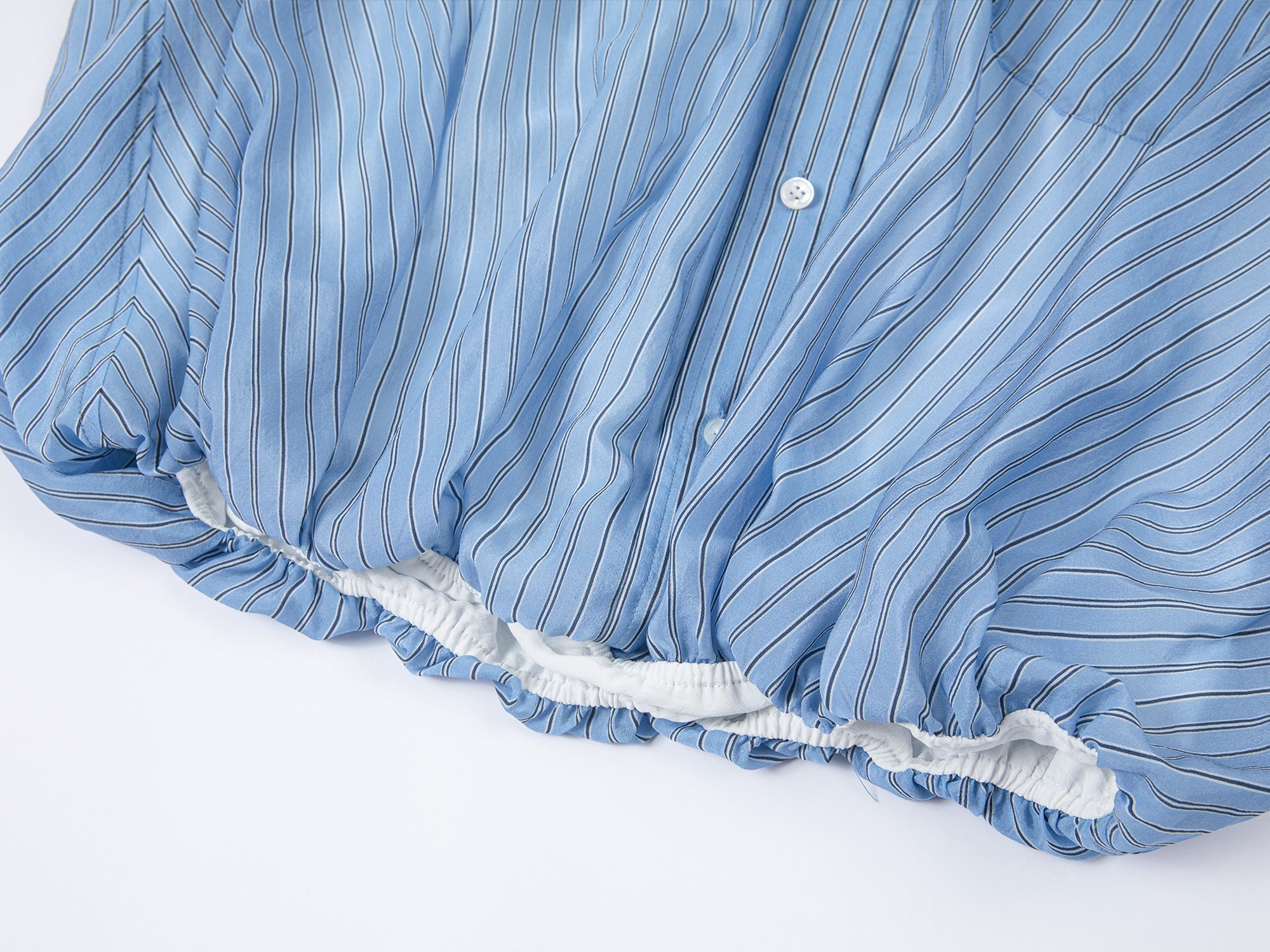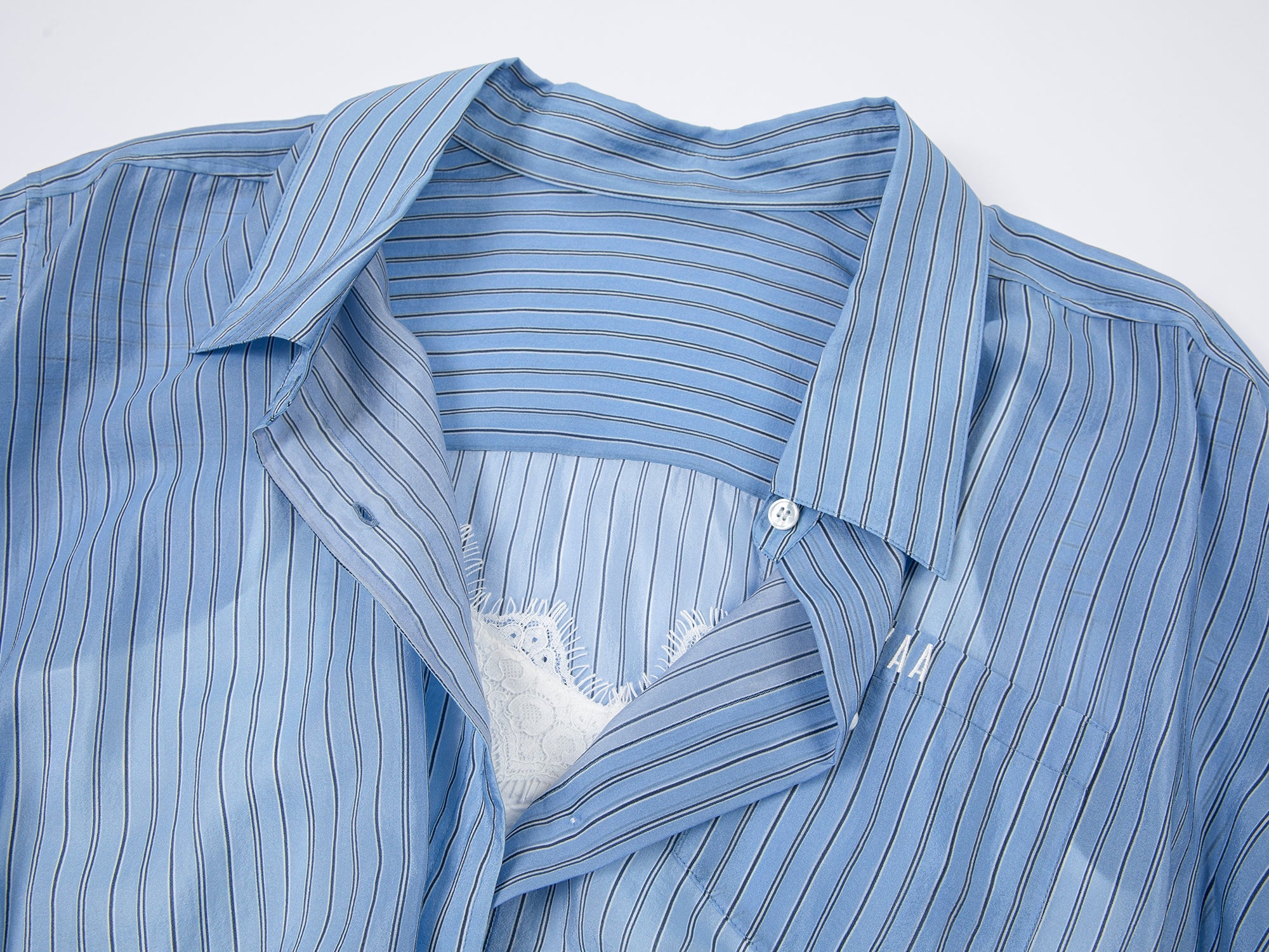 We combine a classic men¡¯s shirt with a lace camisole hem to create a casual, everyday look. The gathered hem forms a tulip shape for a playful touch.