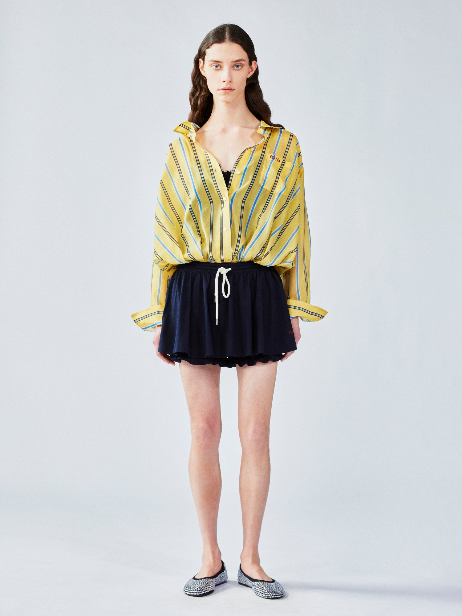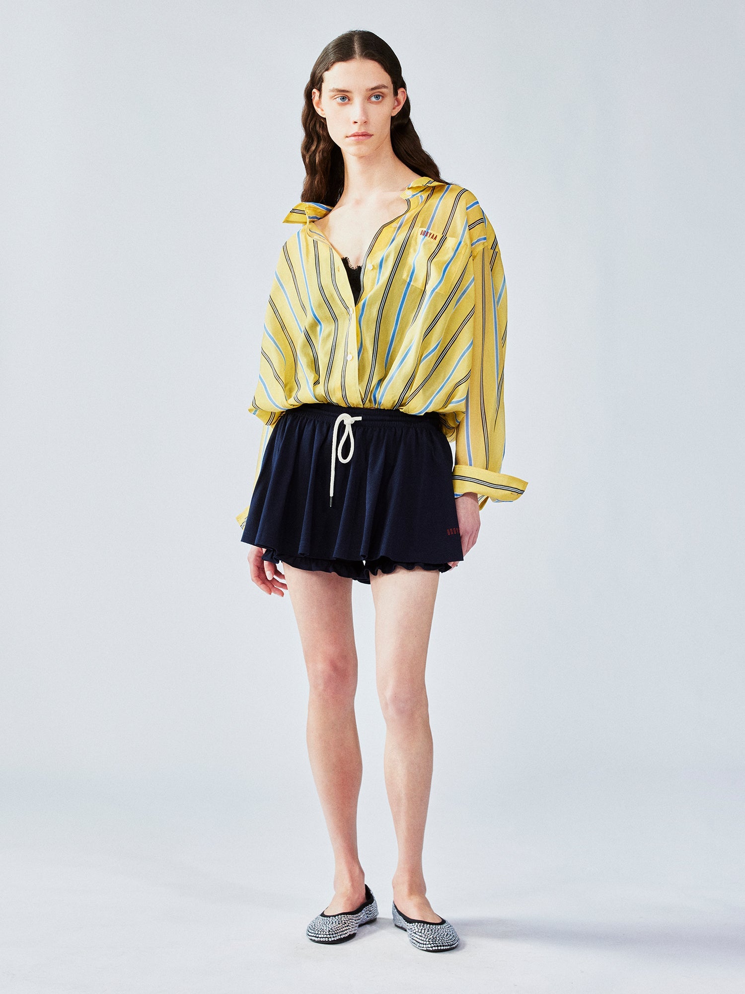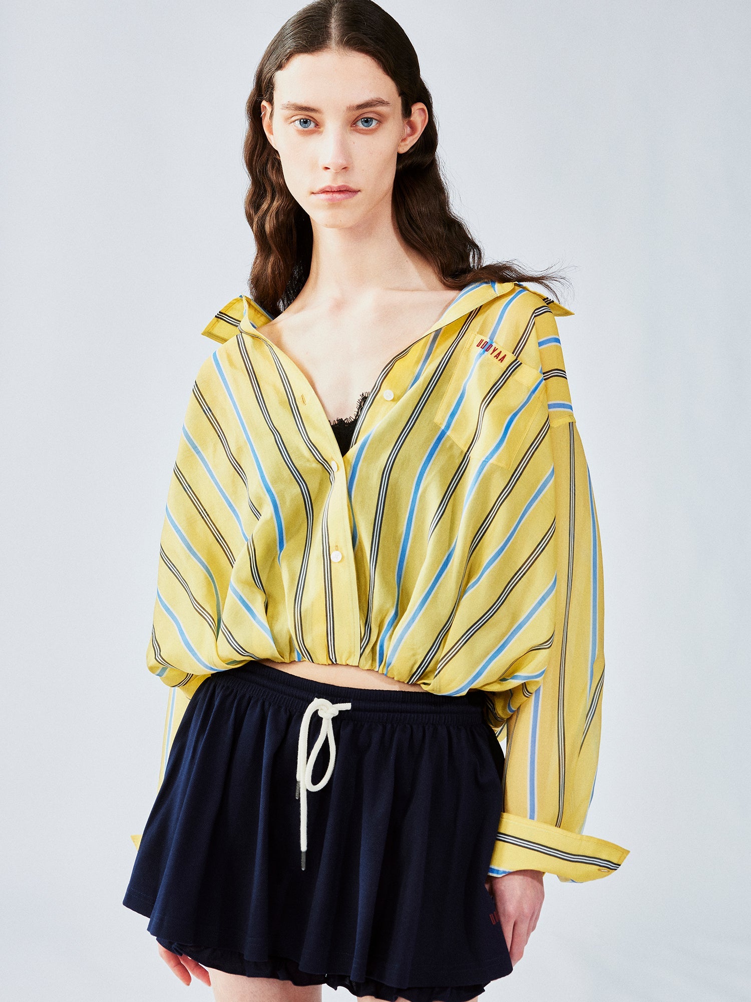 We combine a classic men¡¯s shirt with a lace camisole hem to create a casual, everyday look. The gathered hem forms a tulip shape for a playful touch.