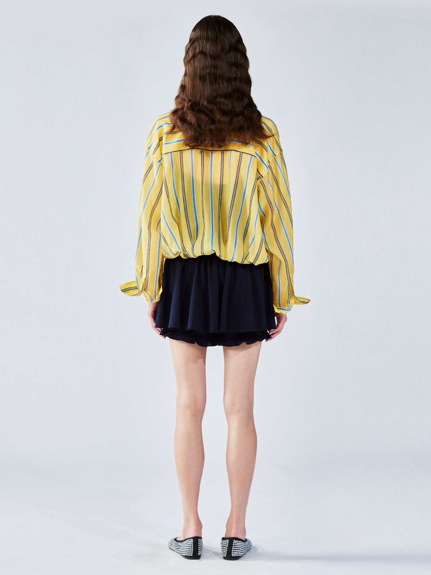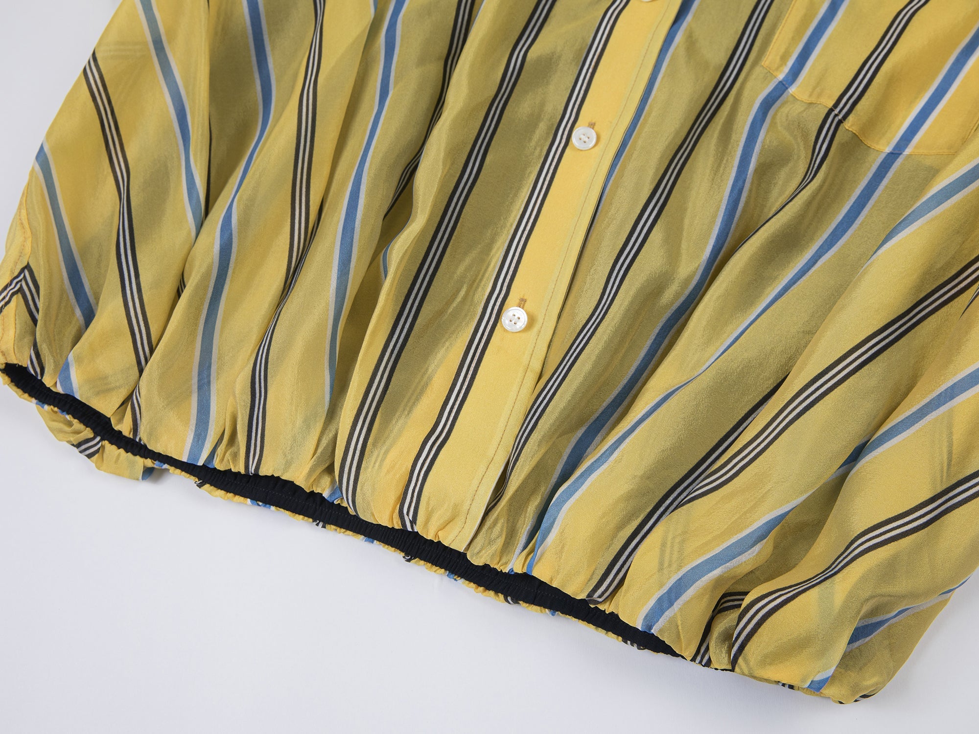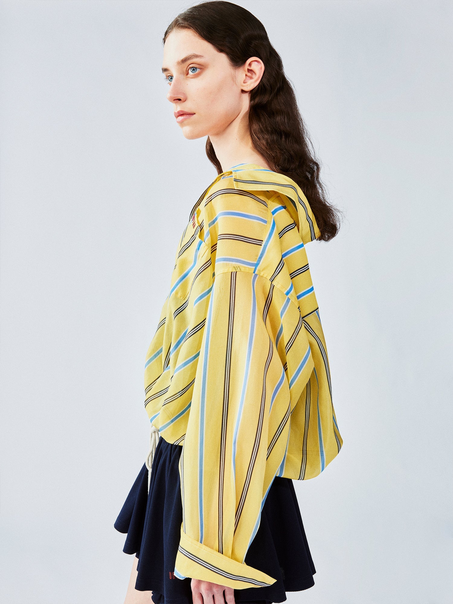 We combine a classic men¡¯s shirt with a lace camisole hem to create a casual, everyday look. The gathered hem forms a tulip shape for a playful touch.