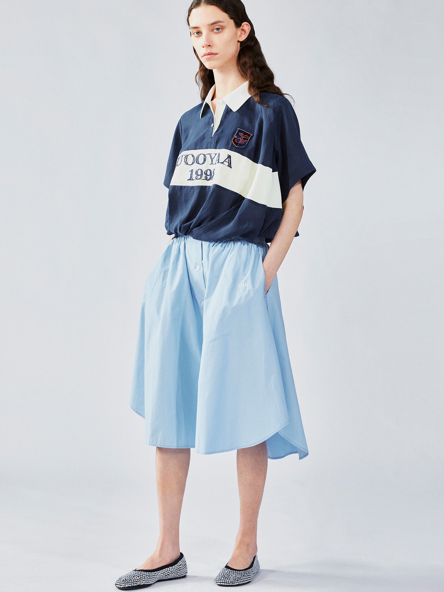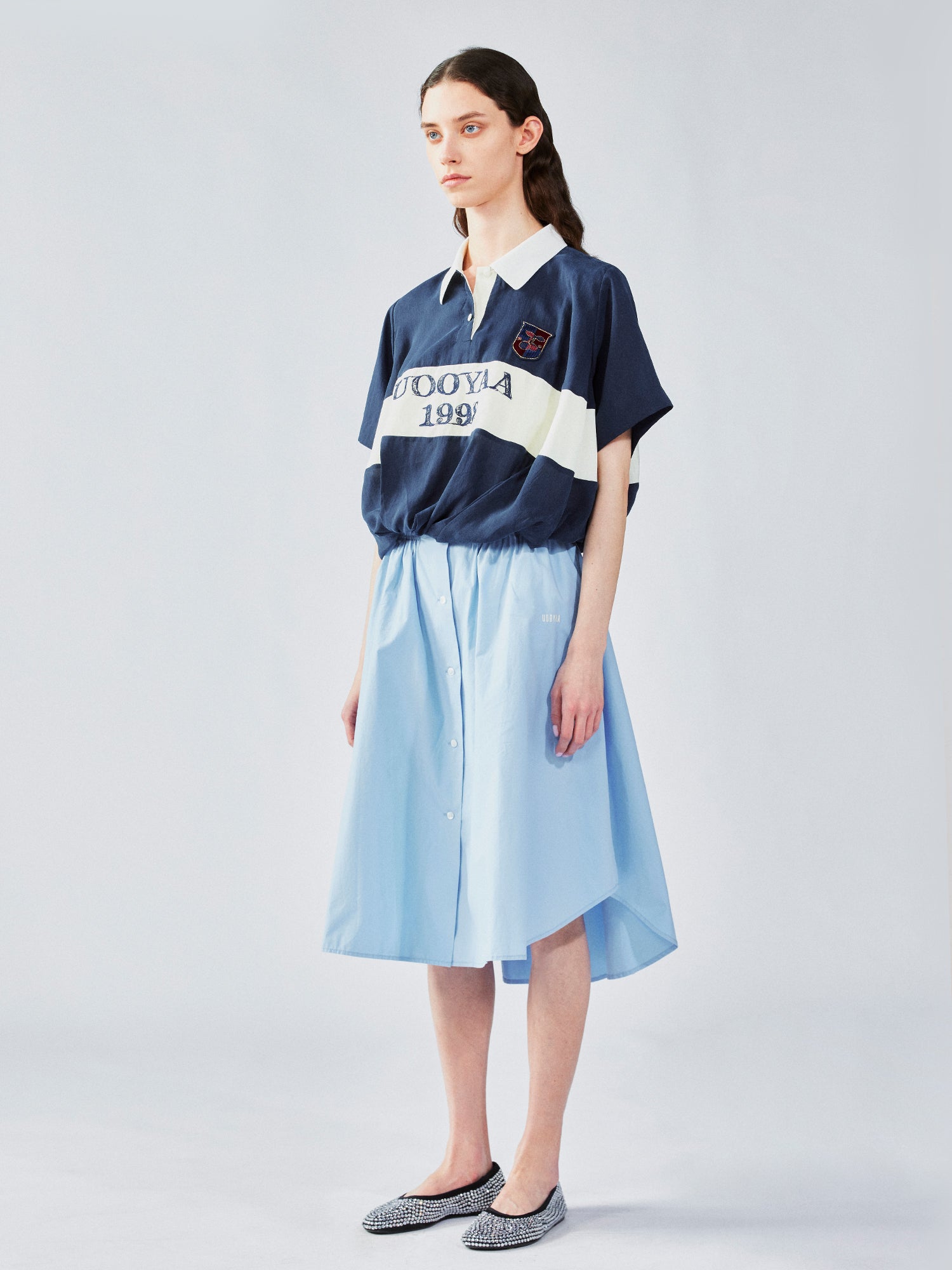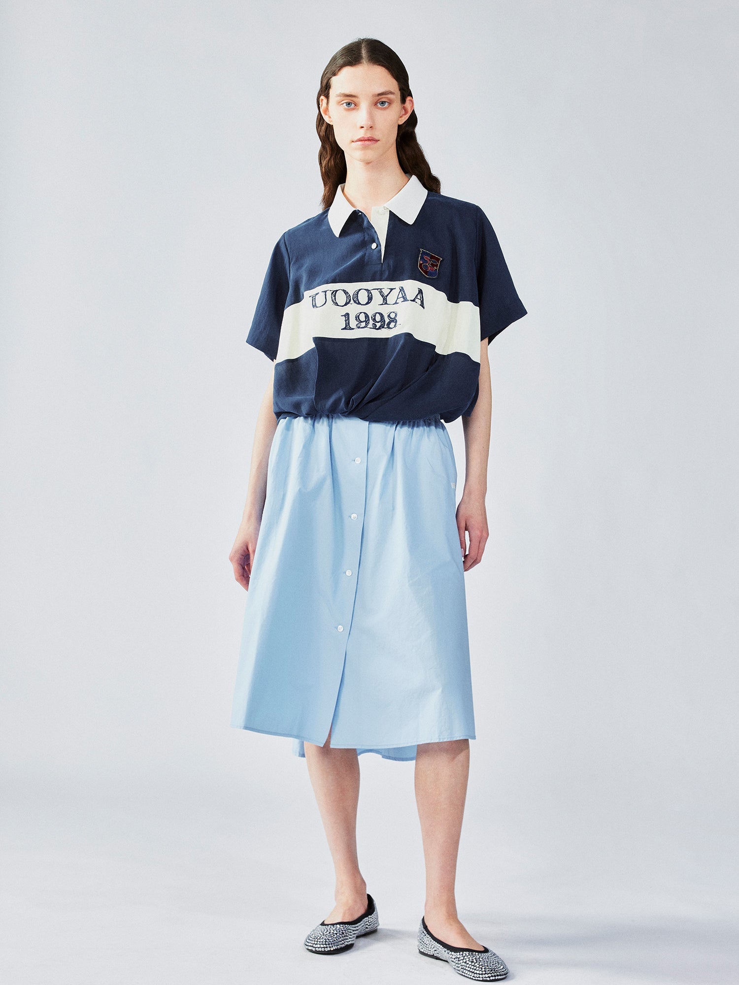 We crop the hem of a striped polo into a tulip shape, bringing out a lively, fun silhouette.