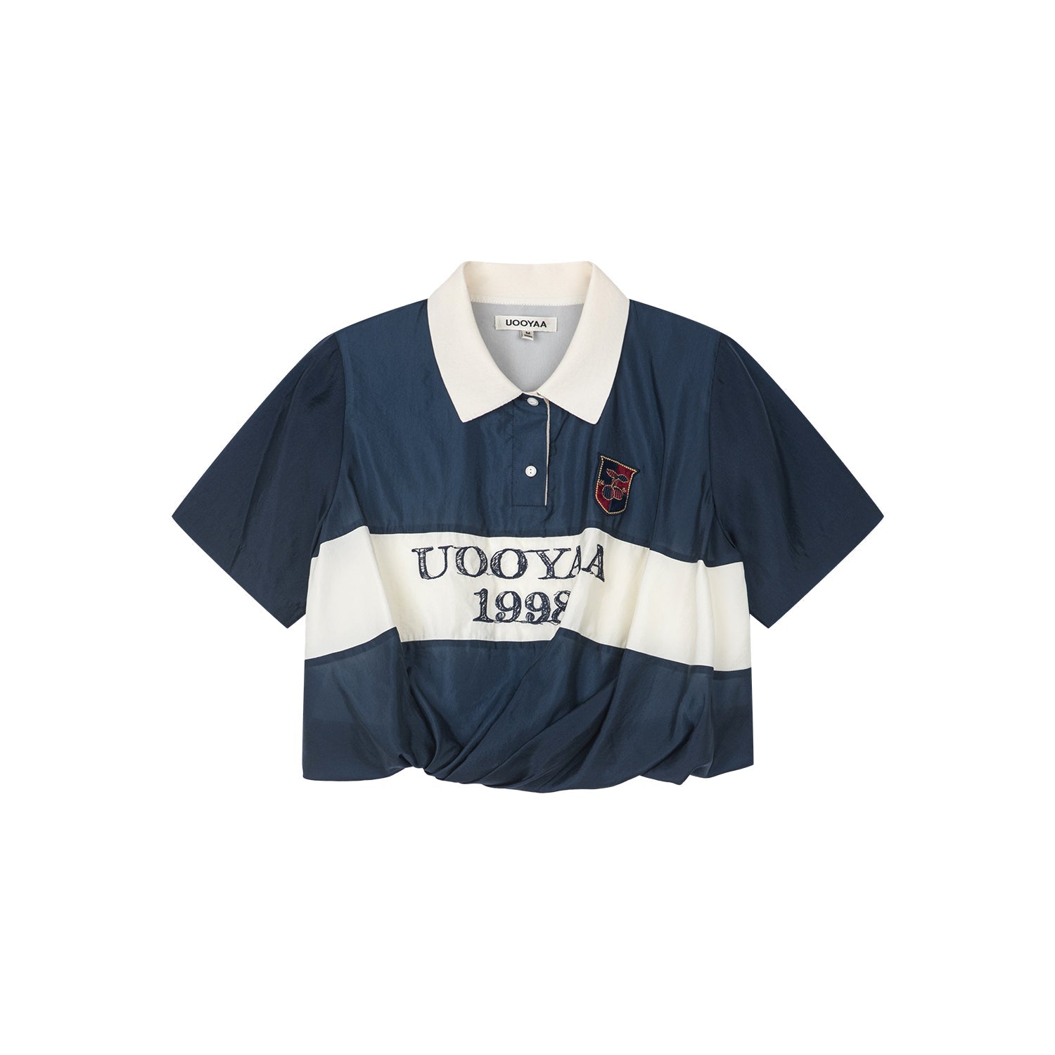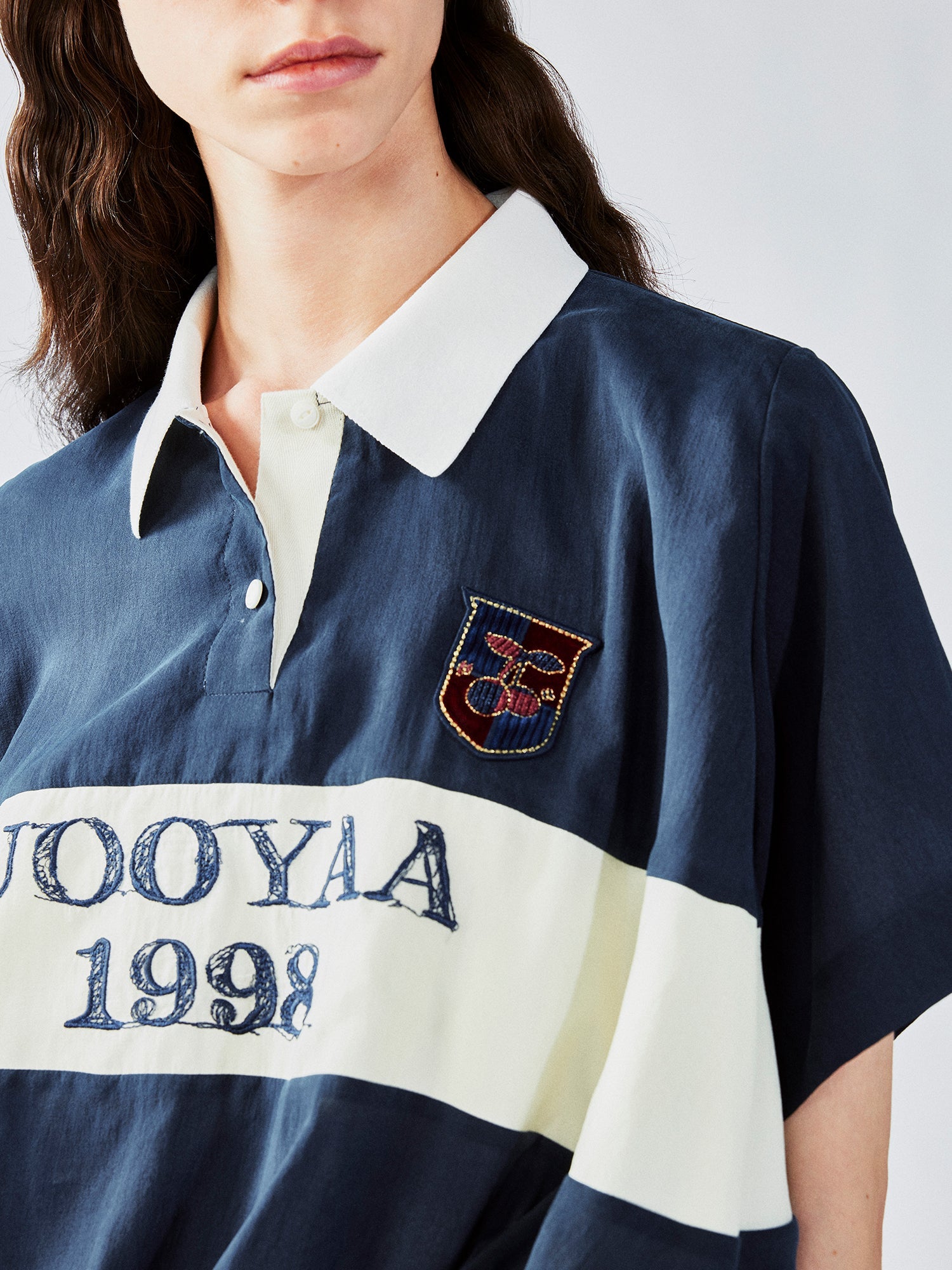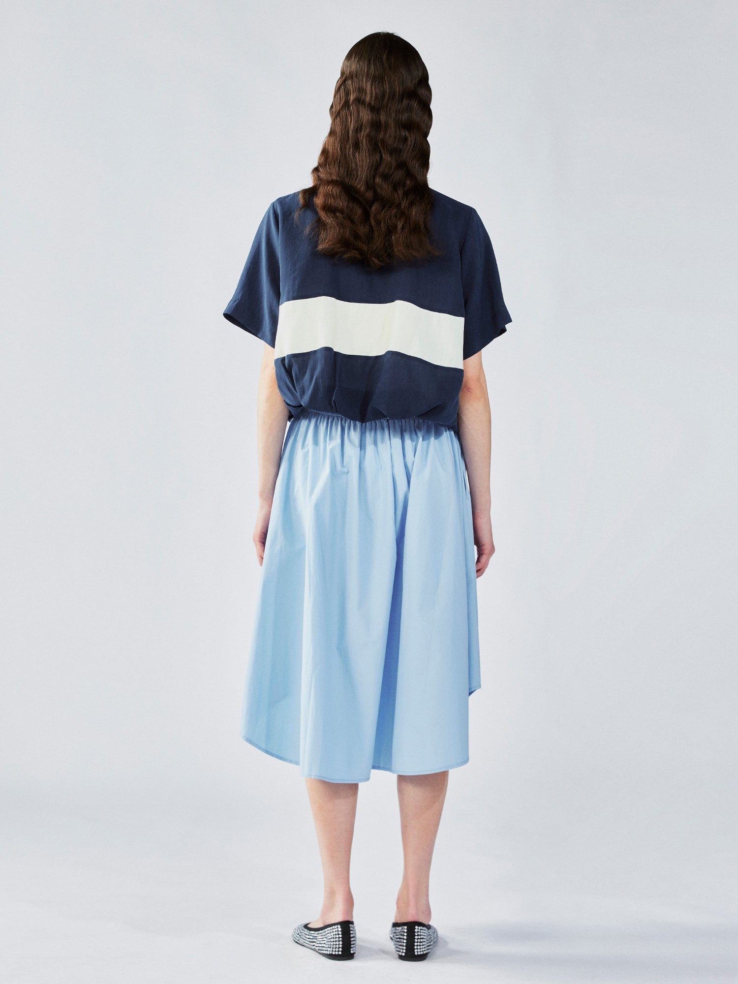 We crop the hem of a striped polo into a tulip shape, bringing out a lively, fun silhouette.