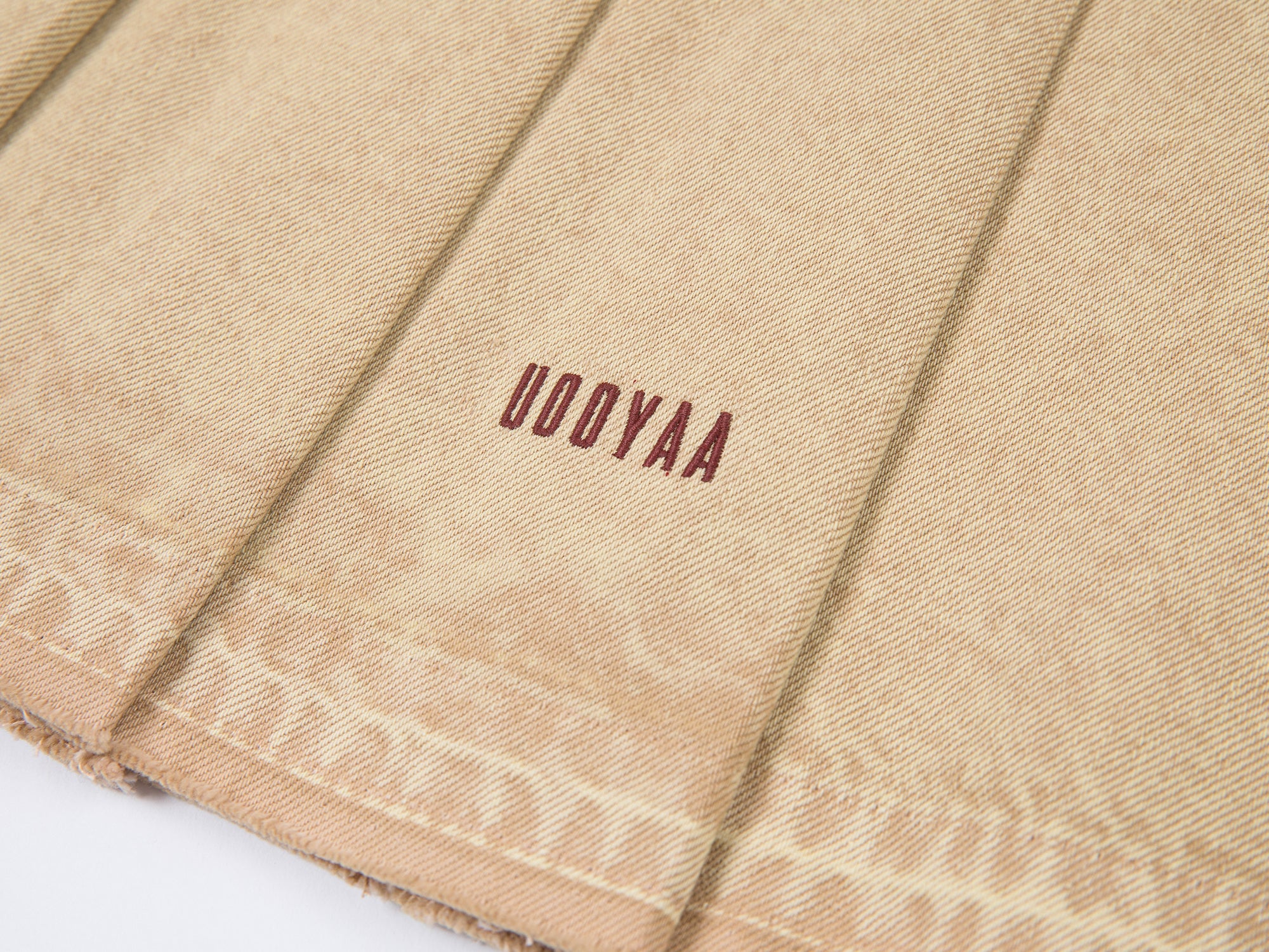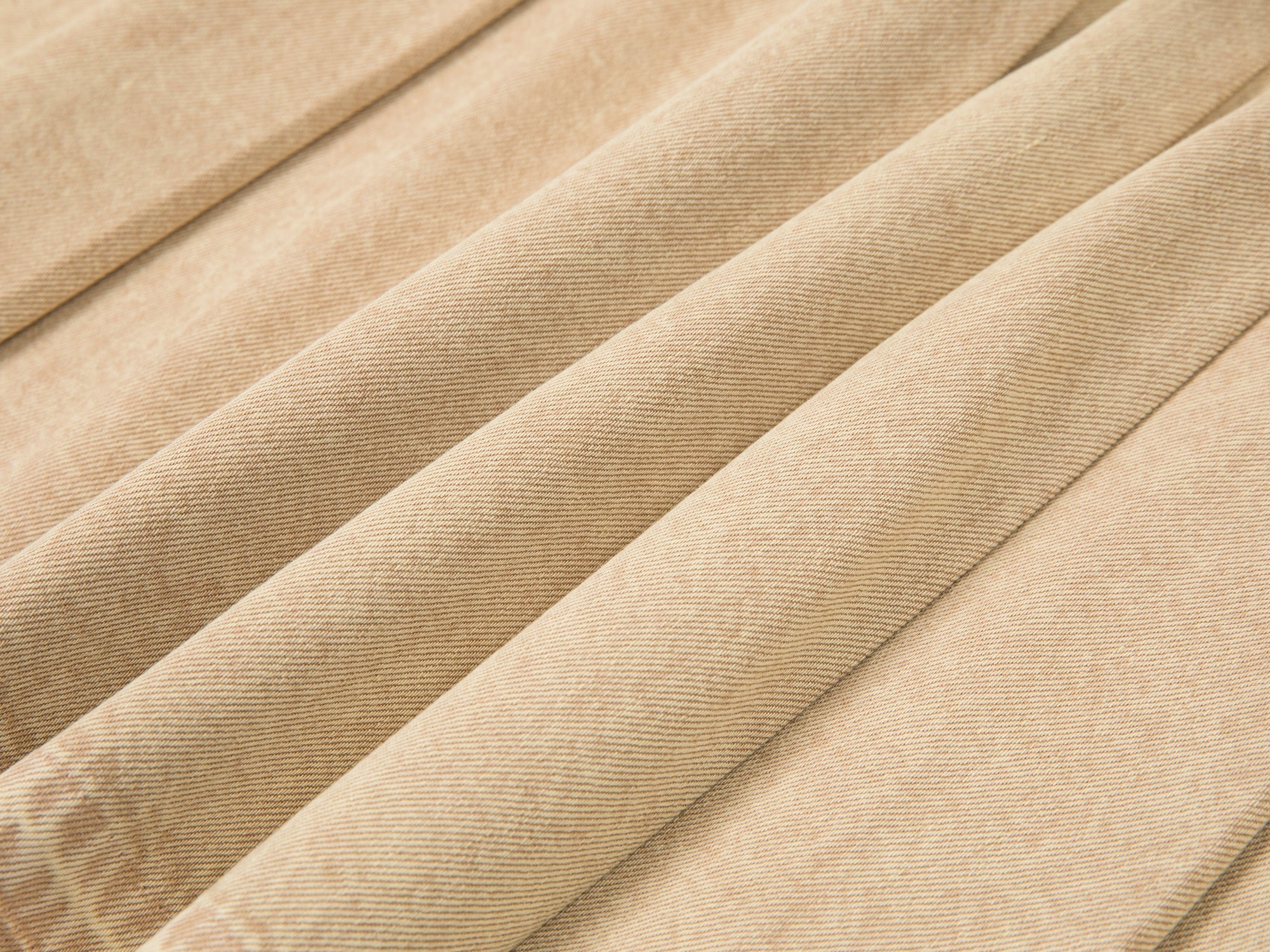We reshape a pleated short skirt in denim for a stiff, structured flare. Raw-edged hems bring a carefree, rebellious mood.