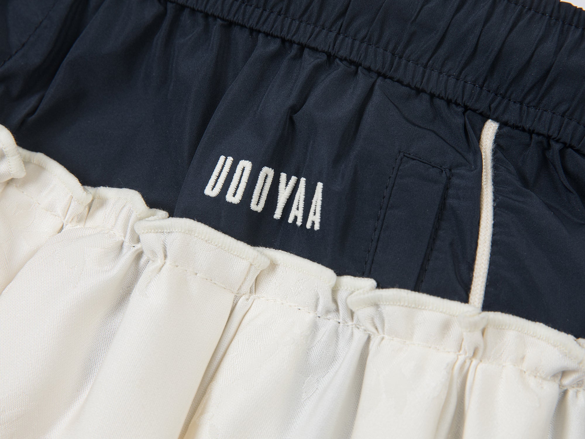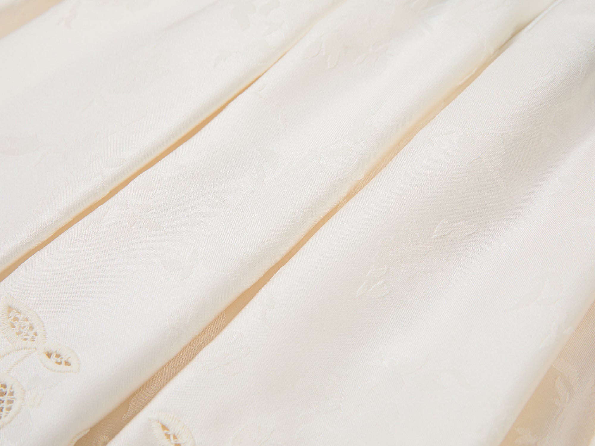 Athletic fabric meets satin jacquard for a dynamic combination. Openwork embroidery at the hem pairs with lace trim for a refined finish.