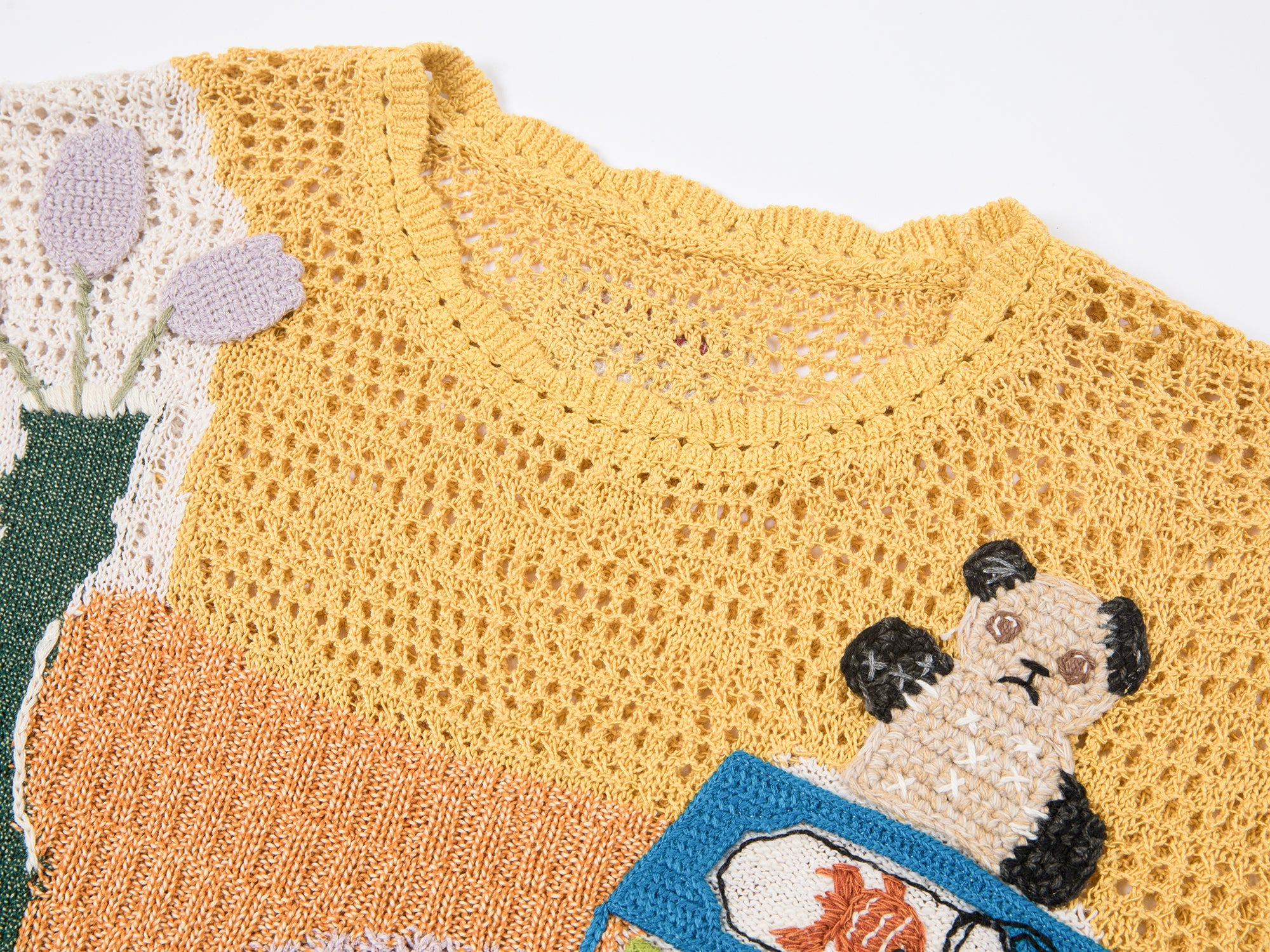 We use intarsia, hand-crochet, and seed-bead stitching for a handcrafted vibe. The openwork texture keeps it light and airy.