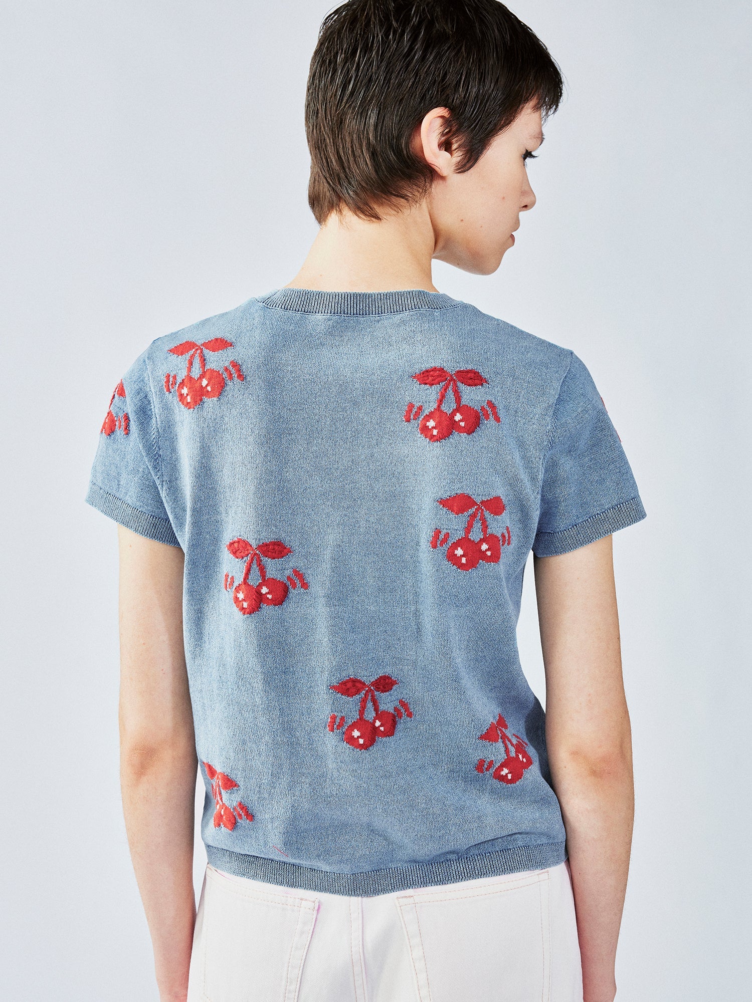 We arrange bold cherries in an asymmetrical scatter, blending jacquard with partial shaded embroidery for a 3D effect. It bursts with youthful energy.
