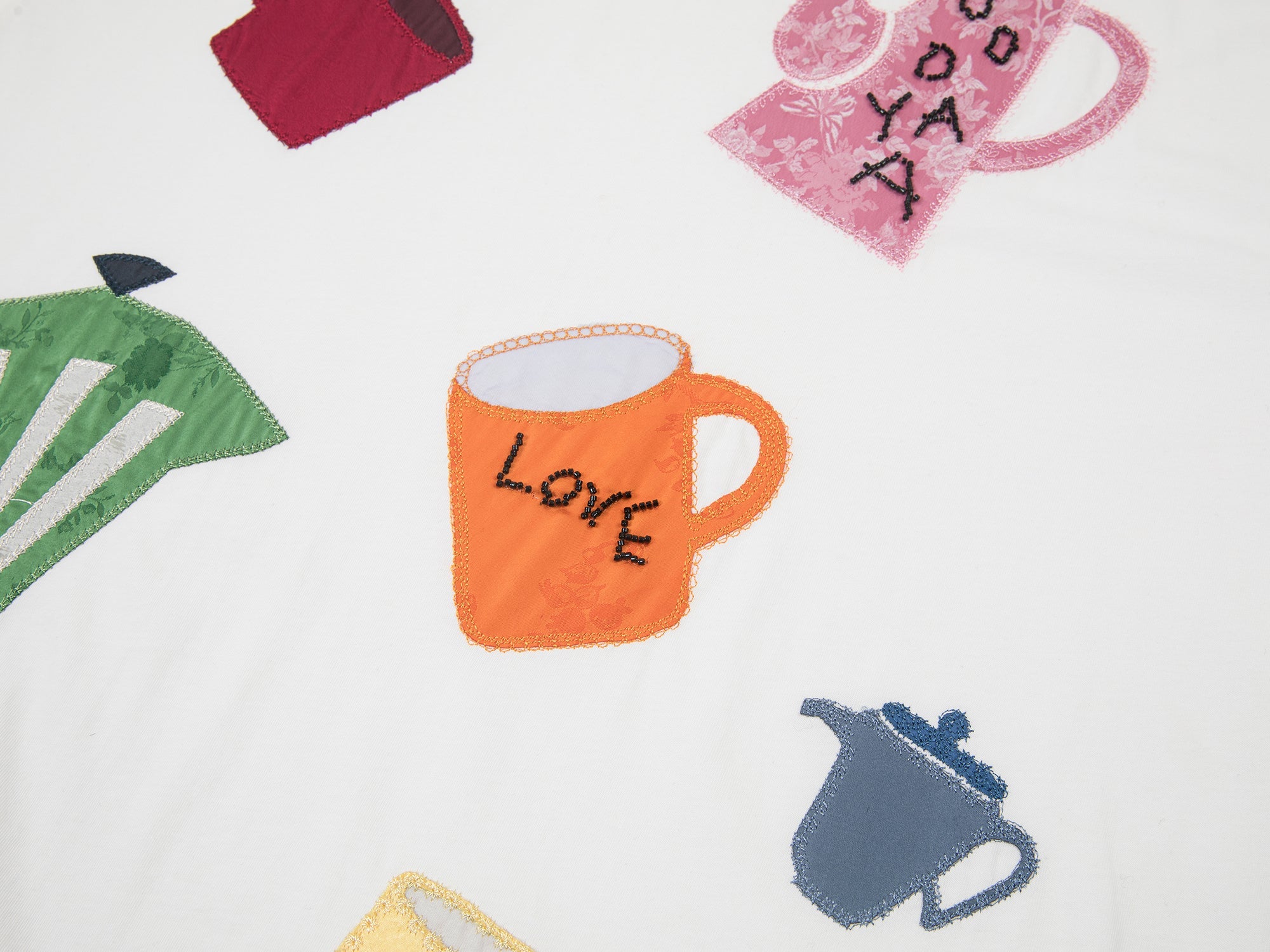 We turn everyday items like teacups into silhouette appliqués, then layer them with seed-bead accents for a fun, detailed effect.
