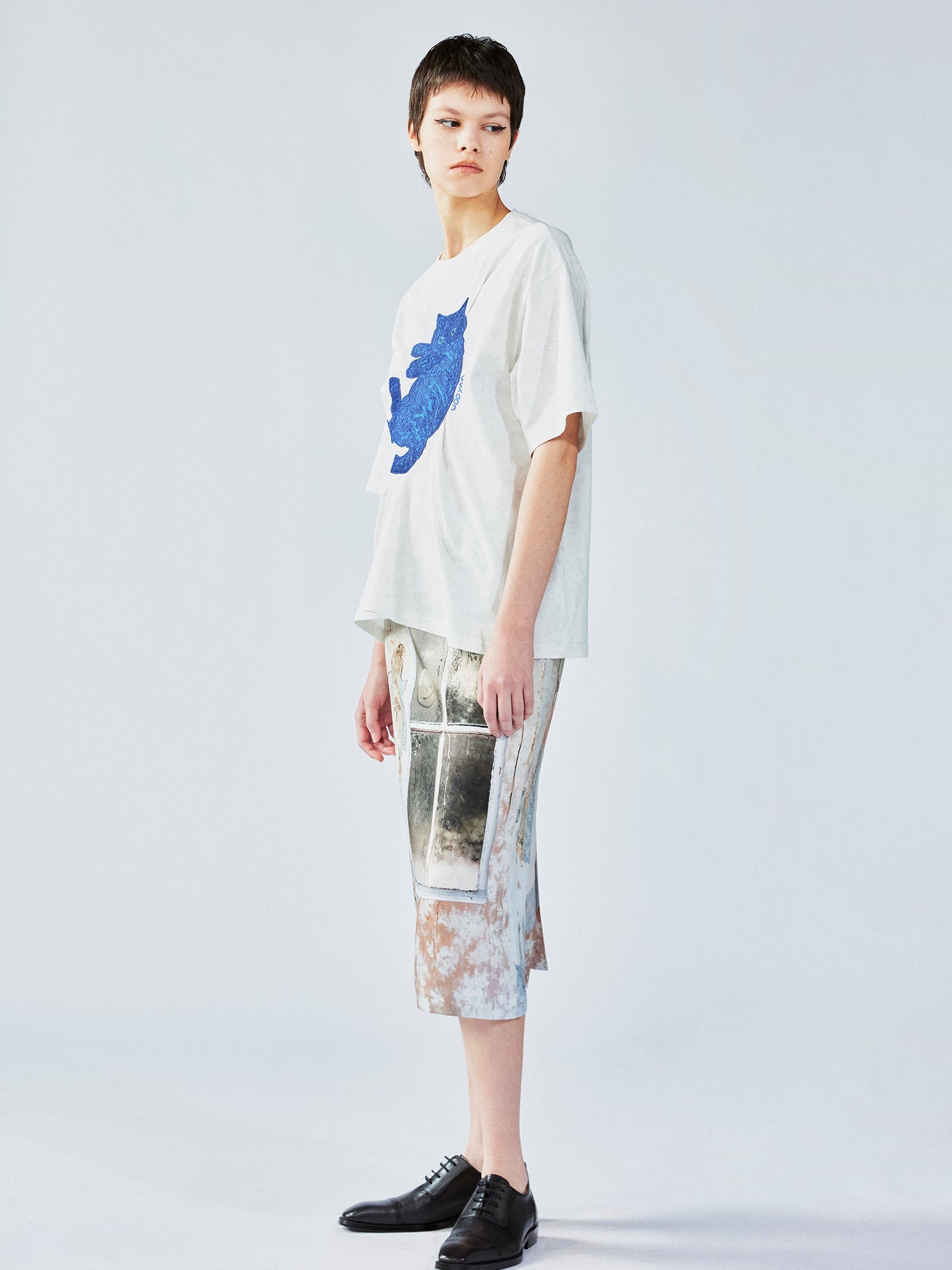 We use draping and pleating to imitate the rumpled sheets under the cat, and detailed embroidery to reproduce fur texture.