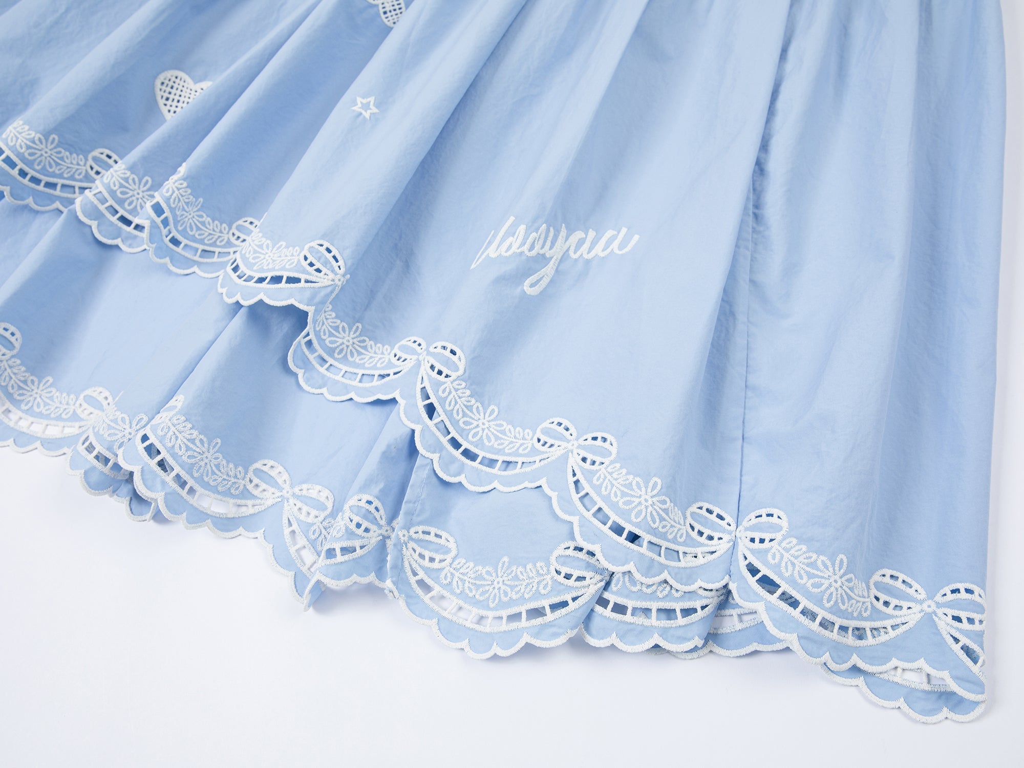 Playful angels on a soft blue dress bring pure, youthful charm.