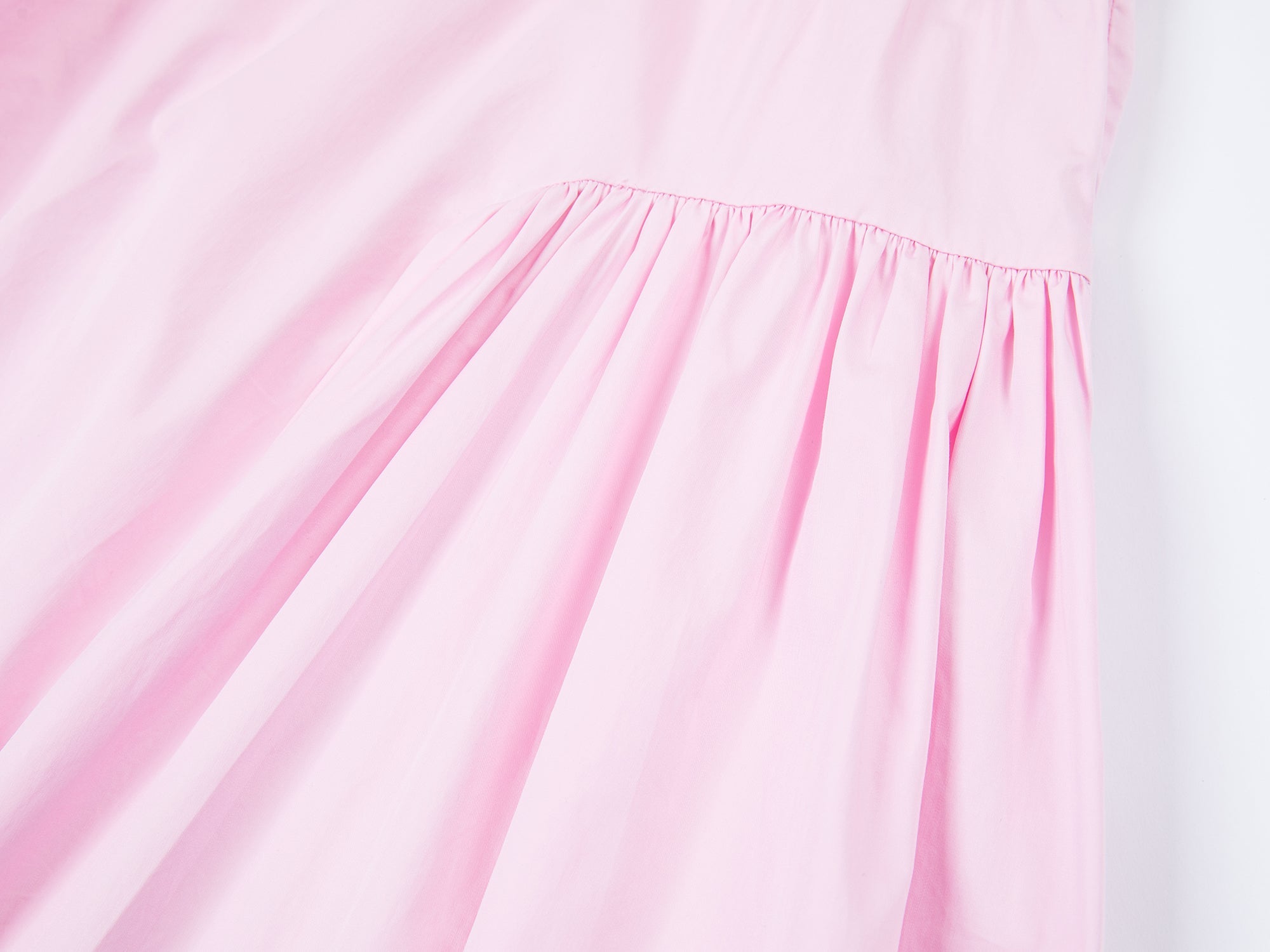 A-line camisole dress with gathered hem and handmade flower detail at the chest, balancing playfulness and romance.