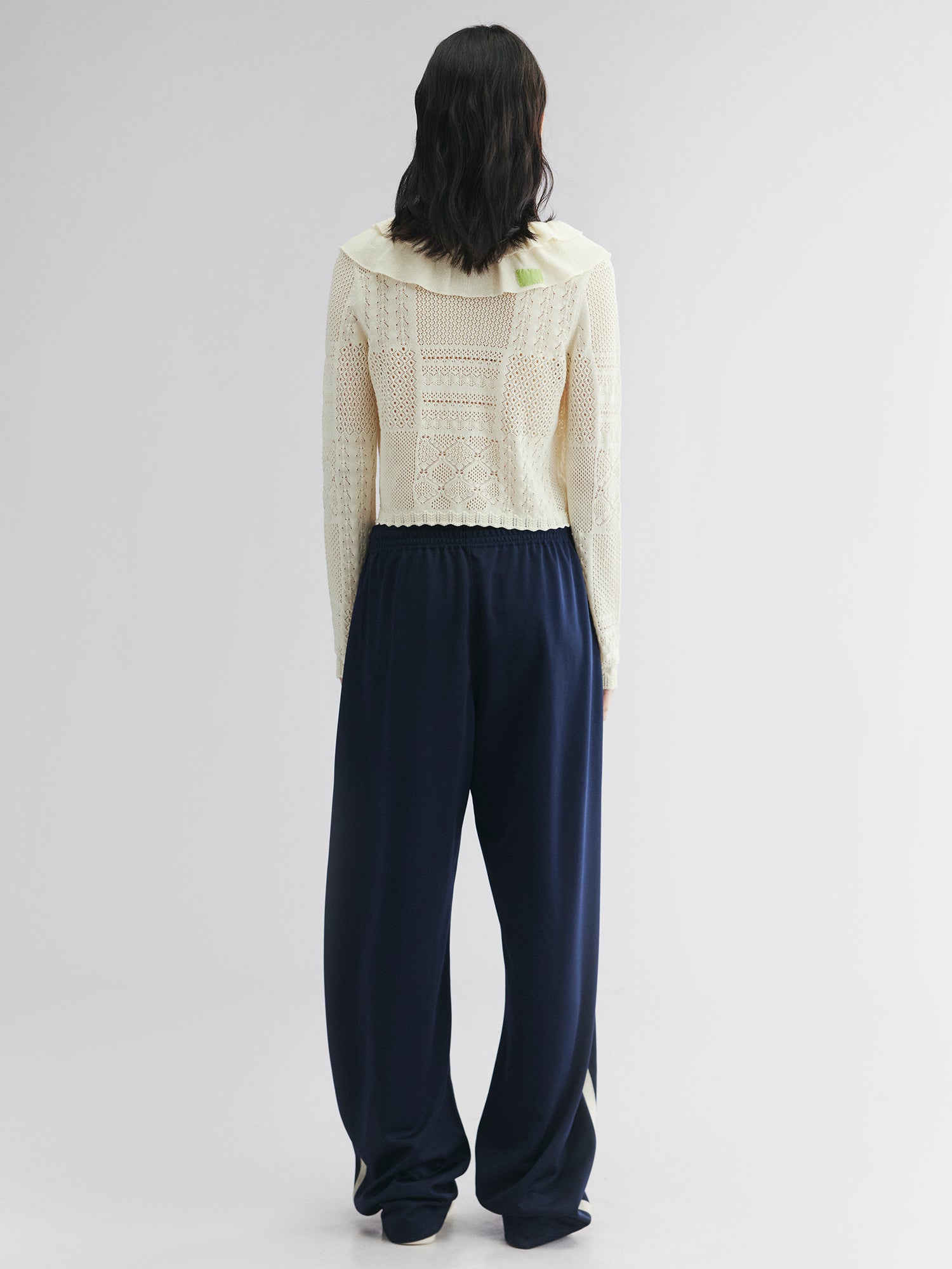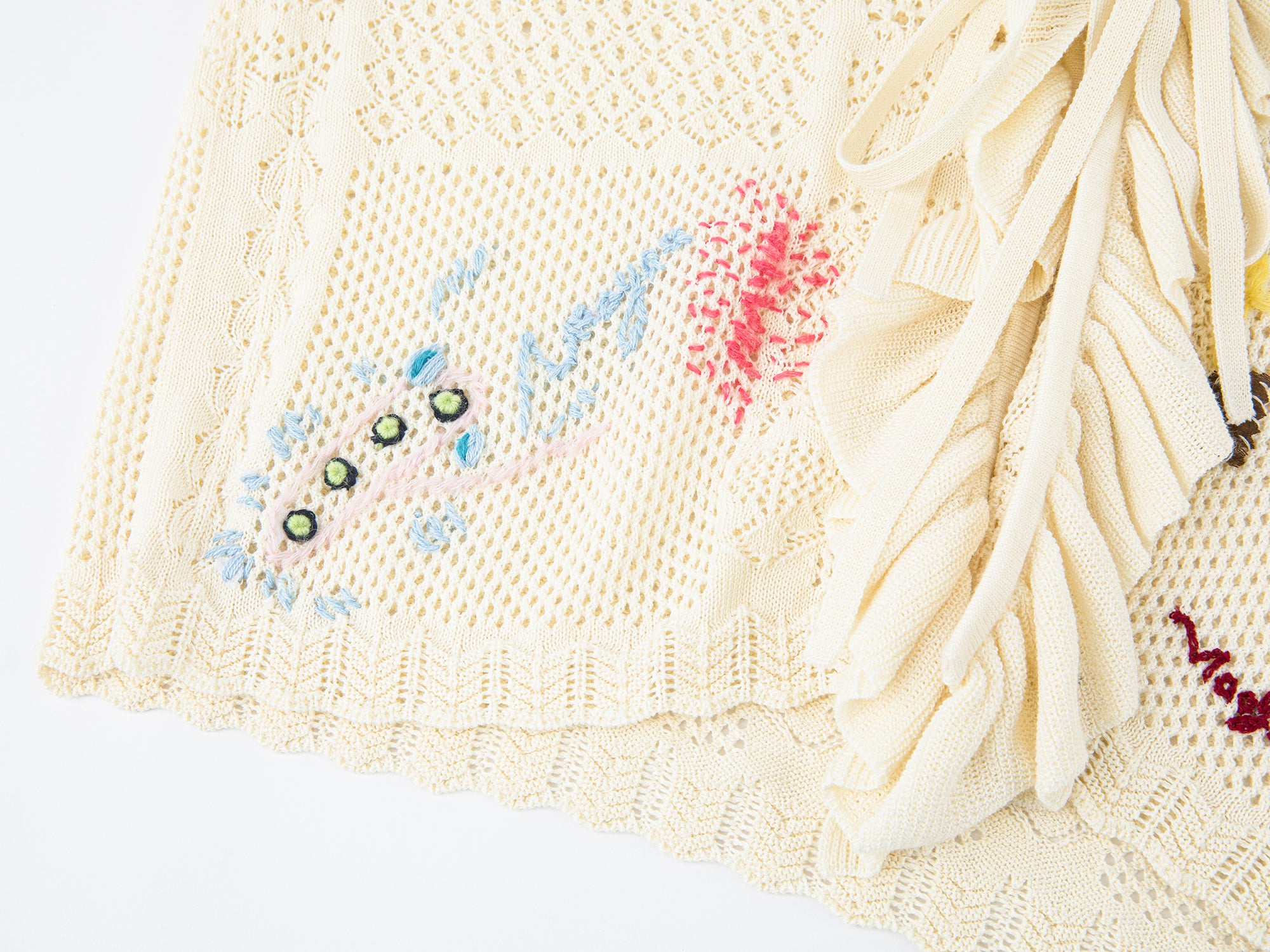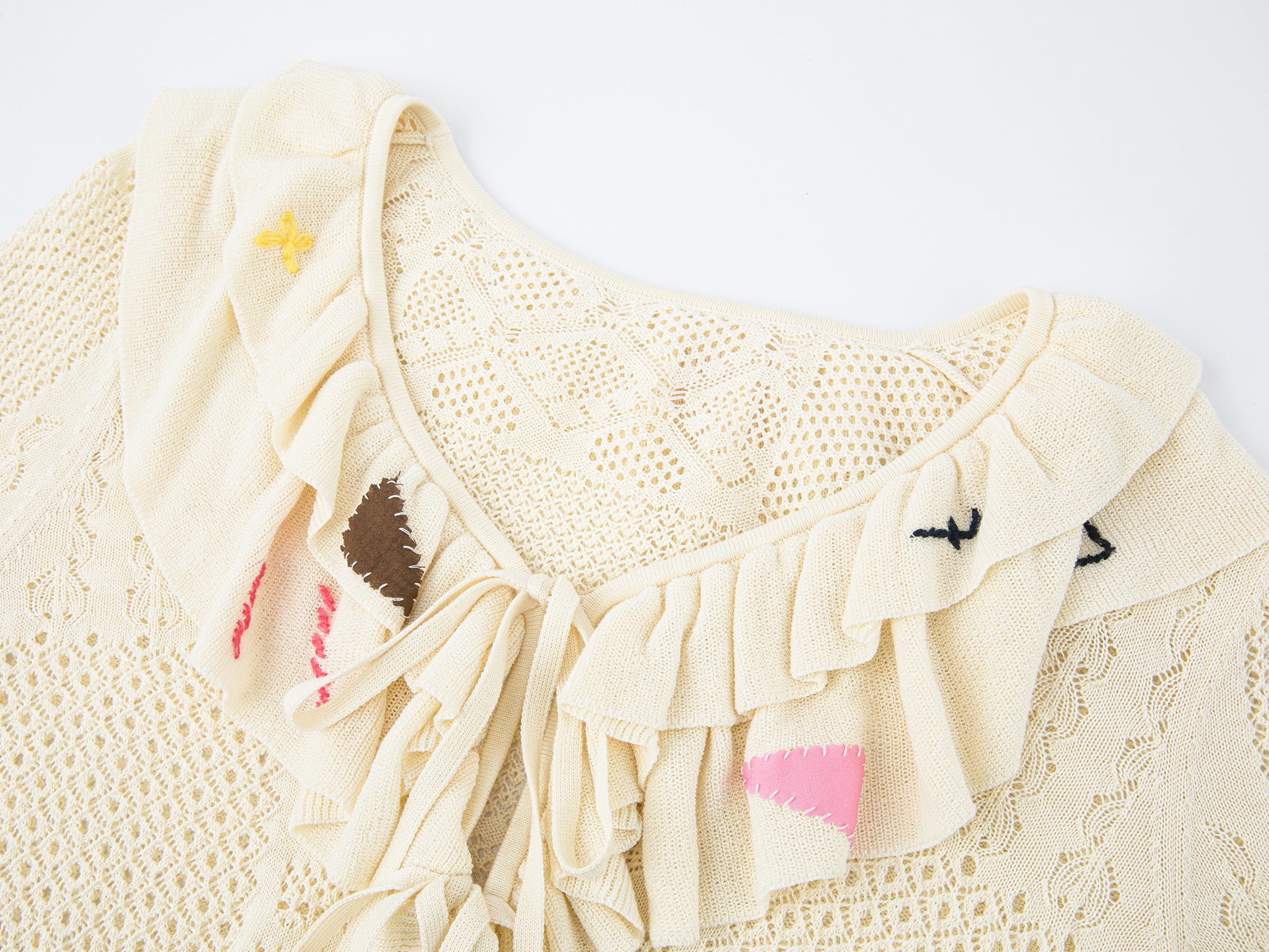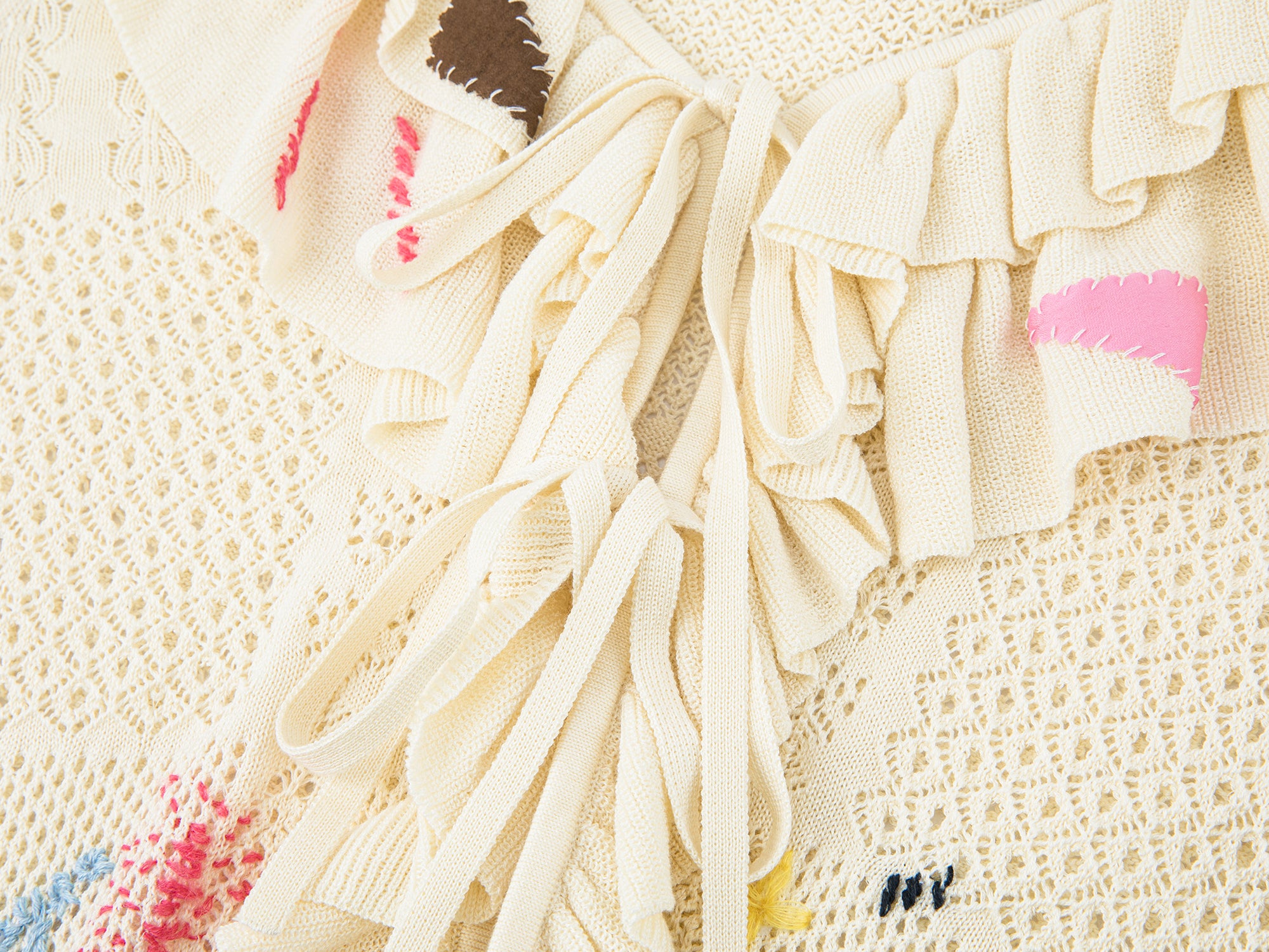 Uses various openwork stitches to build texture. Hand-sewn patches along the front and ruffles add layered dimension.