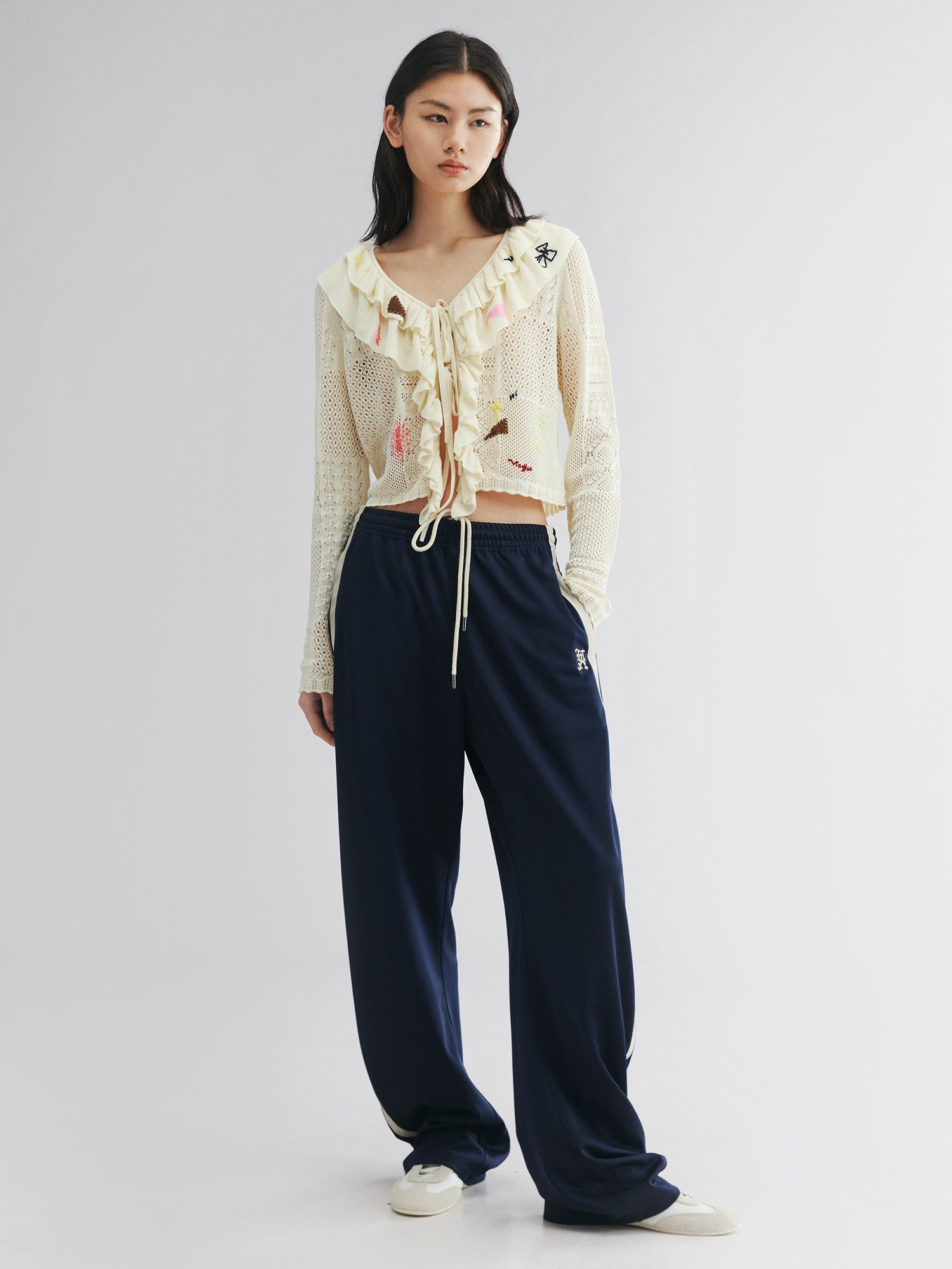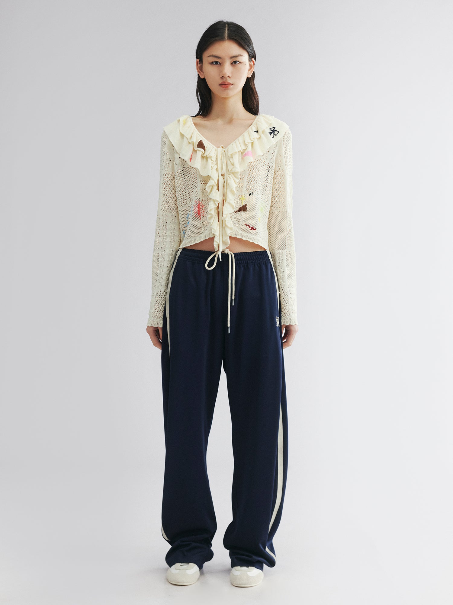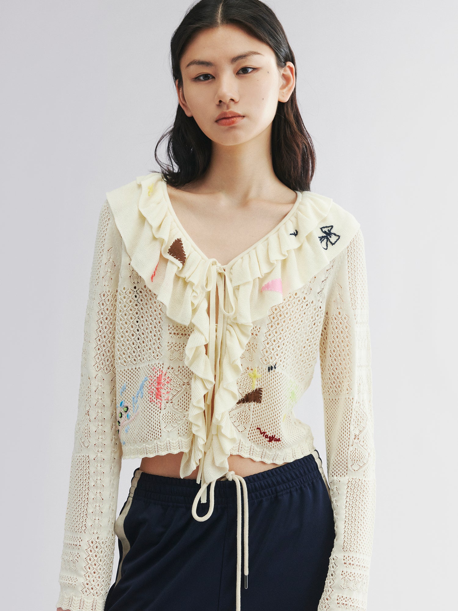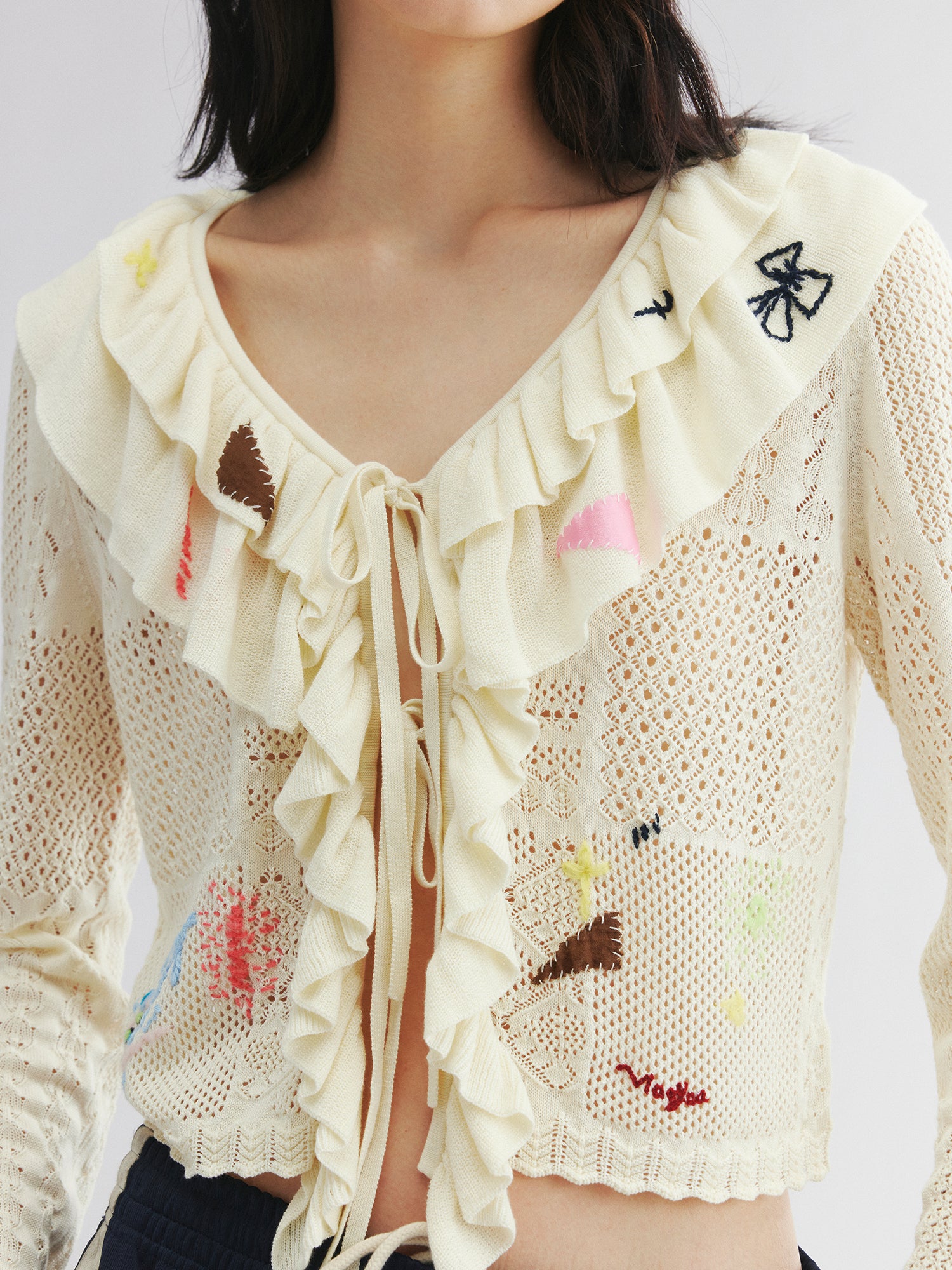 Handcrafted patch cardigan with ruffled edges