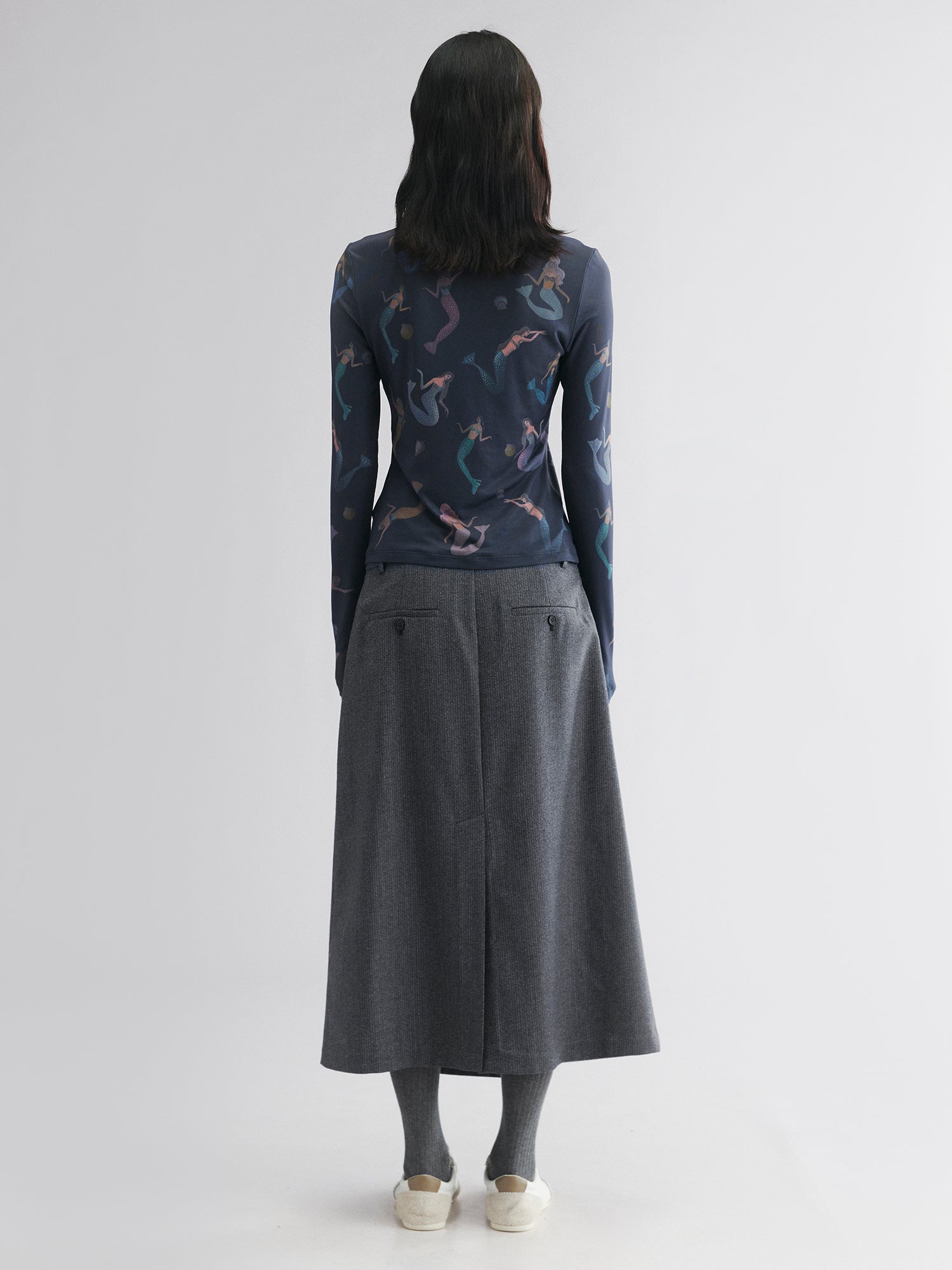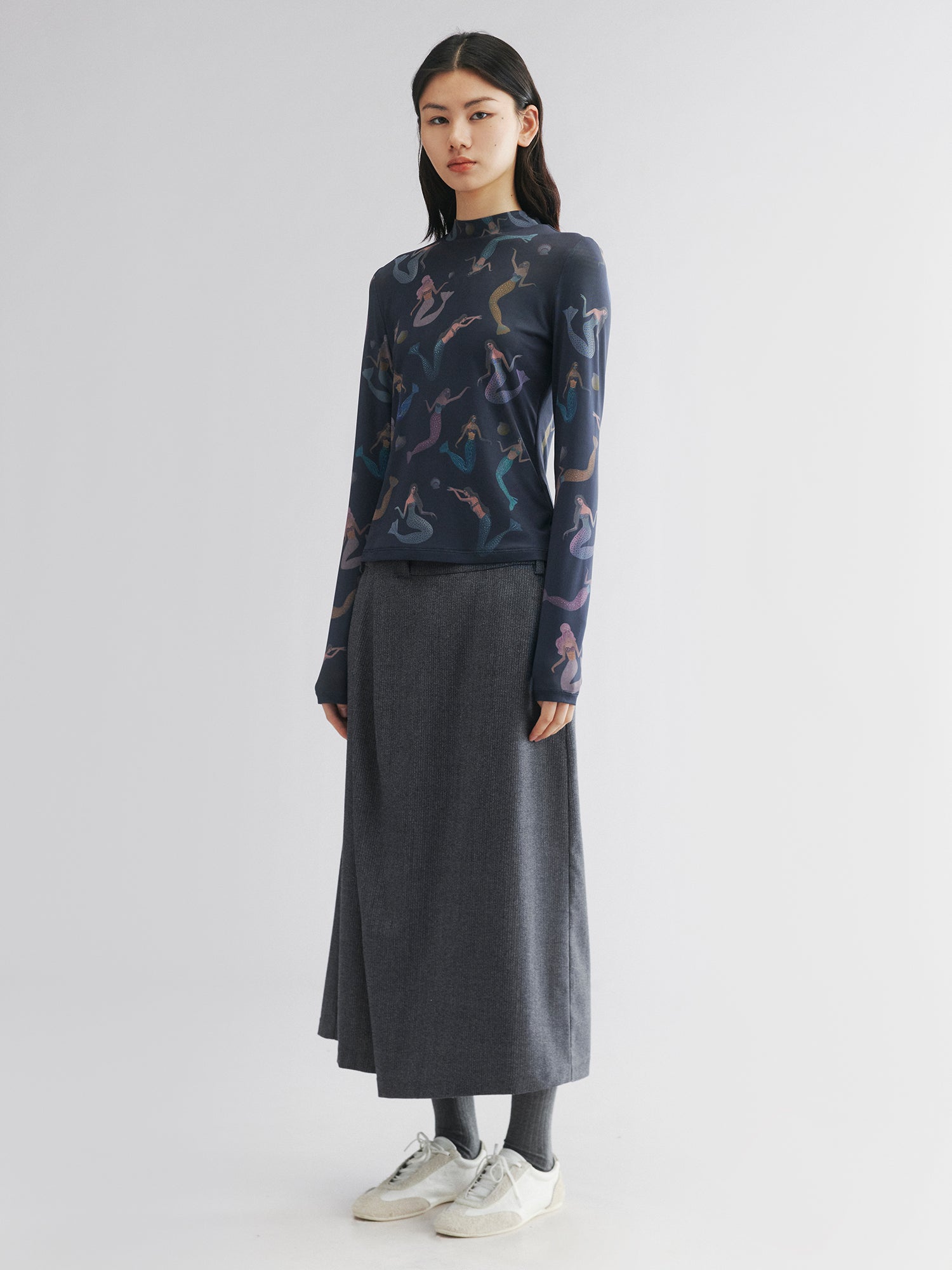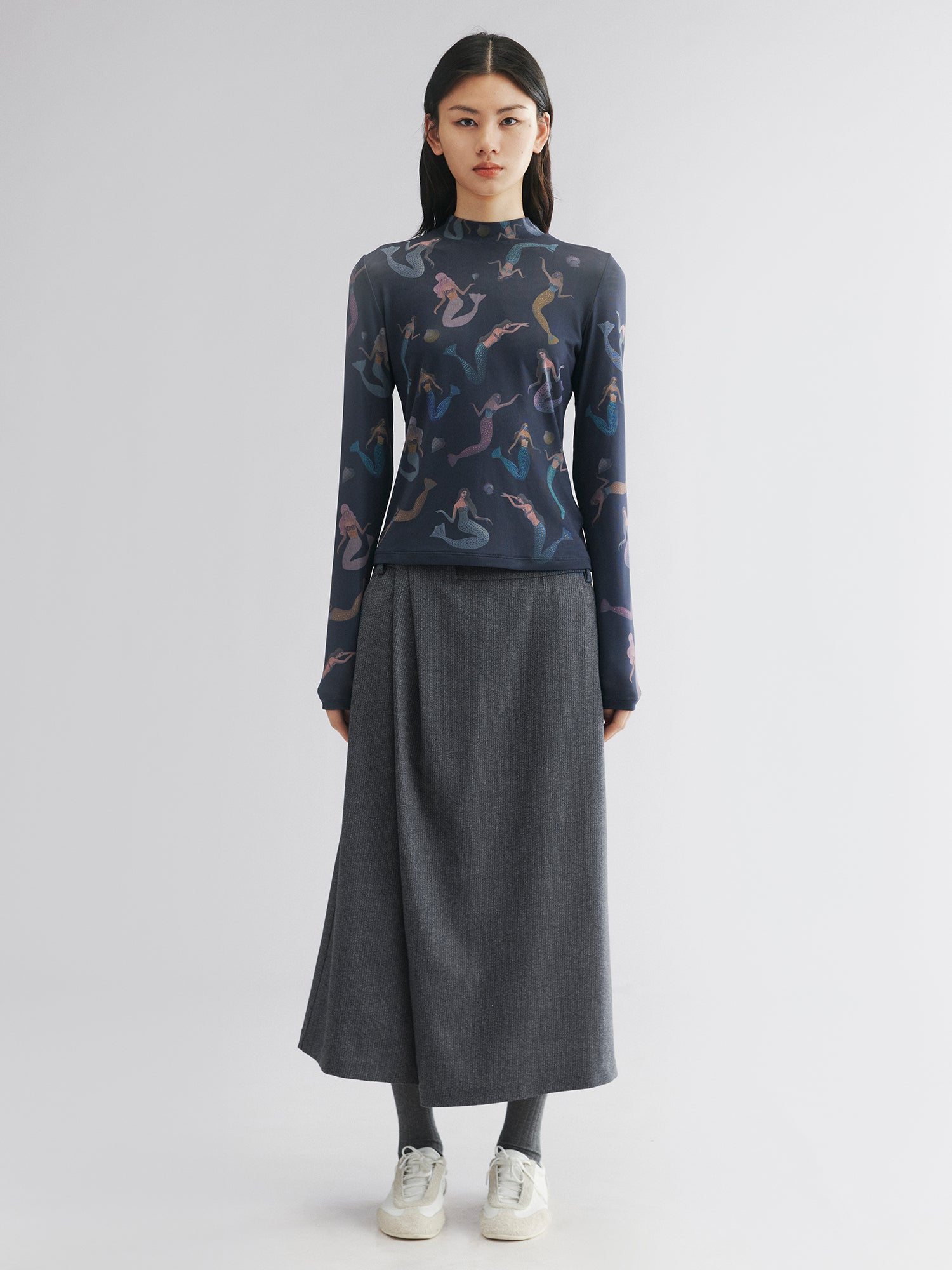 Merges fantasy mermaid motifs with a dark grey mesh tee for a dreamy layered look full of youthful energy.