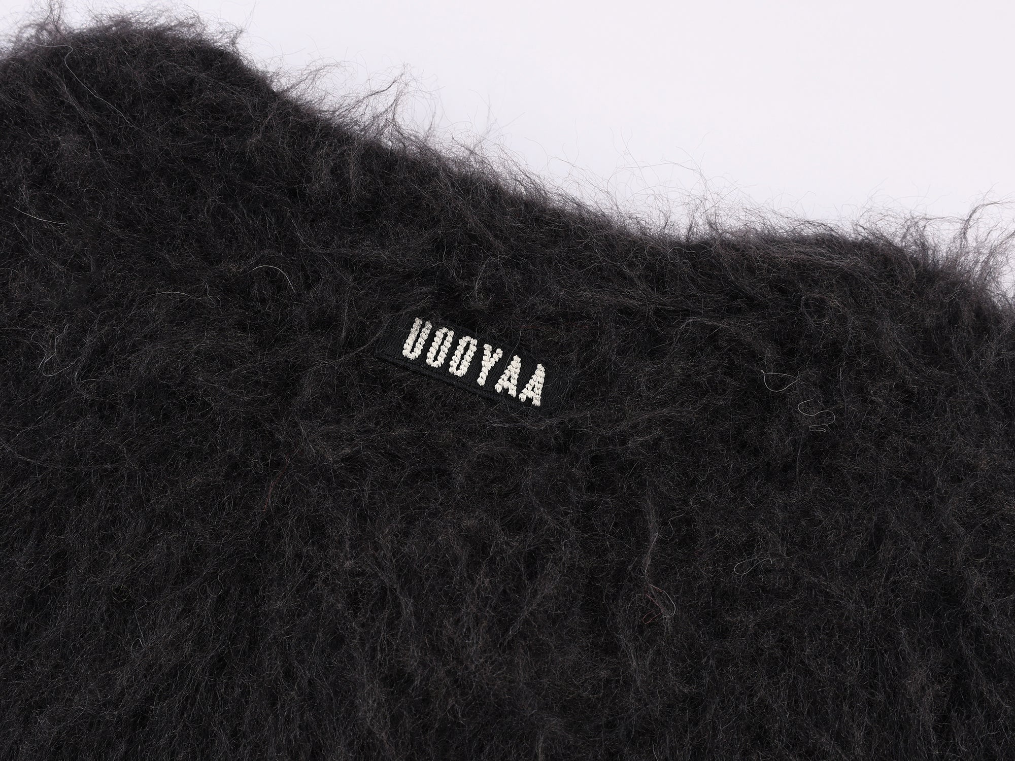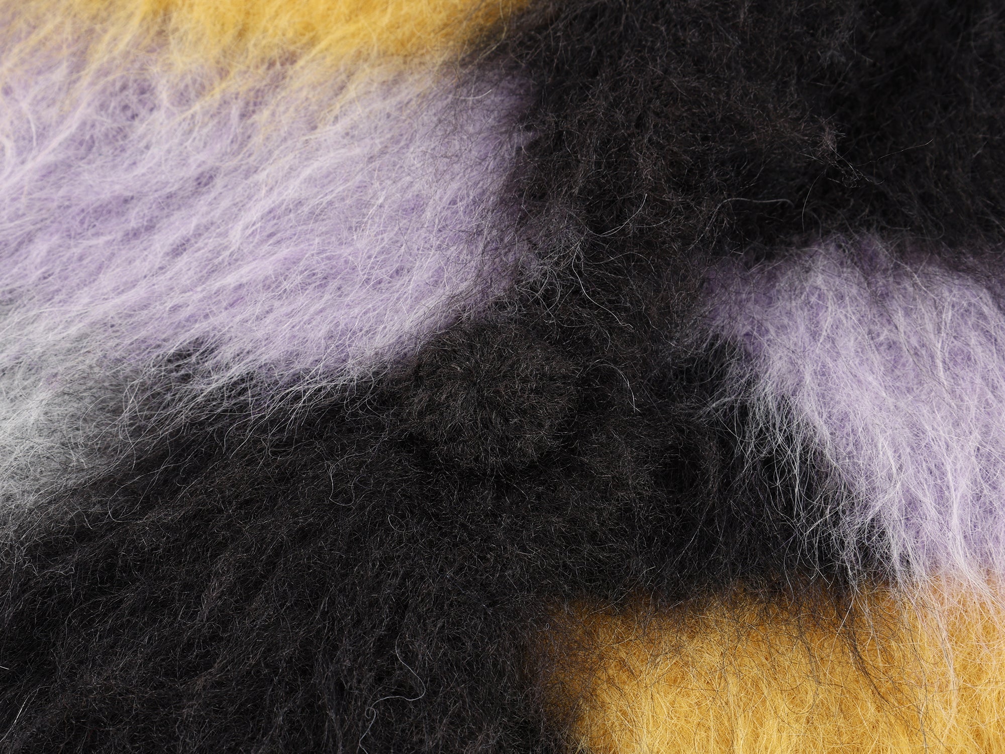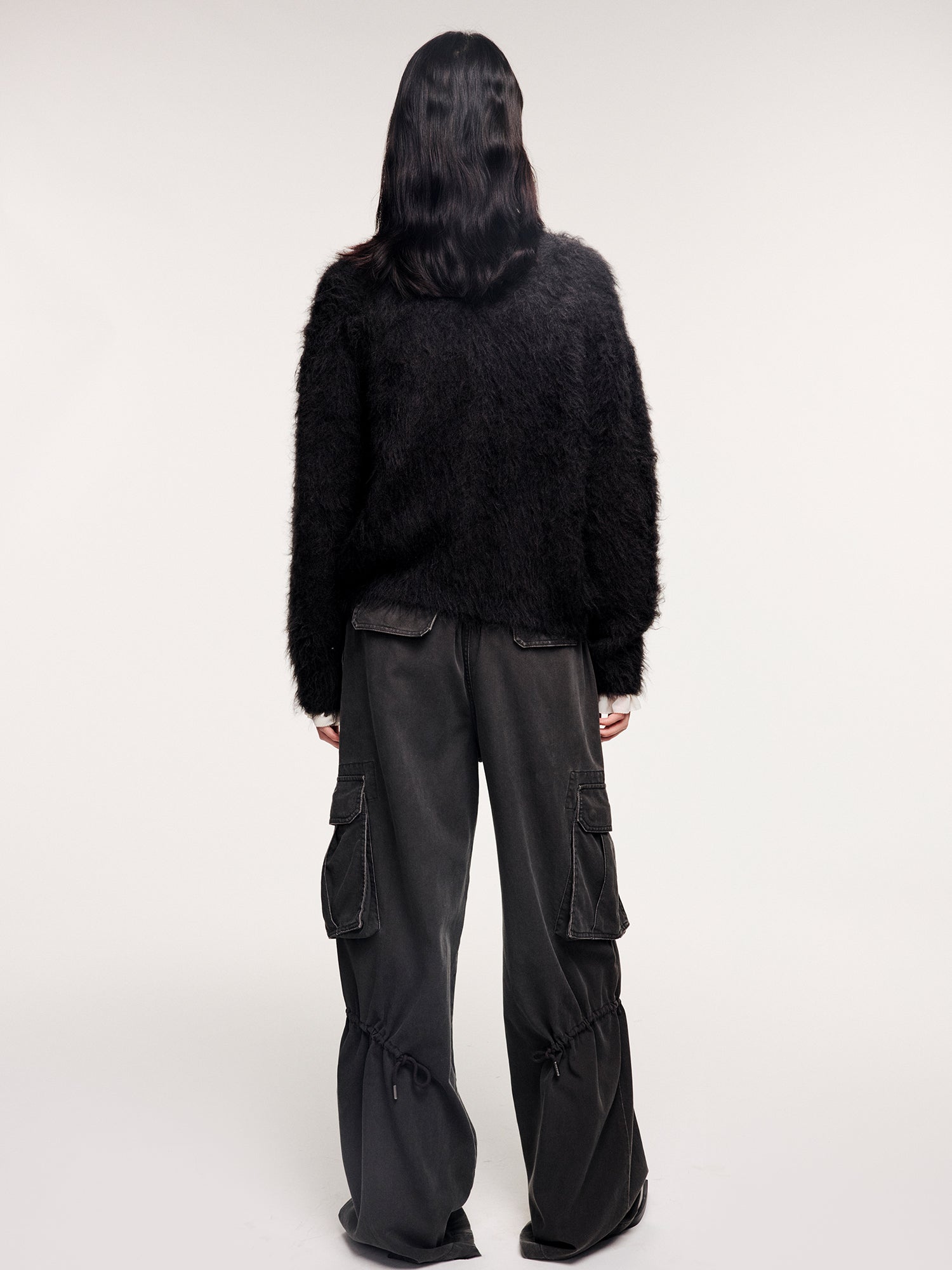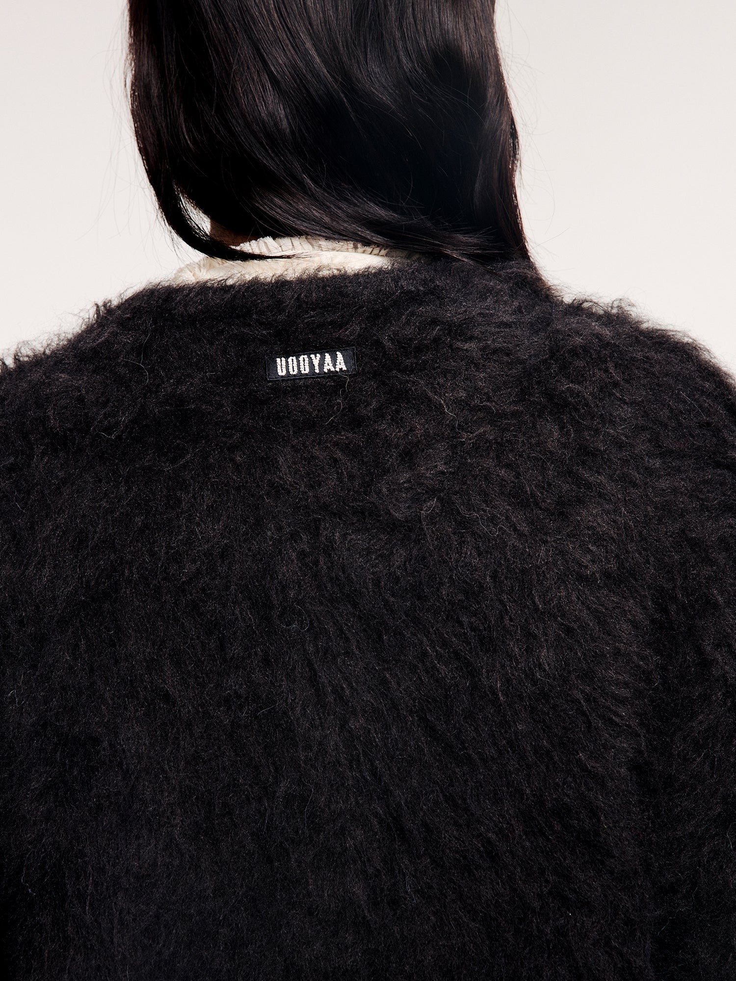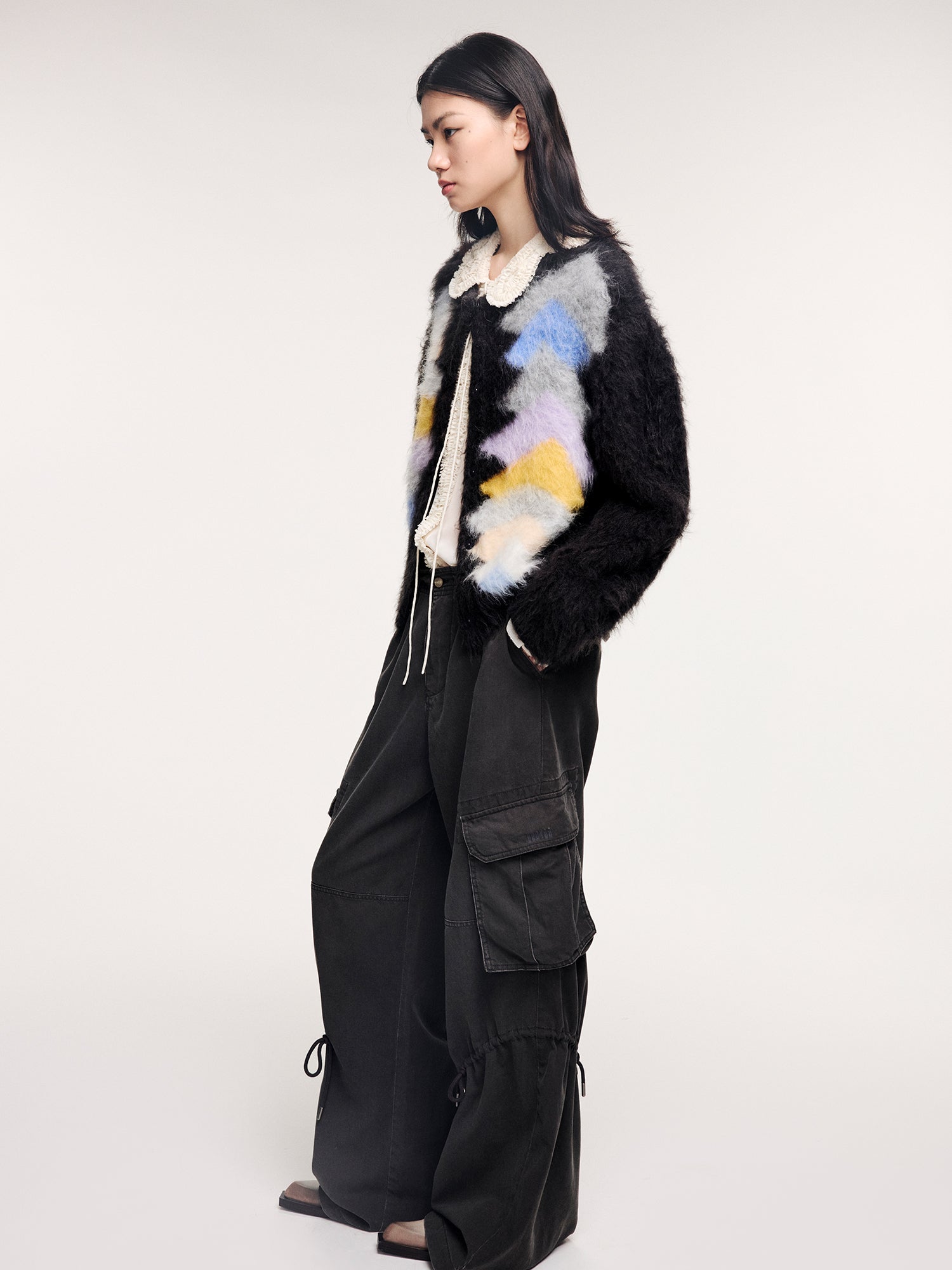 The color blocks on the cardigan are arranged irregularly and finished with a brushed knit technique, giving it a soft, plush texture and dreamy youthful look.