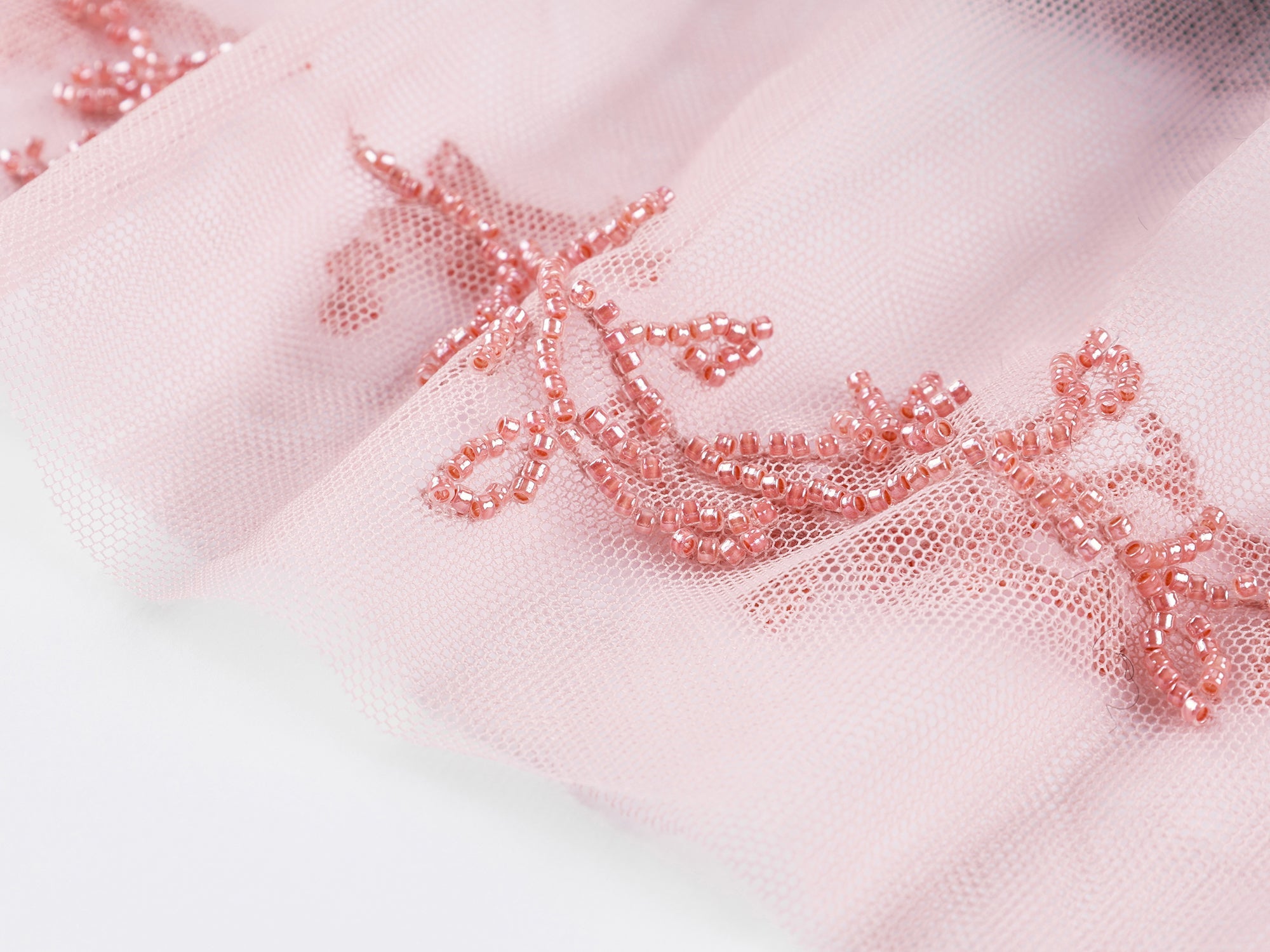 The tulle skirt is decorated with small bead embroidery, combining delicate beads and mesh for layered richness and a refined luxurious feel.Fabric: