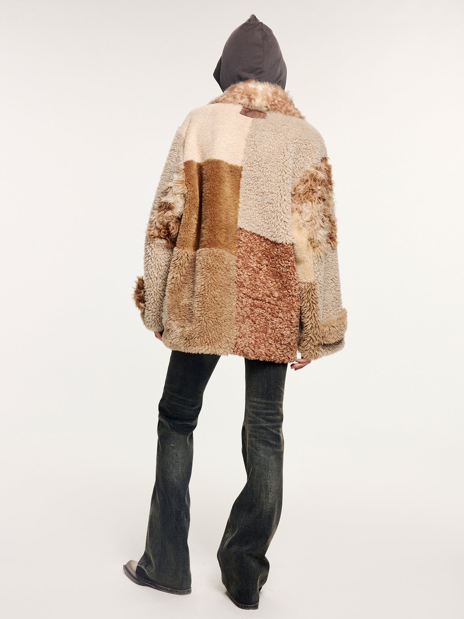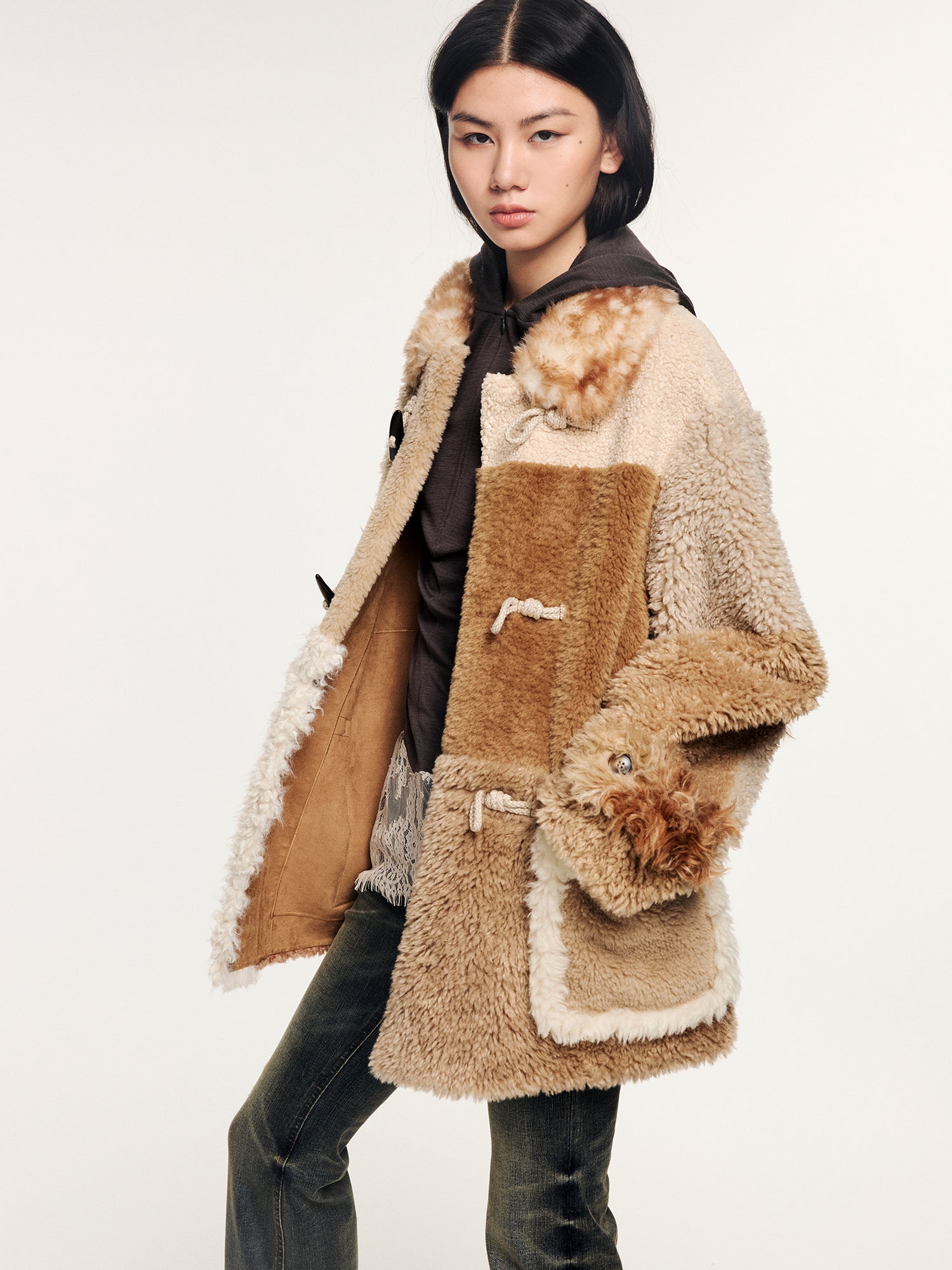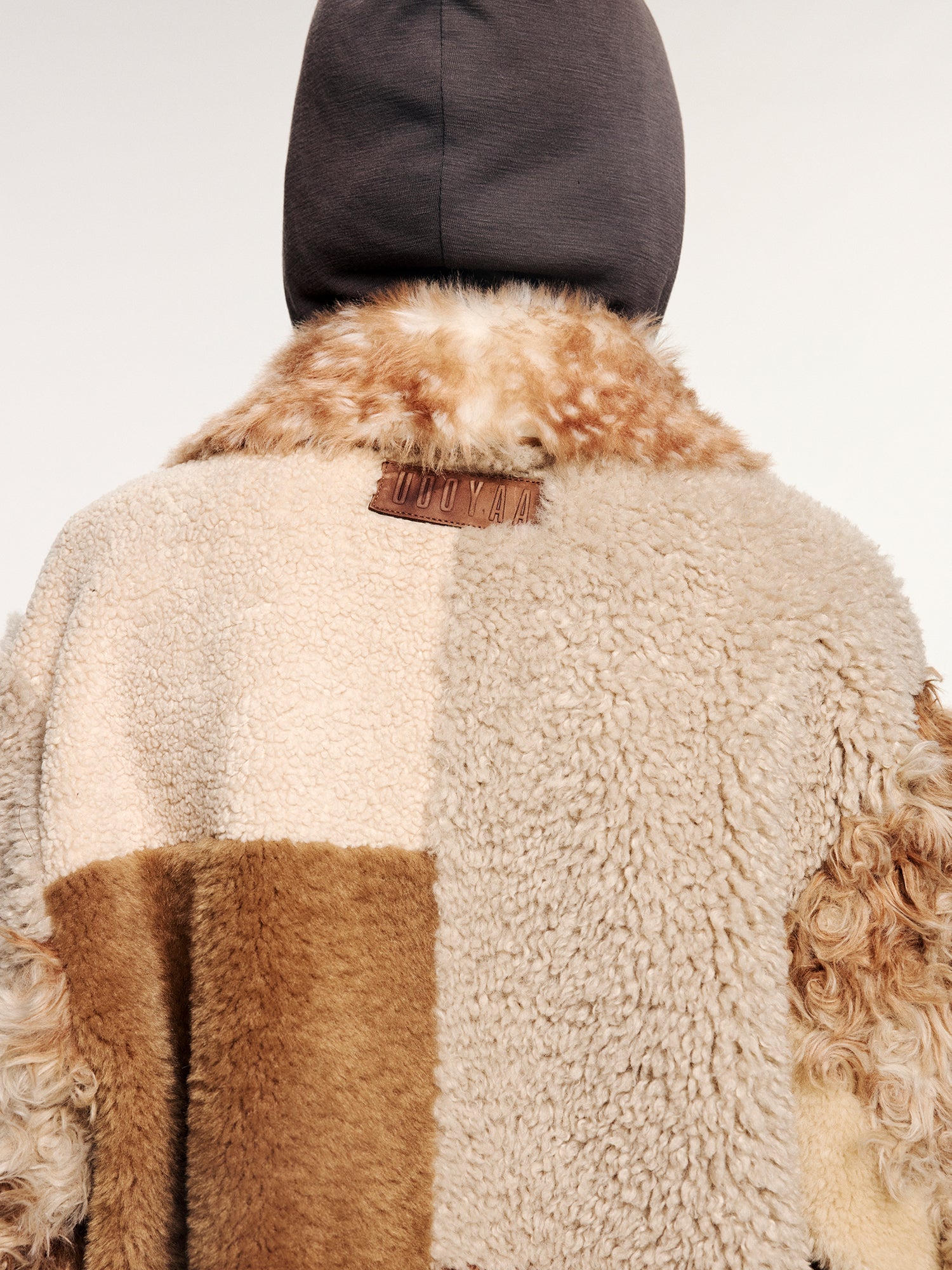 This playful fisherman's coat features 12 textured faux furs in patchwork form, adding richness and a fantasy-like presence.