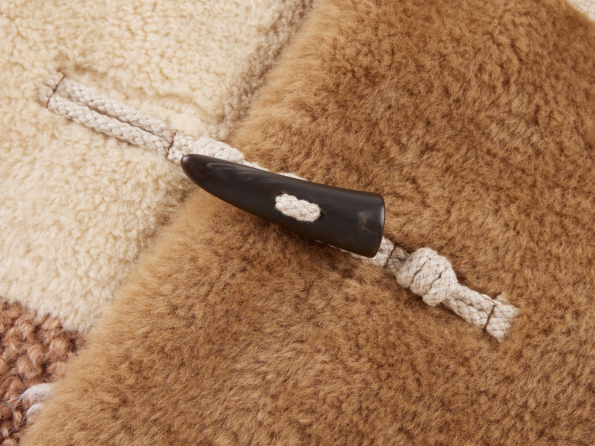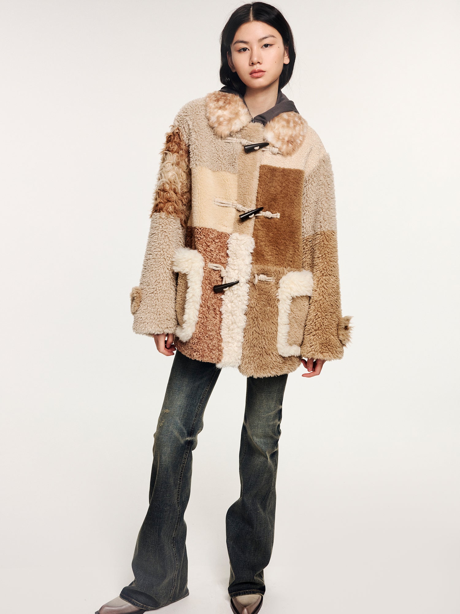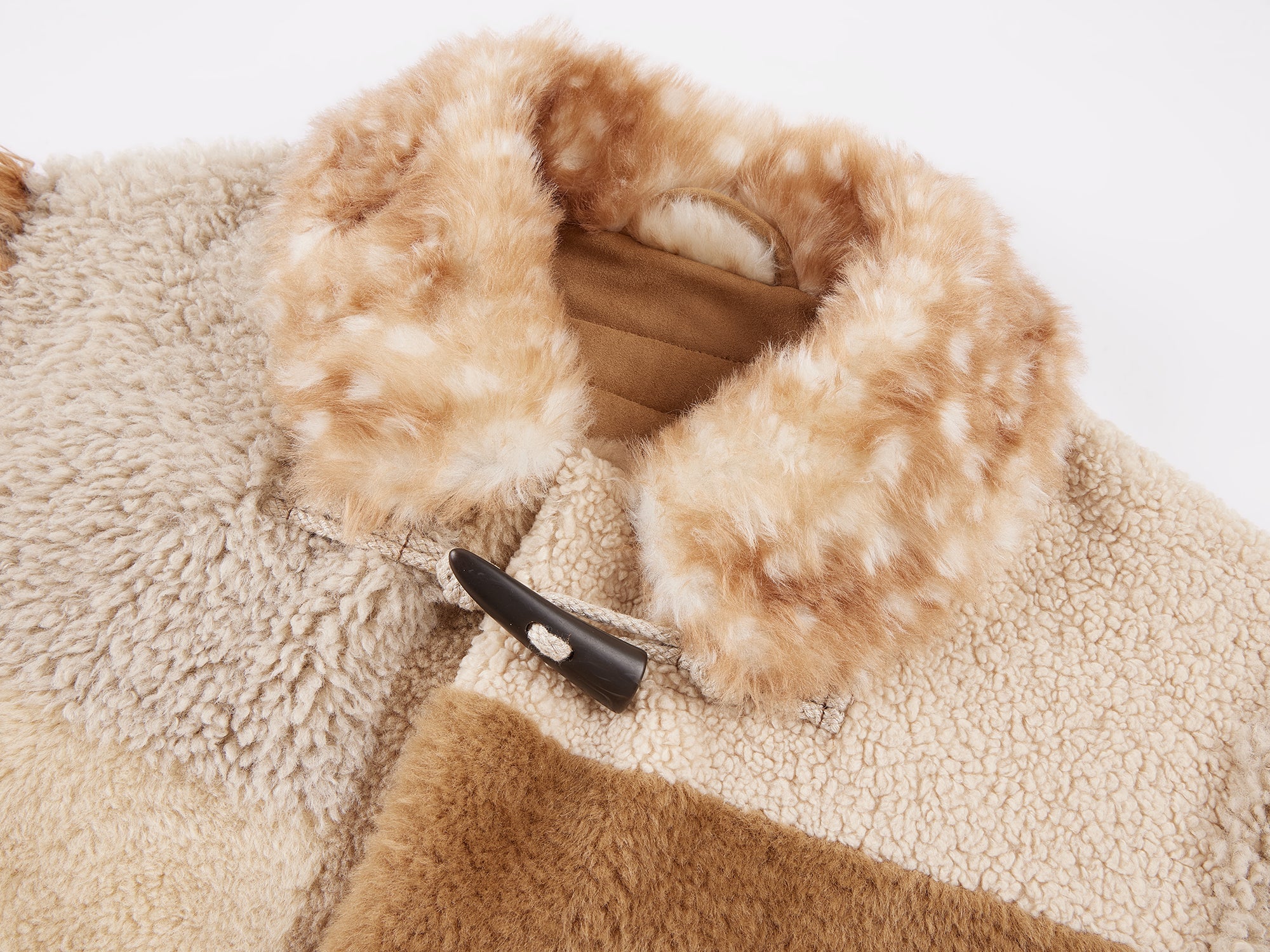 This playful fisherman's coat features 12 textured faux furs in patchwork form, adding richness and a fantasy-like presence.