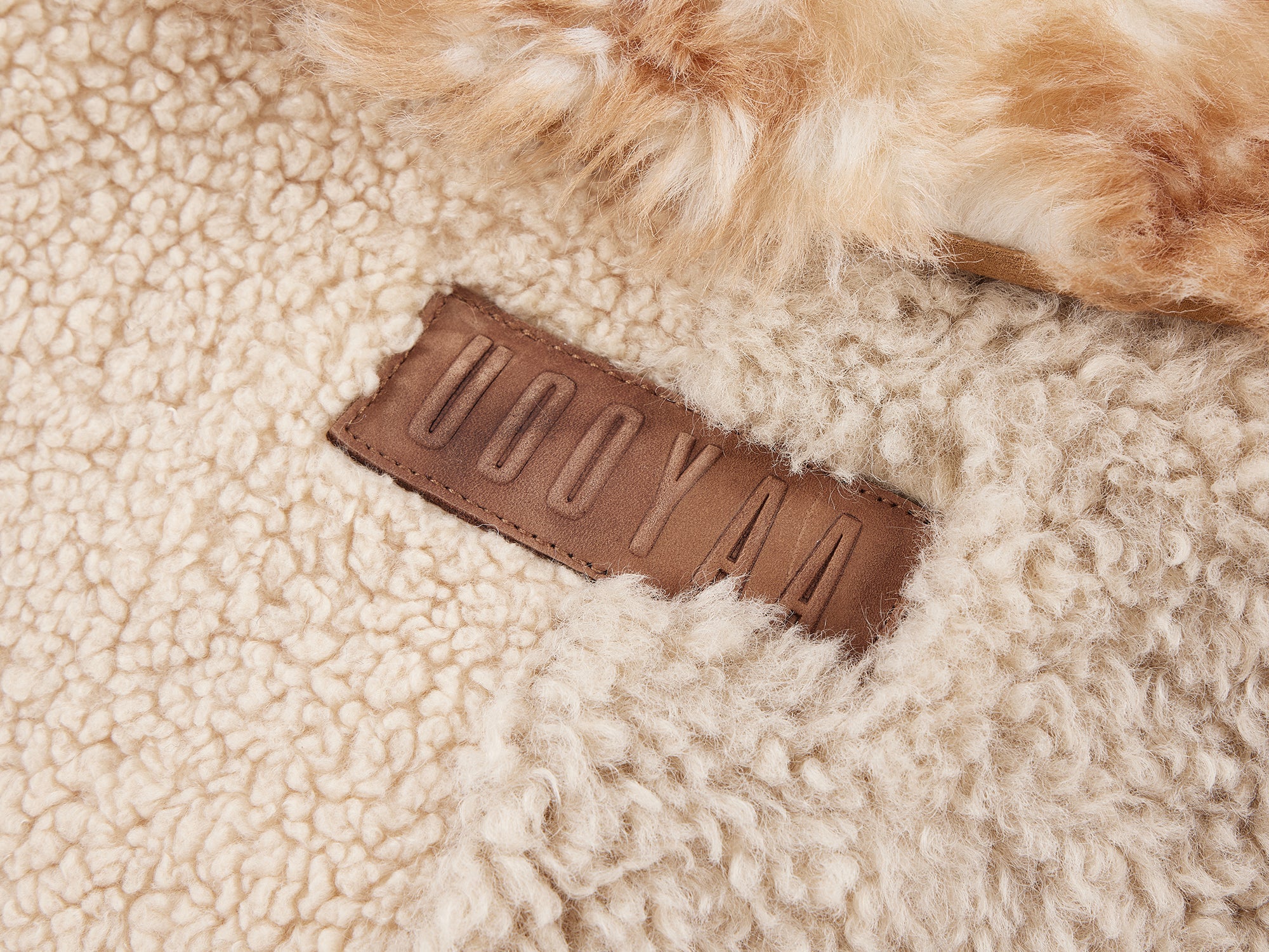 Irregular patchwork using 12 types of textured furry fabrics highlights luxury and craftsmanship.