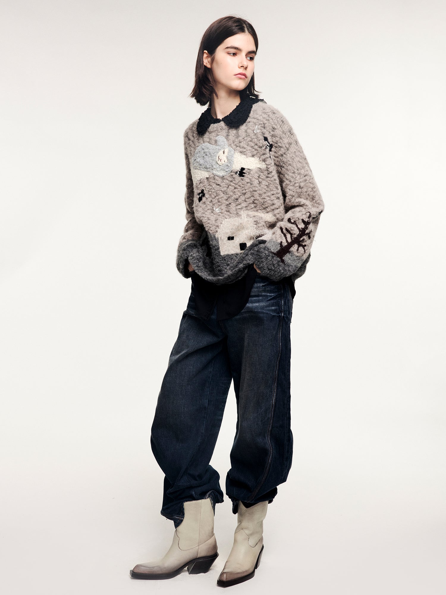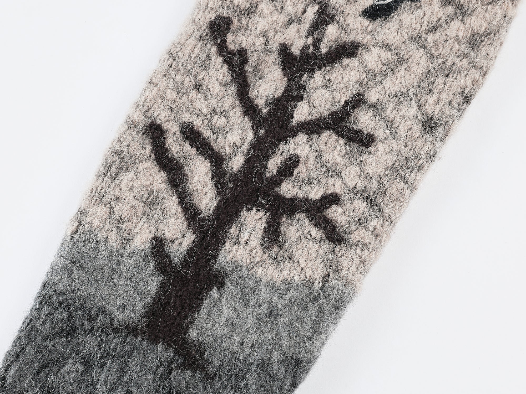 Crafted from wool-blend novelty yarn with intarsia knitting, layered with lamb appliqu¨¦ and embroidered birds and trees. A warm piece with rich vintage detail.