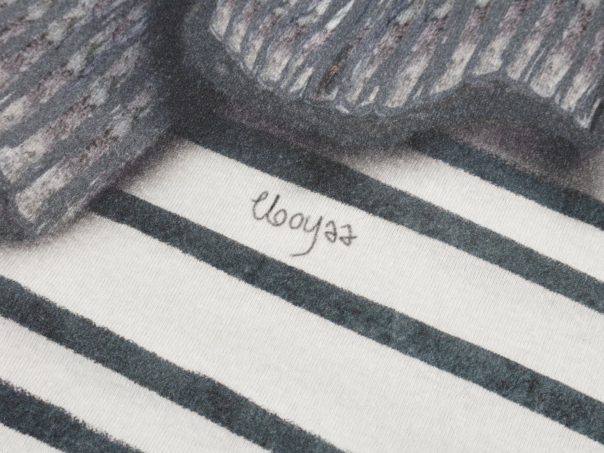Uses hand-drawn style print to recreate the look of a vintage Fair Isle sweater draped over the shoulders. It presents a playful everyday vibe in an artistic way with a laid-back, relaxed feel.
